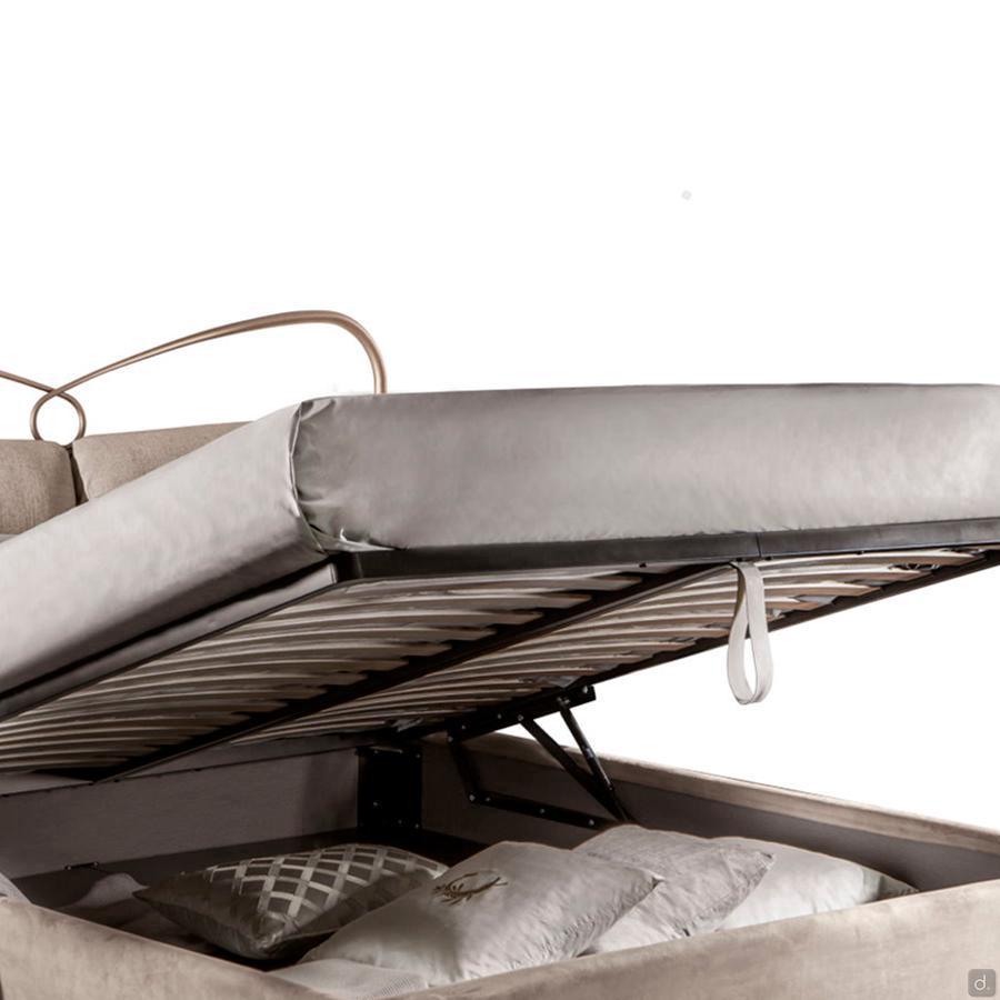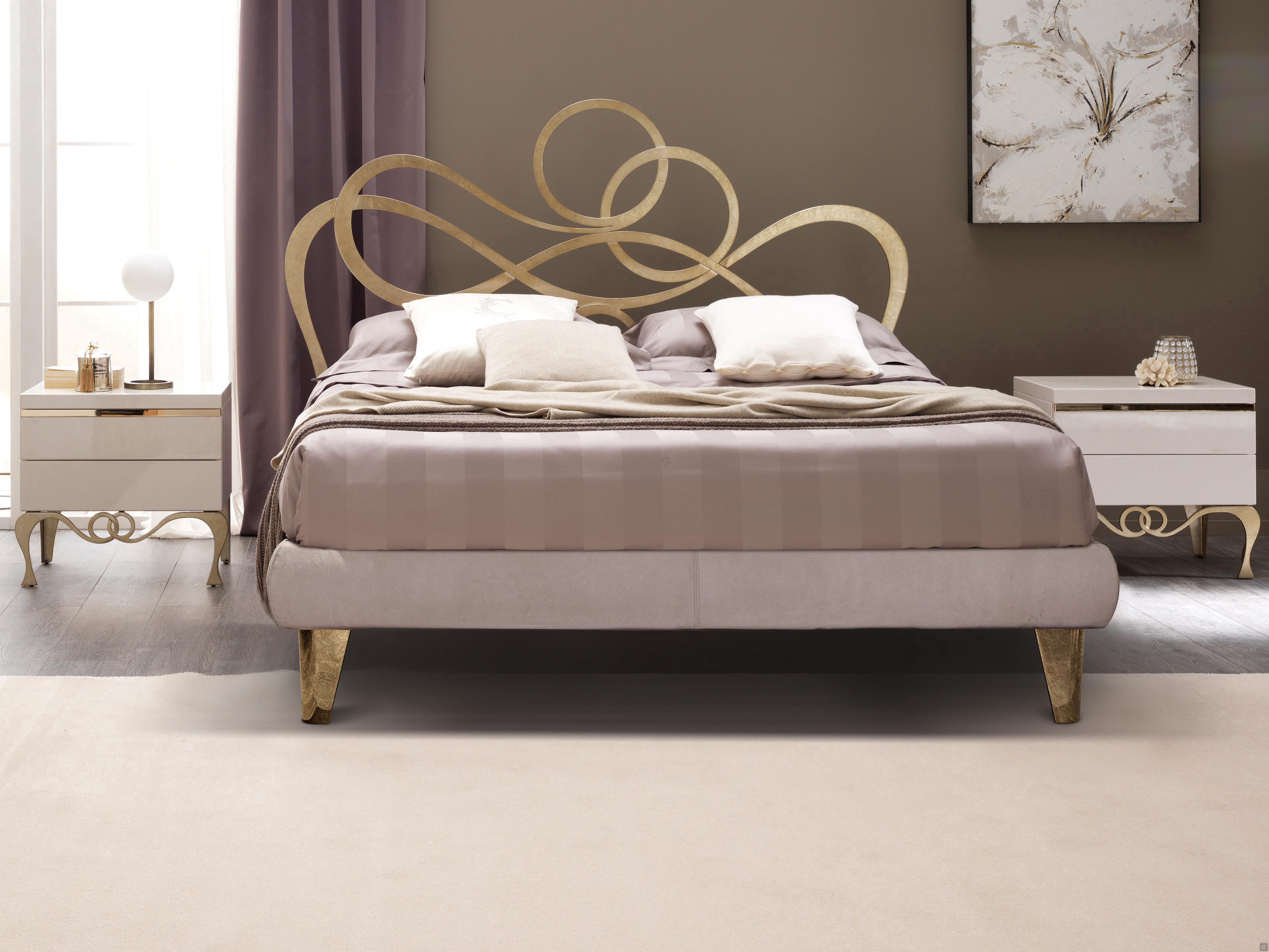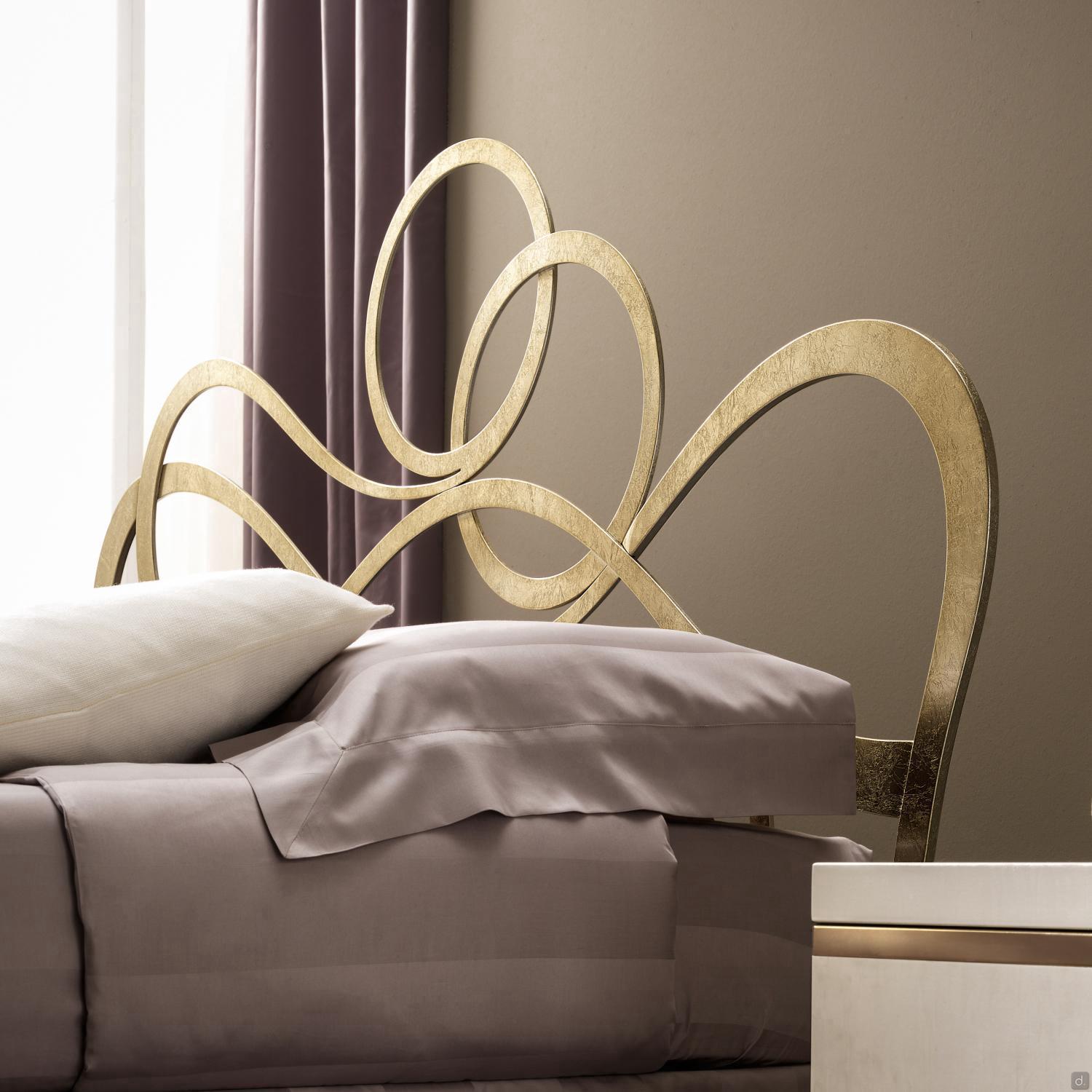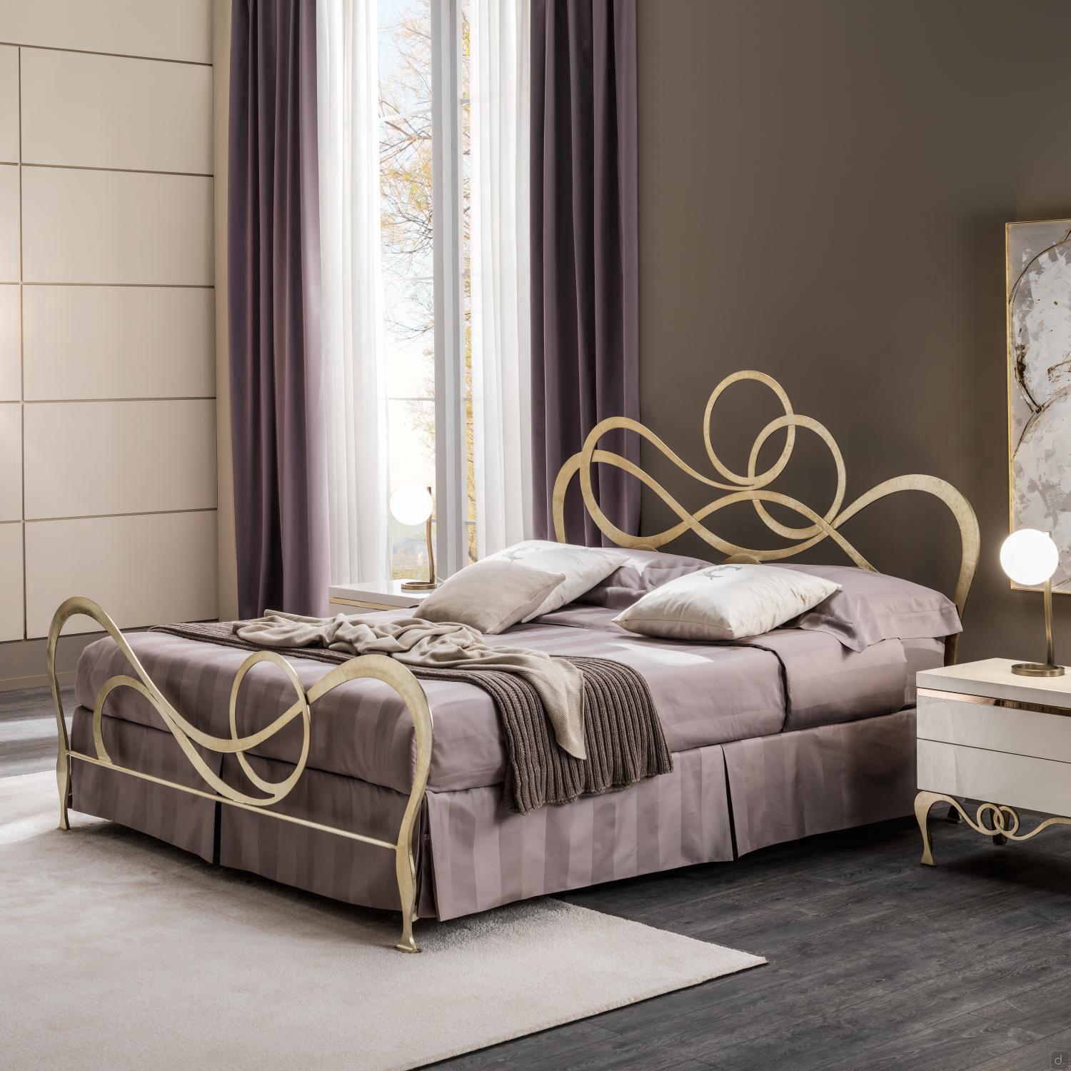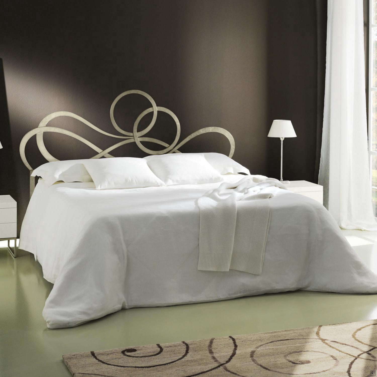 J'Adore Doppelbett aus Eisen mit dekorativem Kopfteil und Fußteil in geschwungenen und harmonischen Linien, welches in modernem Stil neu erfunden wurde. überarbeitet wurde. Die Struktur besteht aus lasergeschnittenem, flachem Metall, mit Drahtschweißnähten und vollständig von Hand polierten und bearbeiteten Oberflächen. In der gepolsterten Version hat das Bettgestell einen inneren Holzkern, der mit Kunstleder oder Kunstleder überzogen ist. Die vorderen Füße sind aus Aluminiumguss gefertigt und haben eine charakteristische eckige Form. J'Adore ist ein modernes und ausbalanciertes Bett: Die Spiralen, die das Kopf- und Fußteil zieren, sind weich und ausgewogen und geben dem Bett einen eleganten und romantischen Aspekt.