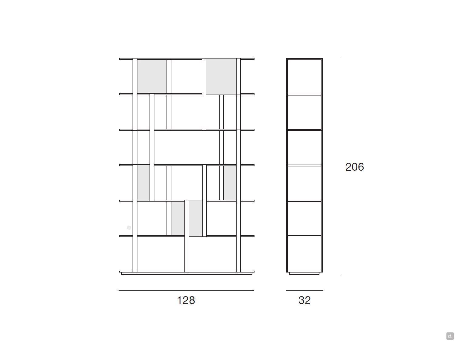 Die Modularität des Bücherregals ermöglicht es, mehrere Elemente nacheinander zu kombinieren, um eine große, koordinierte Struktur zu erhalten, die als Raumteiler in einem offenen Raum oder, traditioneller, als großes Wandregal in einem großen Wohnzimmer verwendet werden kann.