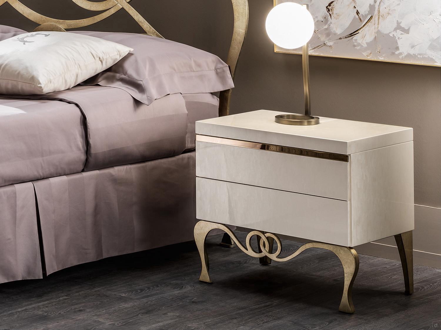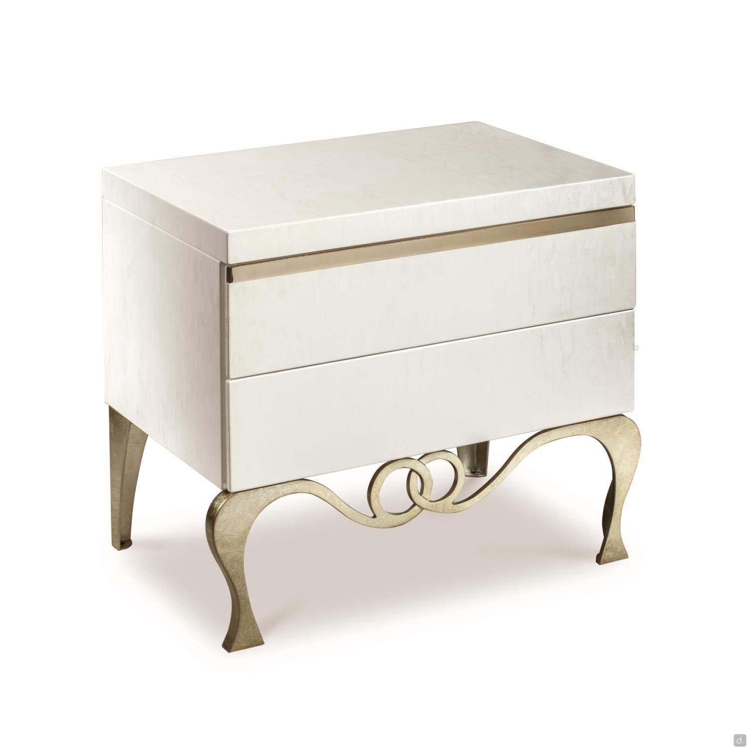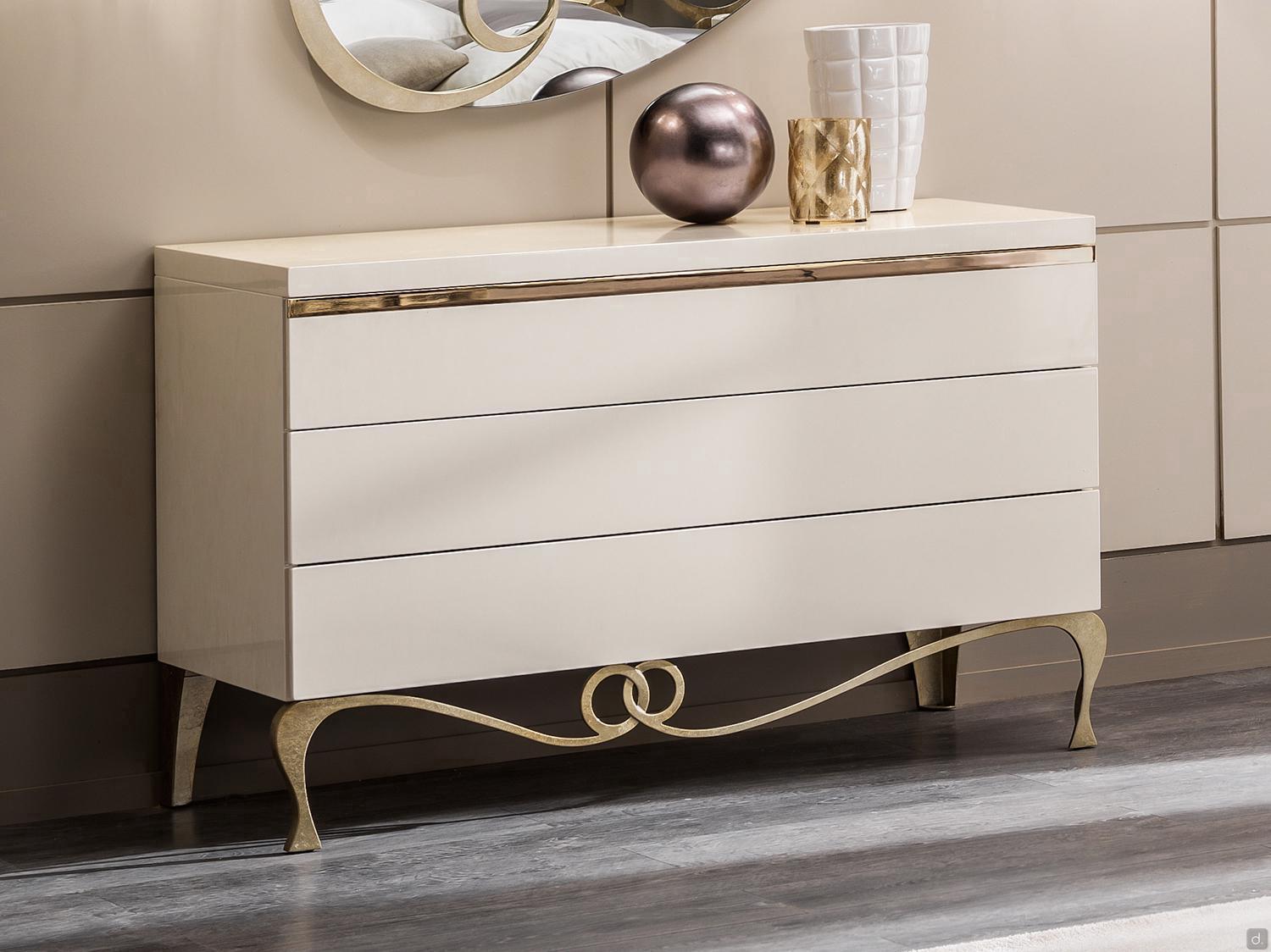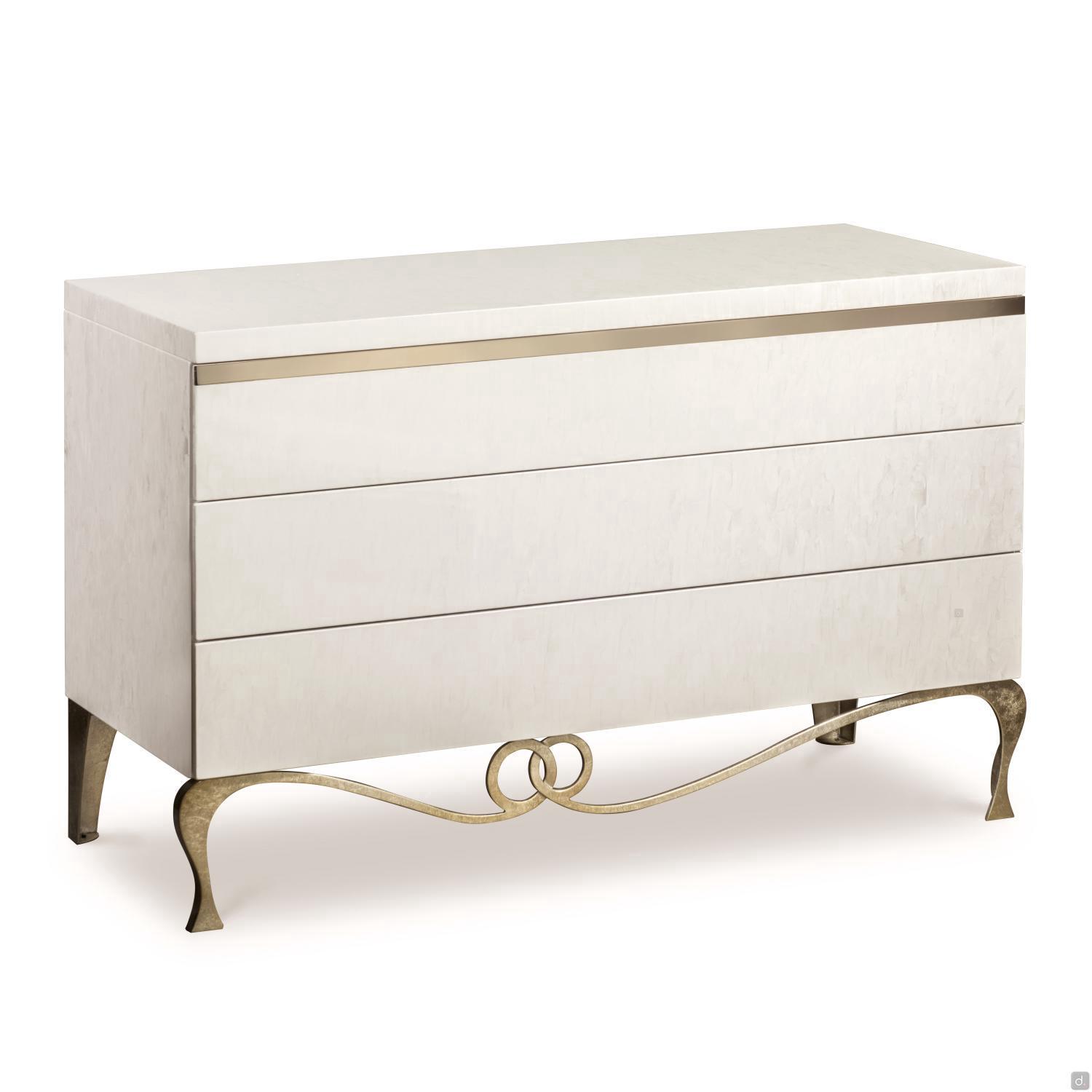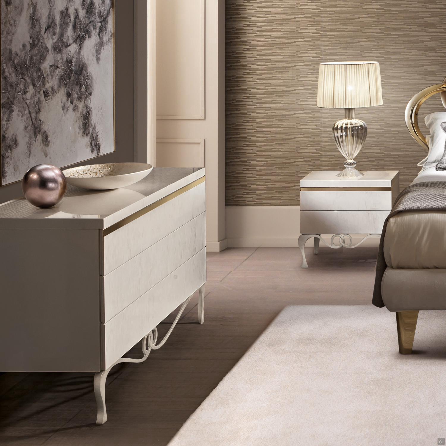 J'Adore von Cantori ist ein Nachttisch mit Schubladen und Füßen, der auch in der Ausführung als Kommode mit 3 Schubladen erhältlich ist.Der lackierte oder gespachtelte Holzrahmen ist mit Schubladen mit Vollauszug und Schließhilfe ausgestattet. Die Füße sind aus verziertem Eisen, ebenso wie der Einsatz in der ersten Schublade.Eine kleine Gruppe, die perfekt die Essenz der strukturellen Linien mit der romantischen Metalldekoration, die sie unterstützt, verbindet.