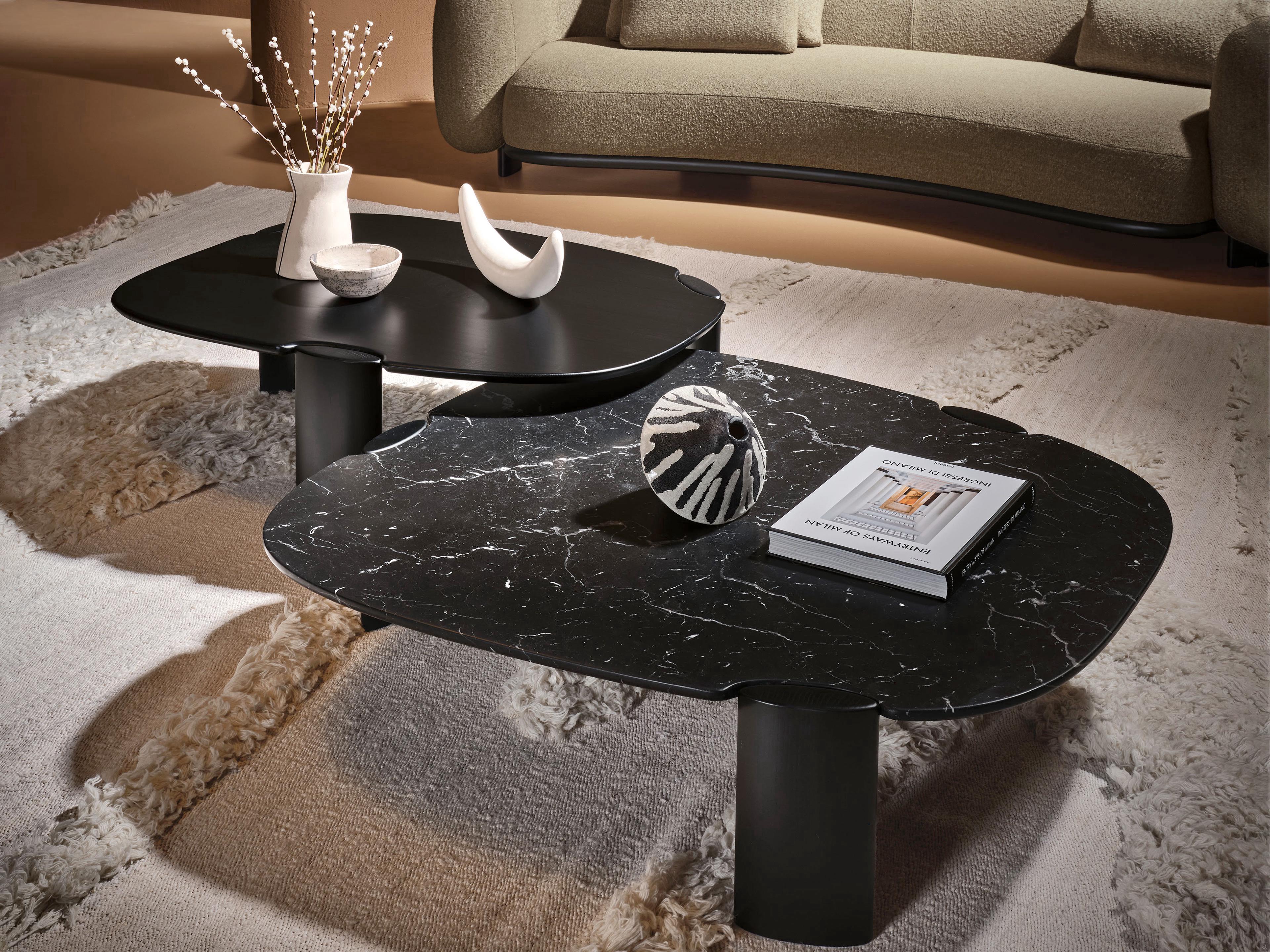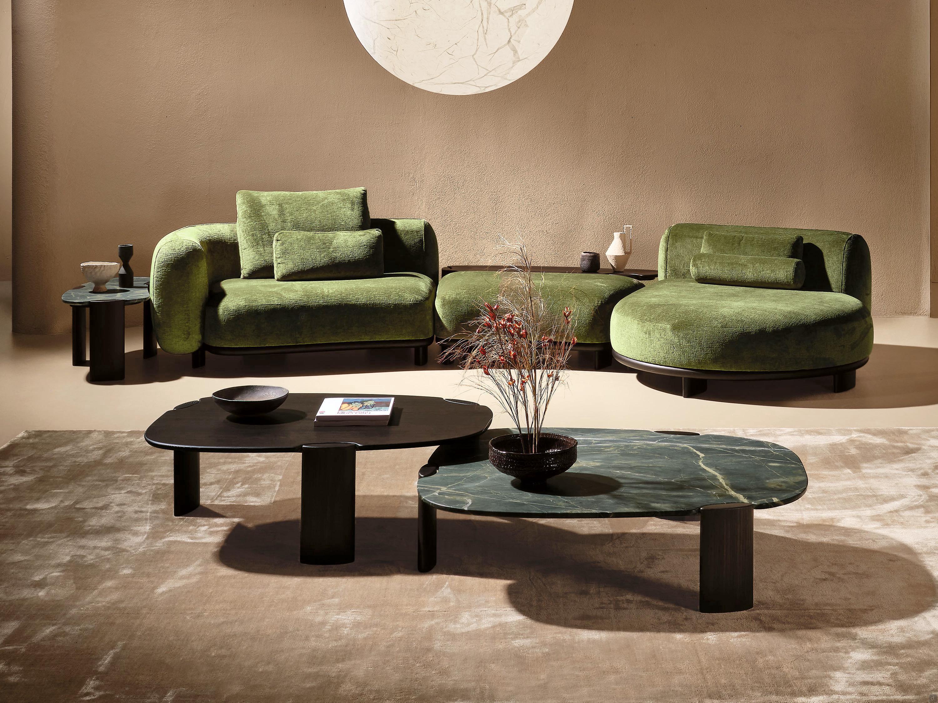 Reef ist ein niedriger Couchtisch für das Wohnzimmer, der Stil und Funktionalität vereint und hochwertige Materialien wie Marmor und Holz mit fließenden und geschwungenen Formen kombiniert. Die „Stützen” des Untergestells sind aus Eschenholz gefertigt, das auch beim Bücherregal derselben Serie zum Einsatz kommt und sich perfekt kombinieren lässt. Die rechteckige, leicht unregelmäßig geformte Tischplatte ist in wunderschönen Marmor- oder Holzvarianten erhältlich, die zum Untergestell passen und durch ihre Kanten aus Massivholz einen zusätzlichen Mehrwert bieten.Die drei angebotenen Höhen bieten eine beträchtliche Vielseitigkeit in der Verwendung und lassen sich in Abhängigkeit von der Breite der Platte sowohl vor als auch neben dem Sofa aufstellen, wobei die Möglichkeit, raffinierte Material- und Größenkombinationen zu schaffen, indem zwei oder mehr Elemente unterschiedlicher Höhe miteinander kombiniert werden, das Ganze noch aufwertet. Eine elegante Lösung, um das Wohnzimmer zu füllen und dabei die weichen und großzügigen Formen von Sofas und Sesseln „abzumildern”.
