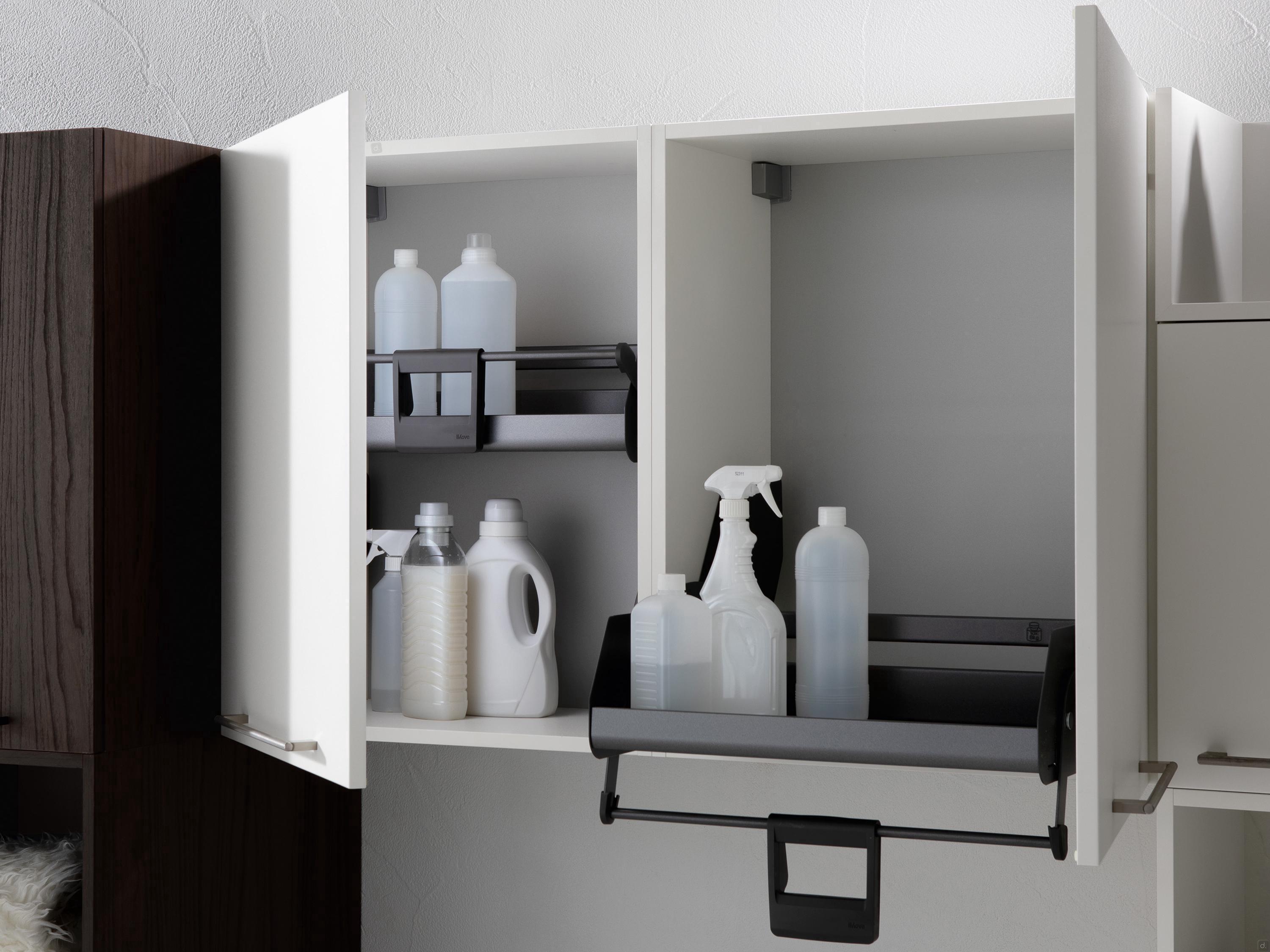 Oasis ist ein Oberschrank für Waschmittel mit nach oben zu öffnenden Flügeltüren oder nach oben öffnenden Türen.Die Oberschränke sind in 6 Breiten - von mindestens 30 cm bis maximal 90 cm - und in 5 Tiefen erhältlich: 20,8, 37, 50, 62 und 67 cm.Zusätzlich zu den Hängeschränken mit Innenböden bietet Oasis in der Version mit einer Breite von 60 cm, einer Höhe von 75 cm und einer Tiefe von 37 cm auch den Ausziehboden „i-move“, einen praktischen Mechanismus, der es ermöglicht, den Boden mit einer einfachen Bewegung komplett herauszuziehen. Auf diese Weise lassen sich die Regalböden auf eine ergonomische und bequeme Höhe absenken, um die im Oberschrank gelagerten Waschmittel zu entnehmen und zu verstauen.
