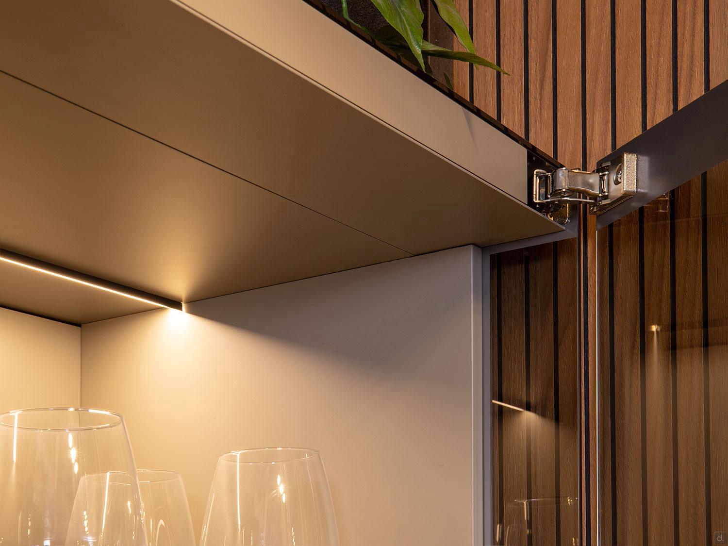 Drehtüren: Holzspanplatte mit Melamin Beschichtung (Klasse E1 - niedrige Formaldehyd-Emission), Holz oder MDF 2,2 cm stark. Ausgestattet mit Push-Pull-Öffnung und Scharnieren mit sanftem Schließmechanismus. Groove Holztür aus 2,2 cm starkem schwarzem MDF mit 0,3 cm breiten eingefrästen Rillen im Abstand von 1,7 cm.