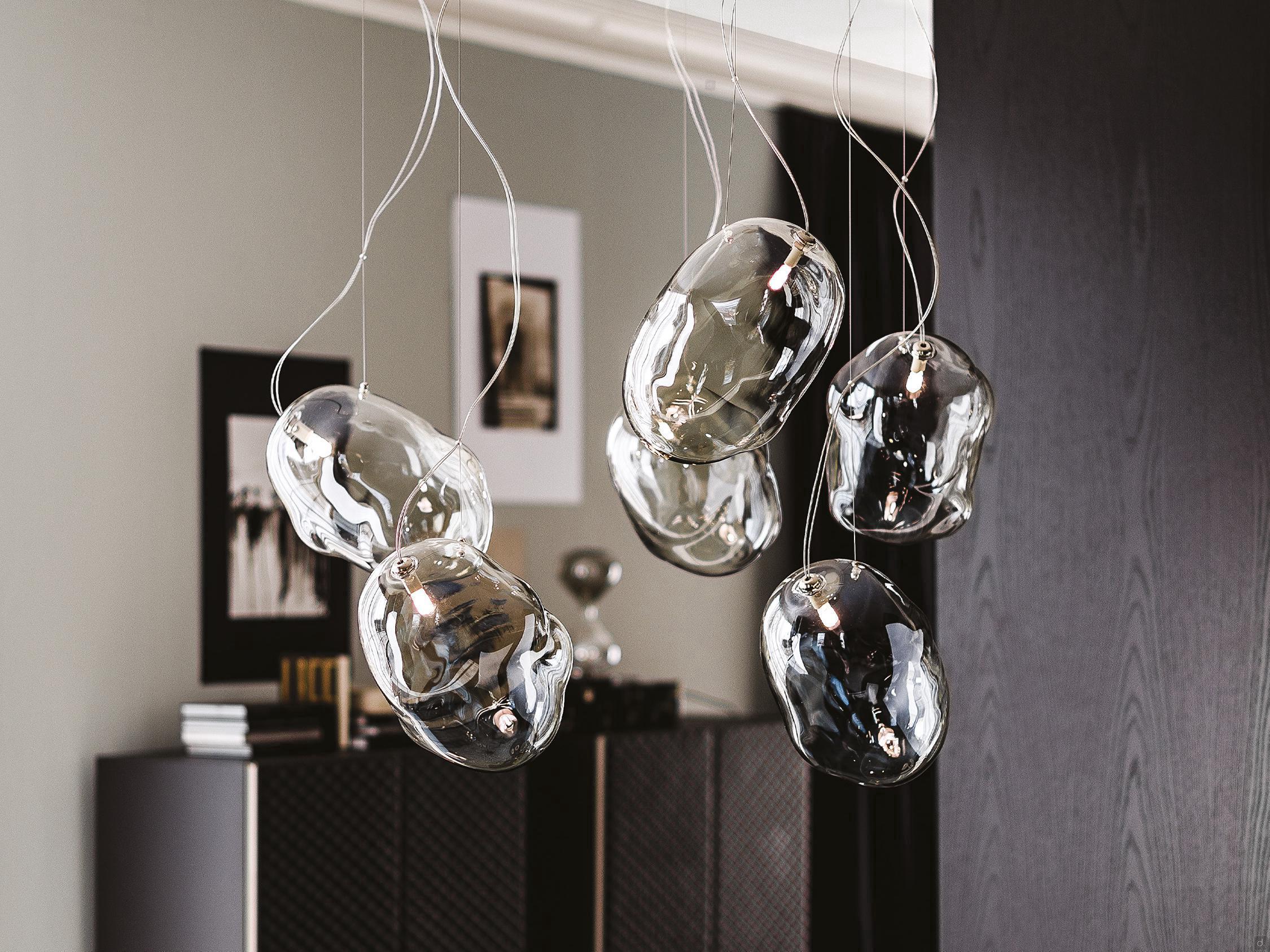 Cloud von Cattelan ist eine Pendelleuchte unregelmäßig geformtem Glas von Cattelan, die einzeln oder in Kompositionen erhältlich ist, auch als Nachttischmodell. Die Lampenschirme haben eine unregelmäßige Tropfenform und bestehen aus irisierendem Kristallglas (transparent, mit farbigen Schattierungen) oder aus Rauchglas. Das Gestell aus satiniertem Nickel ist als einzelner Lampenschirm oder als Komposition von 2/6 oder 7/12 Lampenschirmen erhältlich. Cloud ist eine Designer-Lampe, ideal für die Einrichtung eines Raumes im originellen Stil.