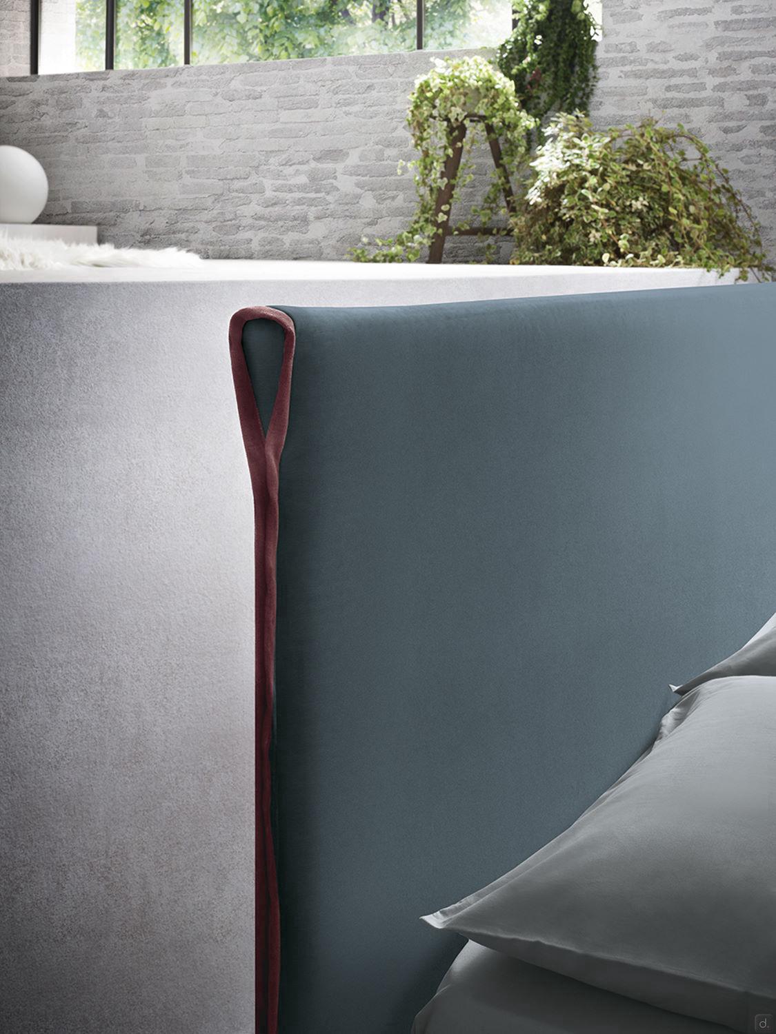 Beidseitig verwendbares Kopfteil: das Bett hat einen Rundumbezug. Das Hinterteil hat denselben Bezug wie die Vorderseite, um eventuell auch eine Platzierung mitten im Raum zu ermöglichen. Der Double-Face-Bezug kann also auf beiden Seiten eingesetzt werden, indem der Bezug abgenommen und gewendet wird.