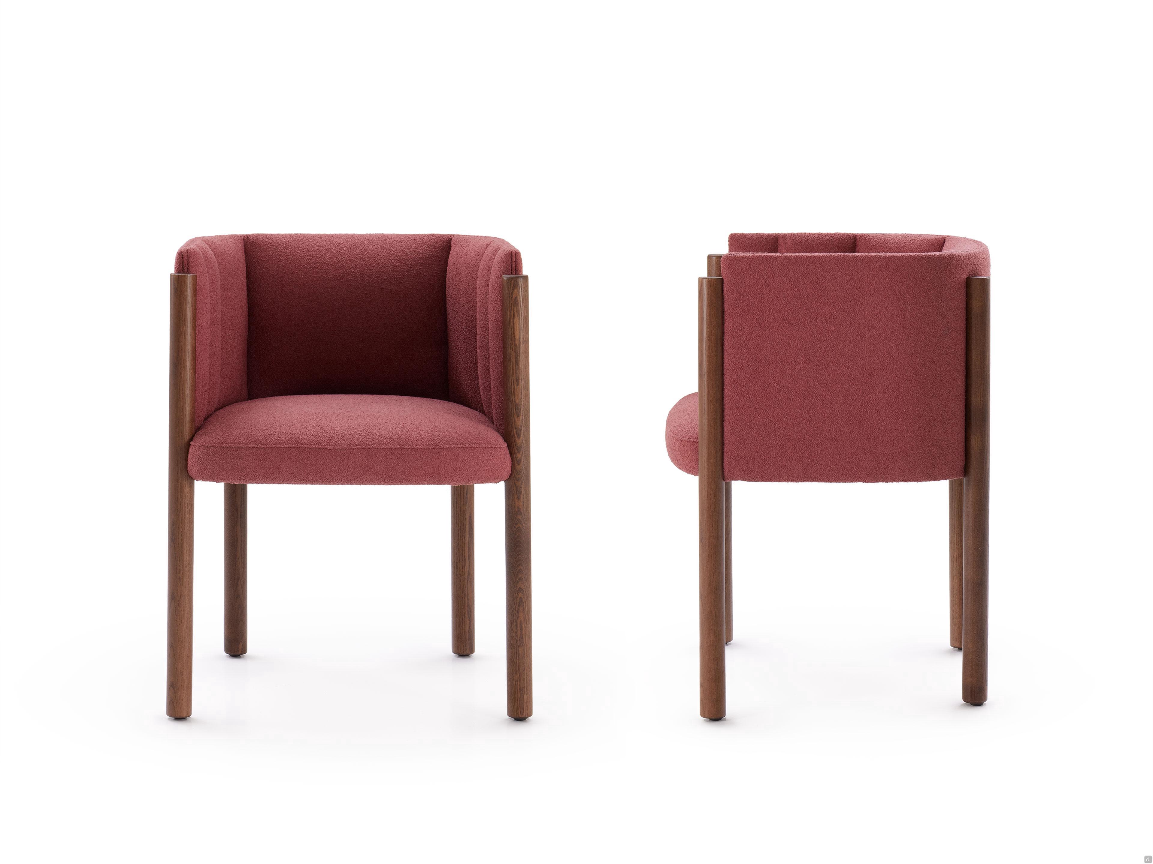 Domizia ist ein quadratischer Polsterstuhl, der sich durch kompakte und strenge Formen auszeichnet, die durch eine weiche Polsterung aufgeweicht werden. Die Rückenlehne, die fast an eine Art Kasten erinnert, entwickelt sich auf drei Seiten, während sie die gleiche Höhe beibehält, und die Biegung in zwei abgerundeten Ecken begrenzt die Armlehnen. Die gepolsterte Schale ist auf der Innenseite mit horizontalen oder vertikalen Steppnähten versehen, die einen dekorativen Wellenstepp-Effekt von unterschiedlicher Stärke erzeugen; auf der Rückseite ist die Polsterung glatt, mit einer sichtbaren Wulst im oberen Profil, die von der feinen Schneiderei zeugt.