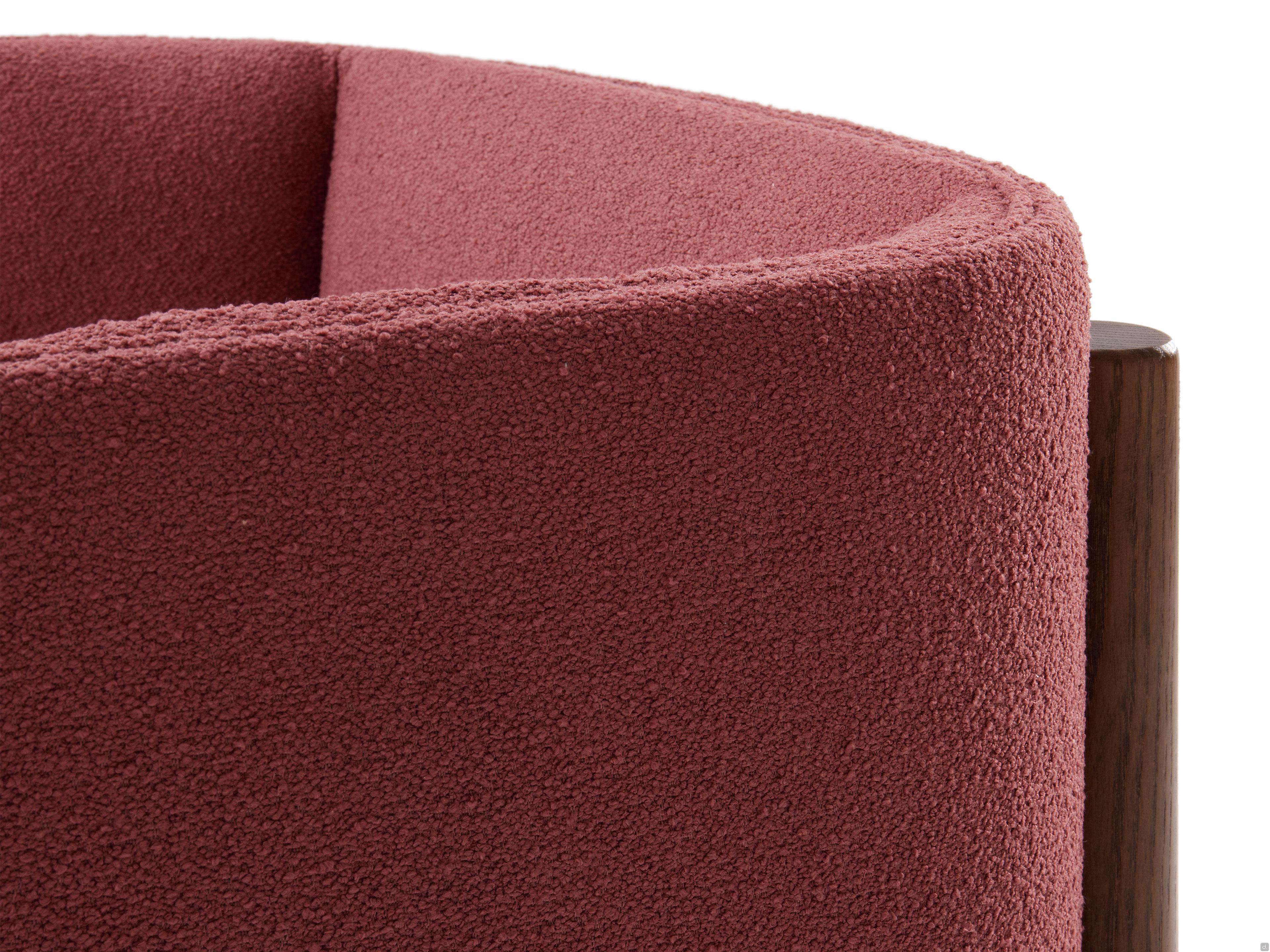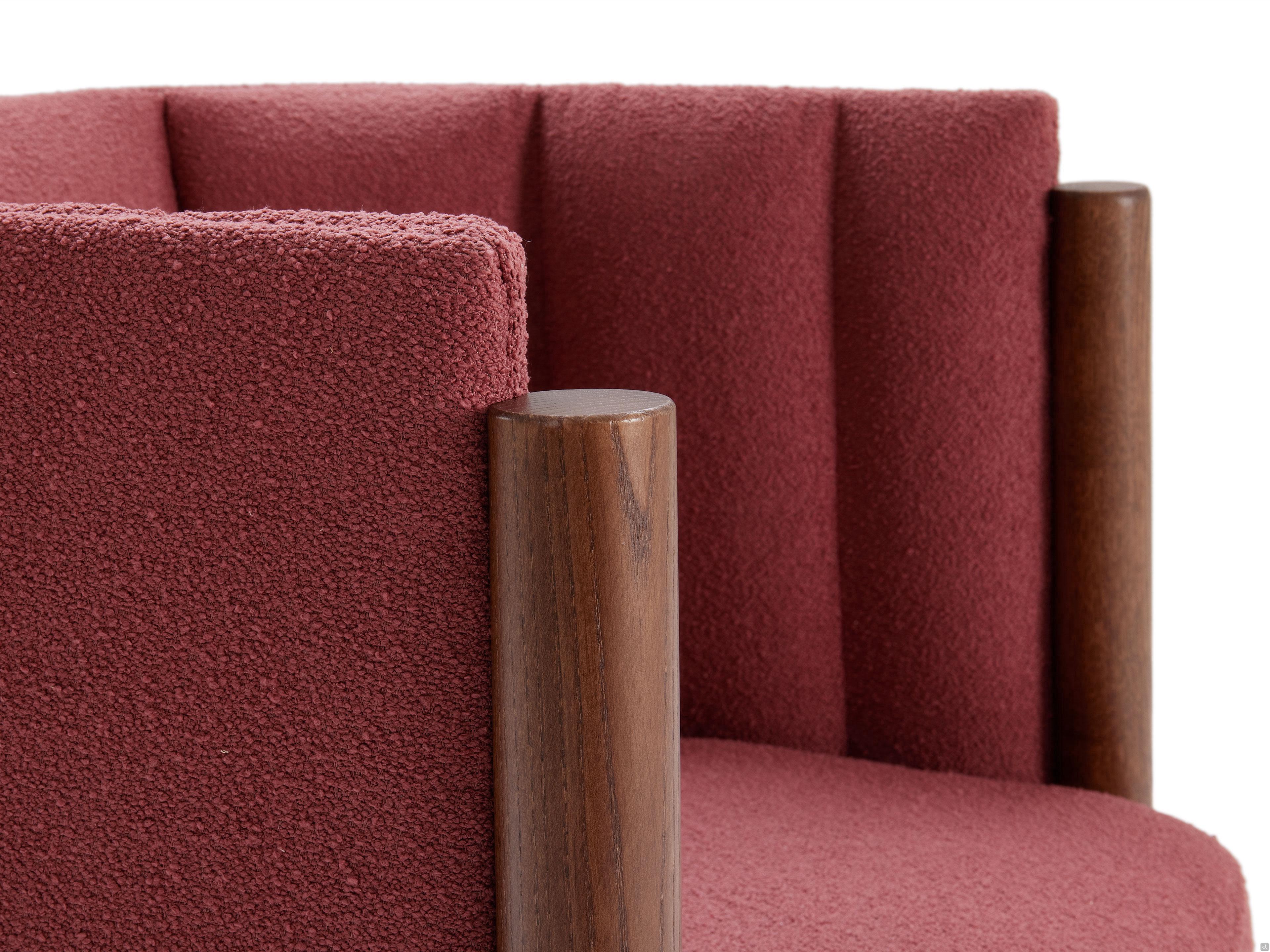Die Beine sind aus Massivholz mit rundem Querschnitt und erstrecken sich vertikal auf der Rückseite der Schale und auf der Vorderseite, wo sie die Armlehnen begrenzen.