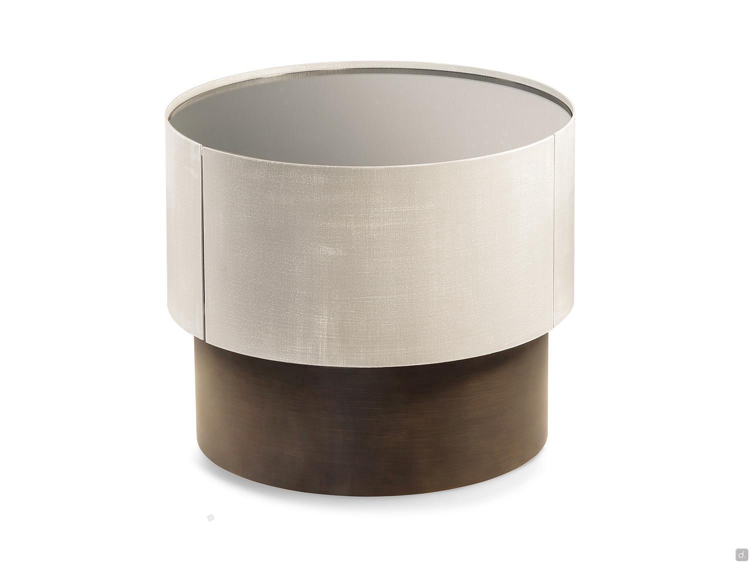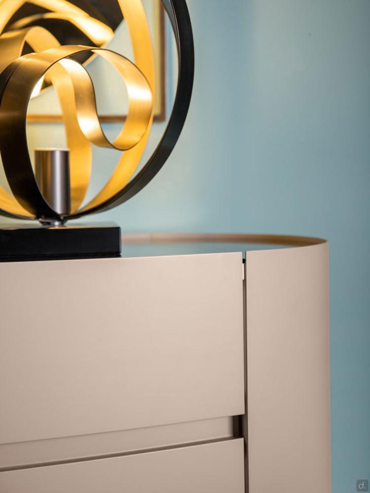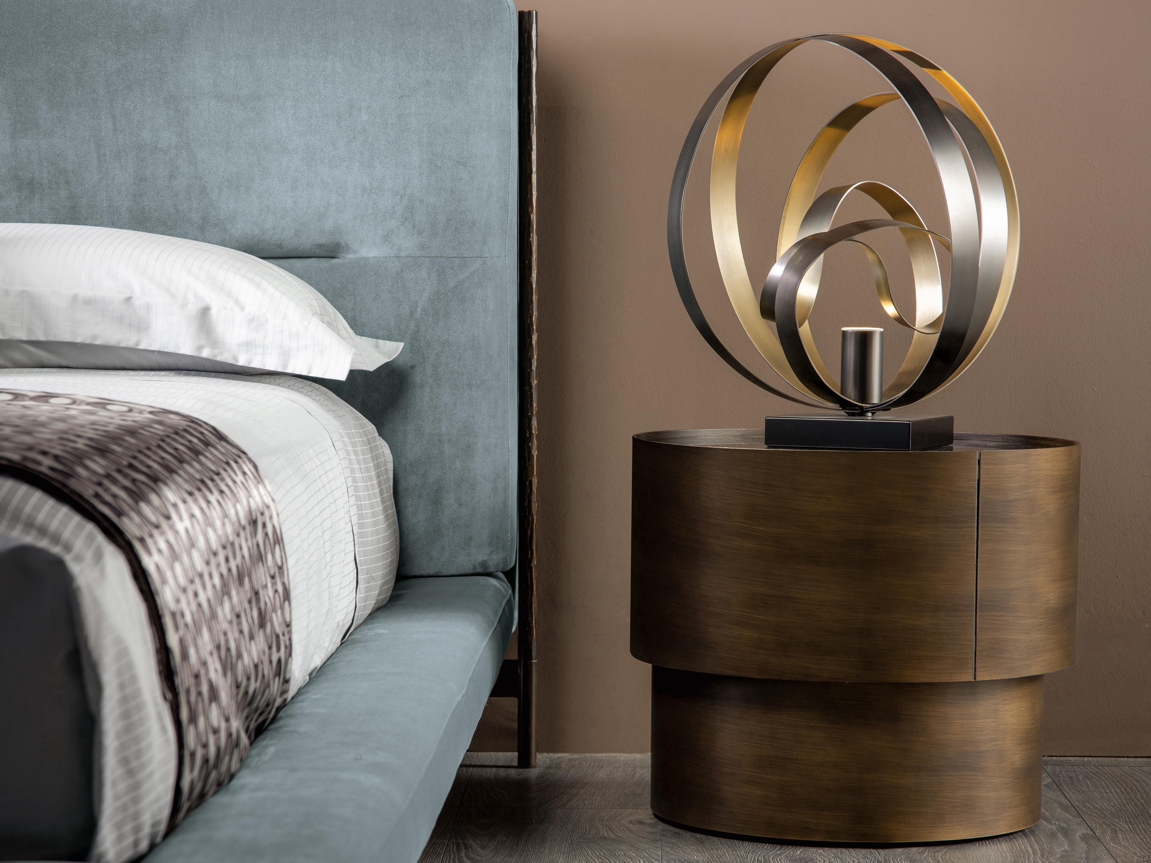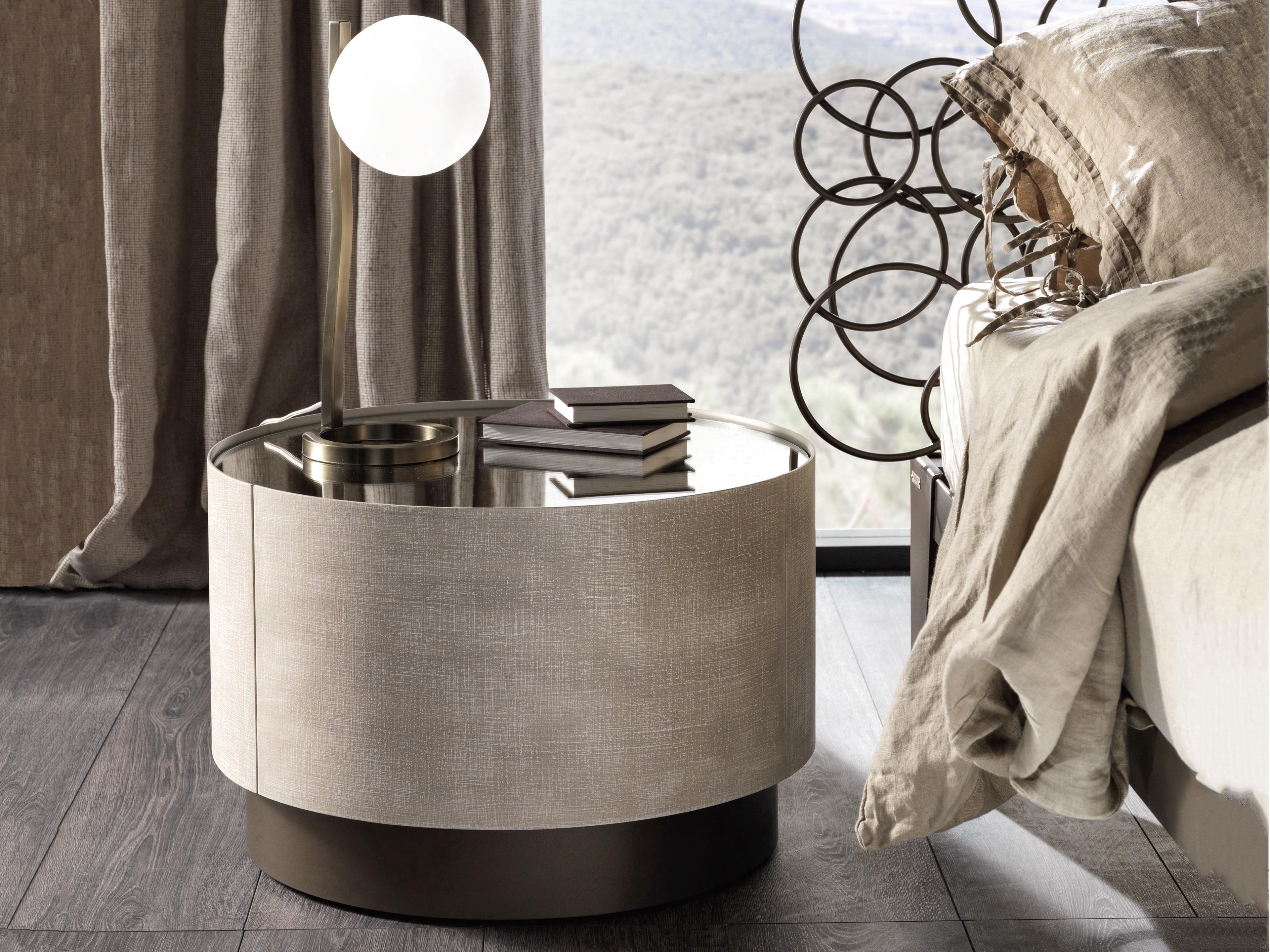 Mirto von Cantori ist ein runder Nachttisch mit 1 Schublade mit gerundetetn Seiten und Fronten aus Metall , auch als Kommode erhältlich. Das geometrische und schlichte Design und seine kompakte Form machen Mirto vielseitig einsetzbar und für zeitgenössische Schlafzimmer besonders geeignet. Mirto lässt sich auch in traditionelle Wohnbereiche einfügen, wo die Ausführungen sich mit den Schmiedeeisenbetten derselben Kollektion kombinieren lassen.