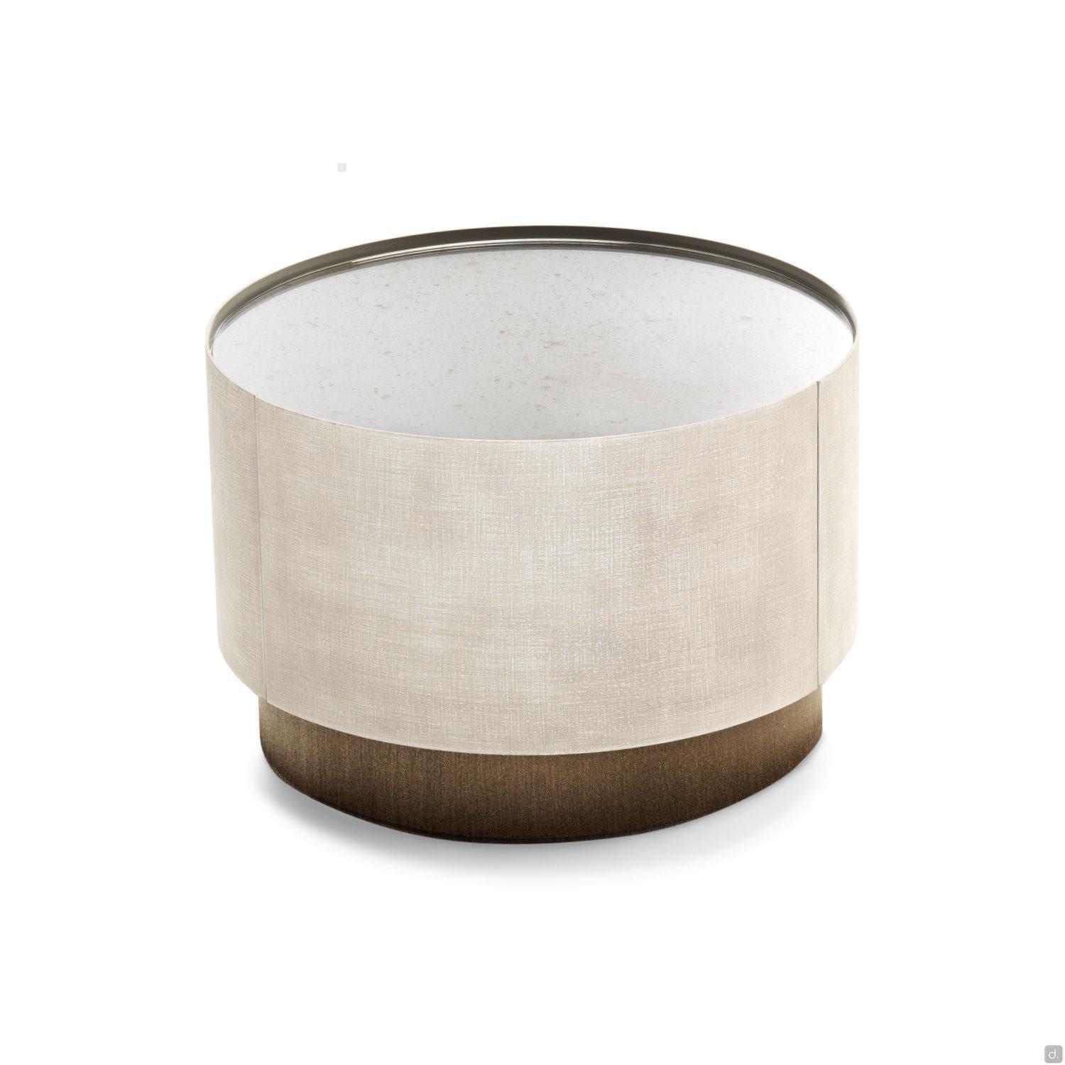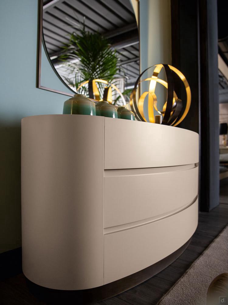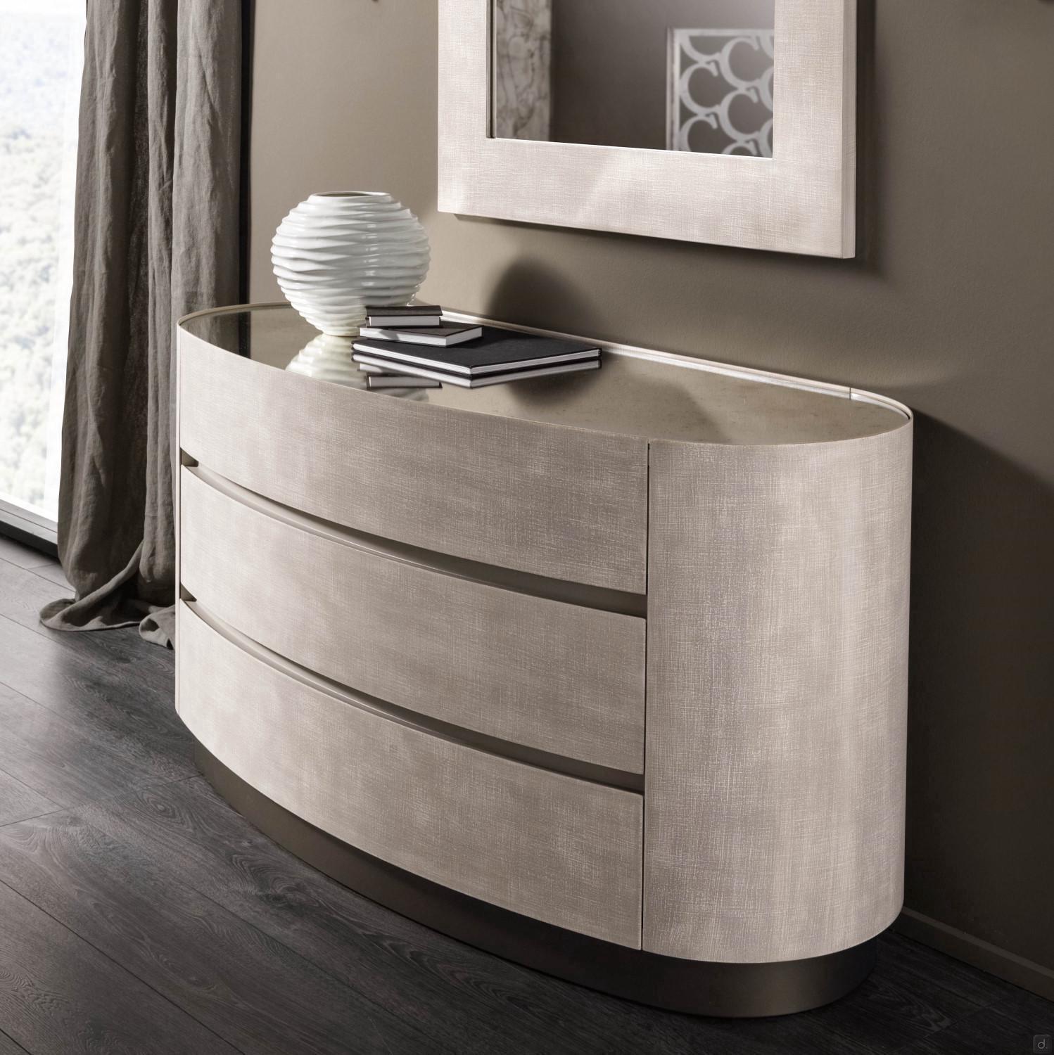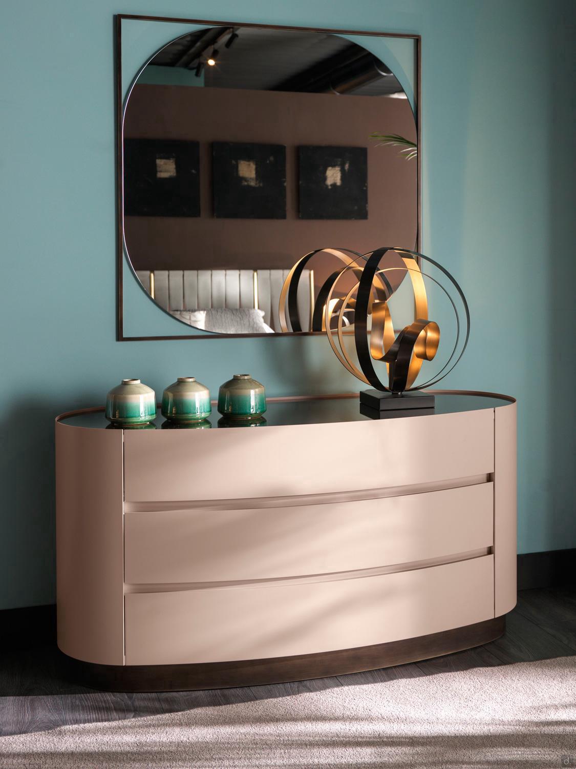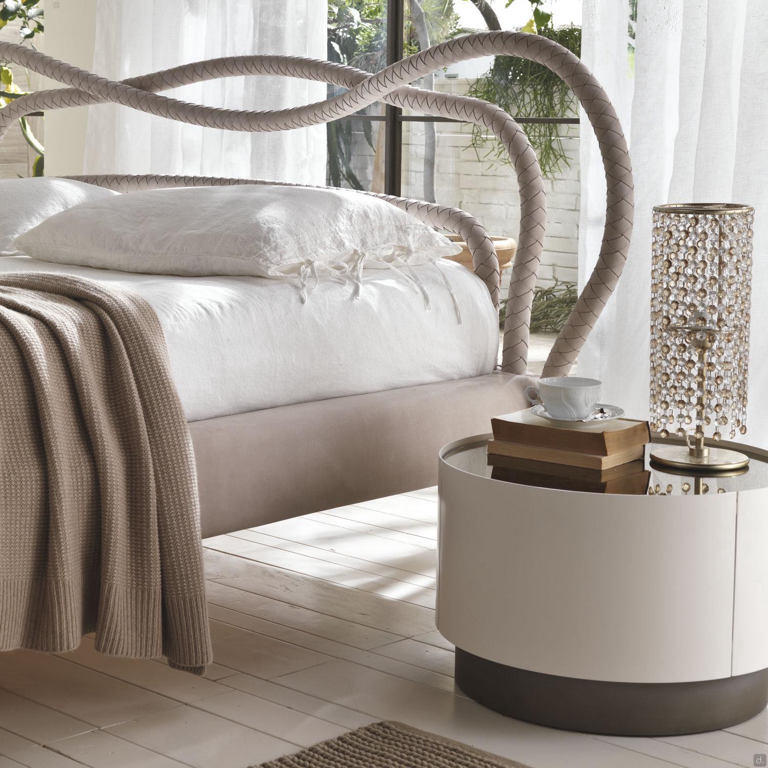 Mirto von Cantori ist ein runder Nachttisch mit 1 Schublade mit gerundetetn Seiten und Fronten aus Metall , auch als Kommode erhältlich. Das geometrische und schlichte Design und seine kompakte Form machen Mirto vielseitig einsetzbar und für zeitgenössische Schlafzimmer besonders geeignet. Mirto lässt sich auch in traditionelle Wohnbereiche einfügen, wo die Ausführungen sich mit den Schmiedeeisenbetten derselben Kollektion kombinieren lassen.