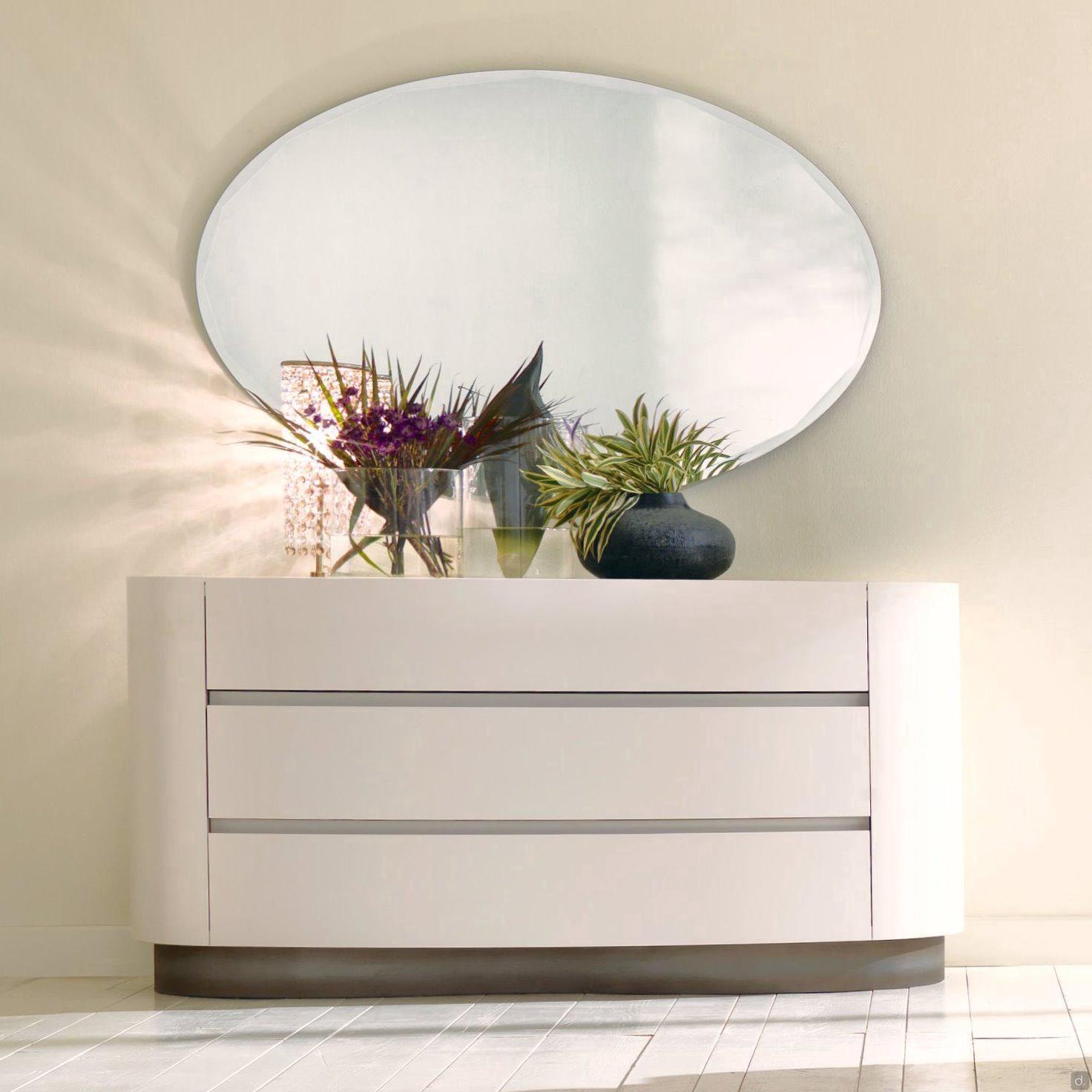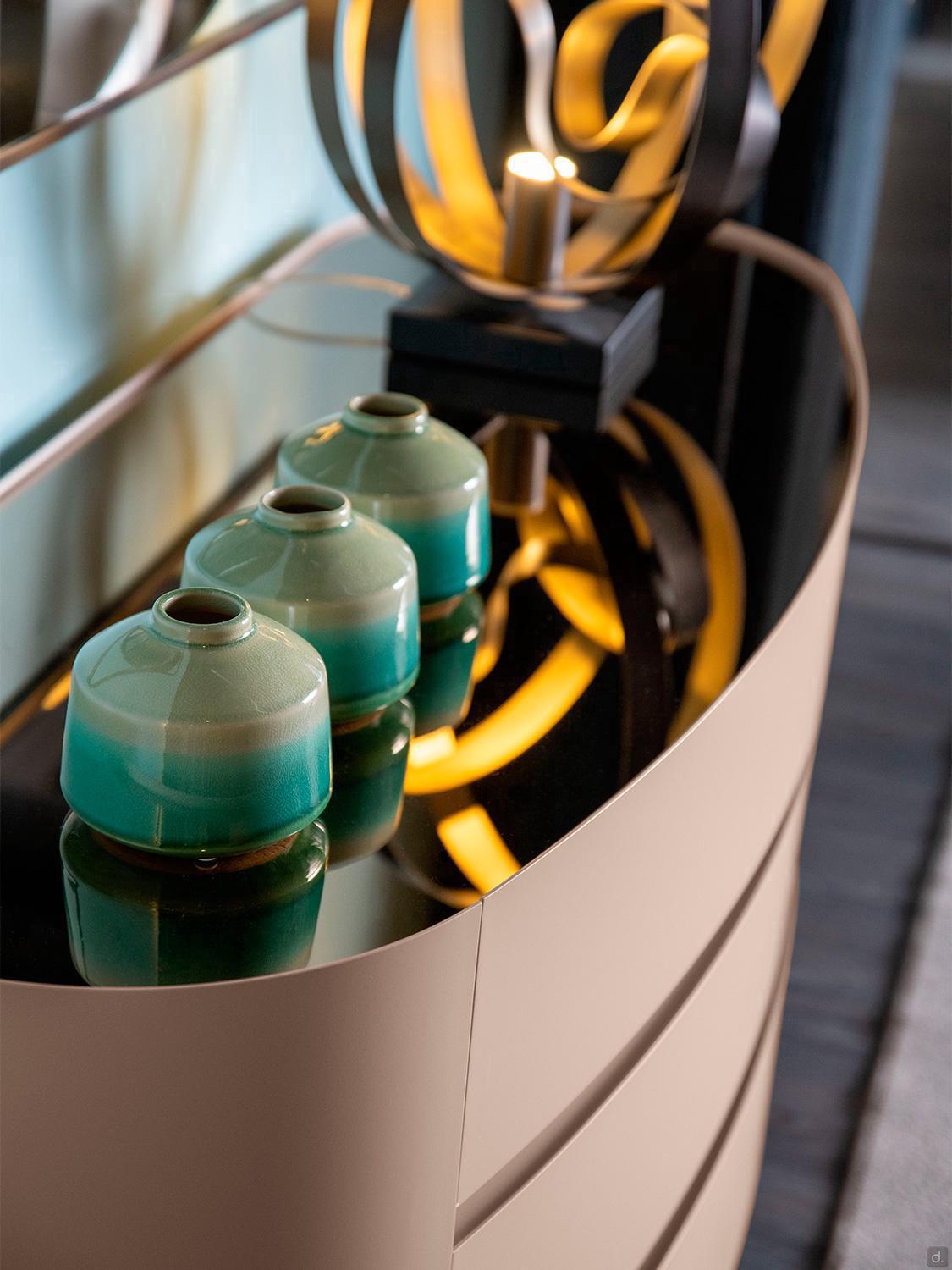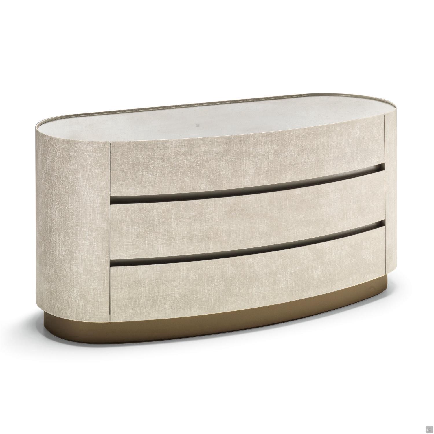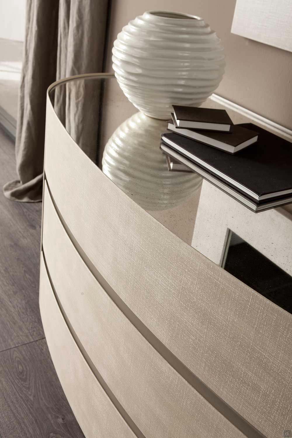 Mirto von Cantori ist ein runder Nachttisch mit 1 Schublade mit gerundetetn Seiten und Fronten aus Metall , auch als Kommode erhältlich. Das geometrische und schlichte Design und seine kompakte Form machen Mirto vielseitig einsetzbar und für zeitgenössische Schlafzimmer besonders geeignet. Mirto lässt sich auch in traditionelle Wohnbereiche einfügen, wo die Ausführungen sich mit den Schmiedeeisenbetten derselben Kollektion kombinieren lassen.