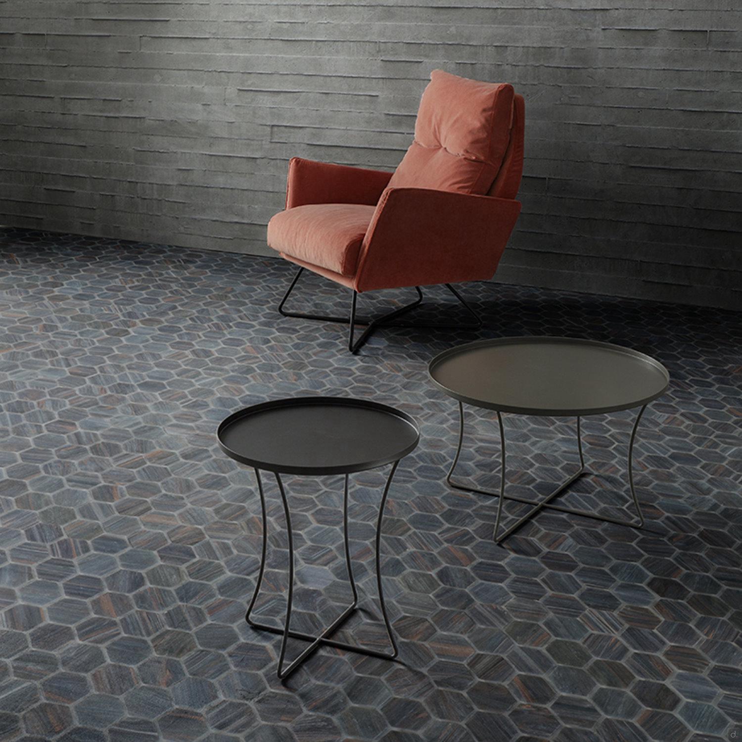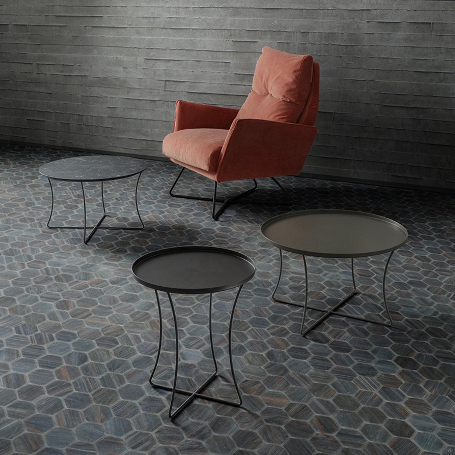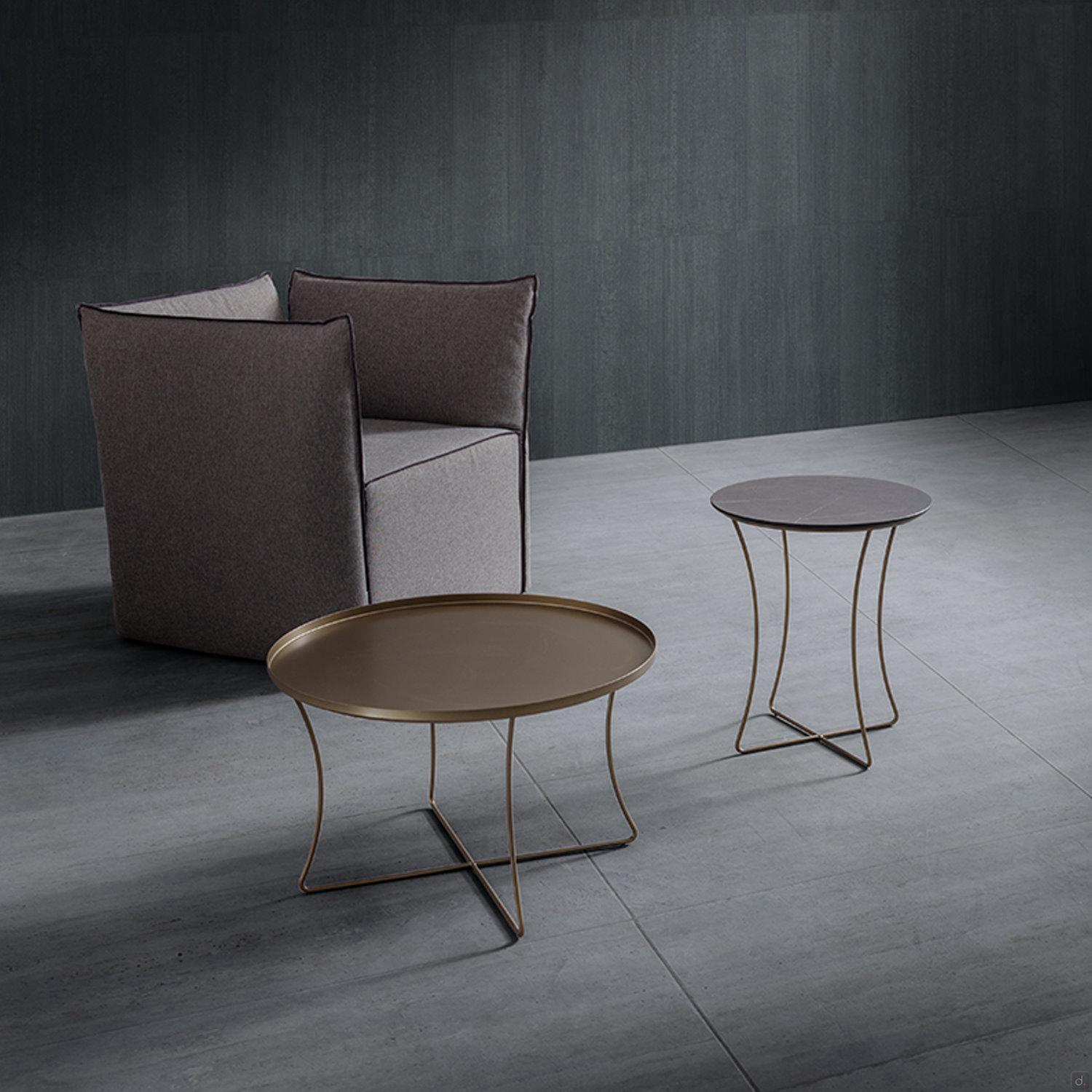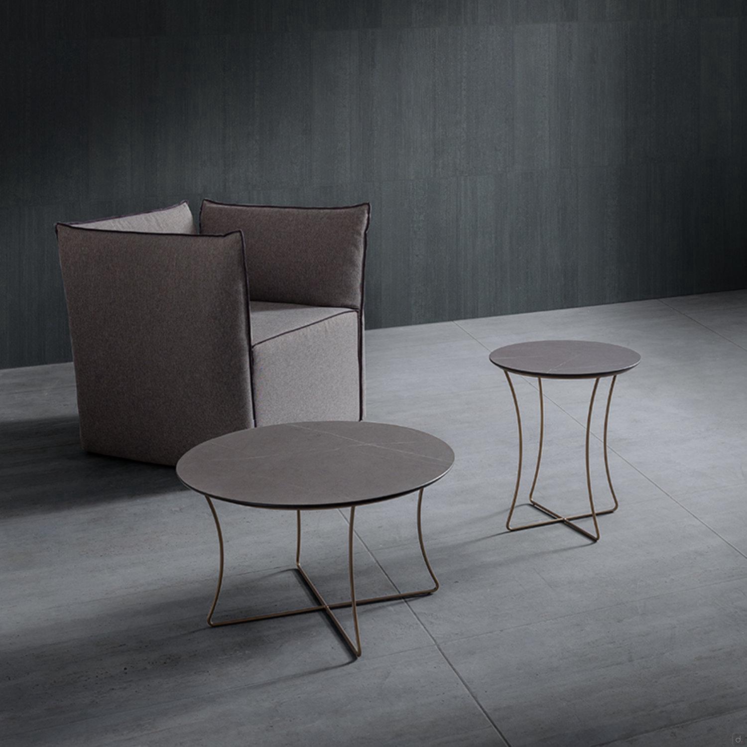 Der runde Couchtisch mit kreuzförmigem Rohrfuß Onix ist ideal für die Aufstellung im Wohnzimmer, einzeln oder in Kombination mit Modellen unterschiedlicher Höhe und Durchmesser. Die Platte ist mit einer lackierten und metallisierten Metallplatte oder in der glatten Version aus HPL und geschichtetem Fenix erhältlich, ausgesprochen widerstandsfähige Materialien mit Stein- oder Marmoreffekt.Onix bietet einen hohen Grad an individueller Gestaltung, sowohl an der Seite als auch an der Vorderseite des Sofas, das sich durch einen Fuß mit 2 Rohrelementen mit rundem Querschnitt auf dem Boden für einen sicheren und stabilen Halt auszeichnet.