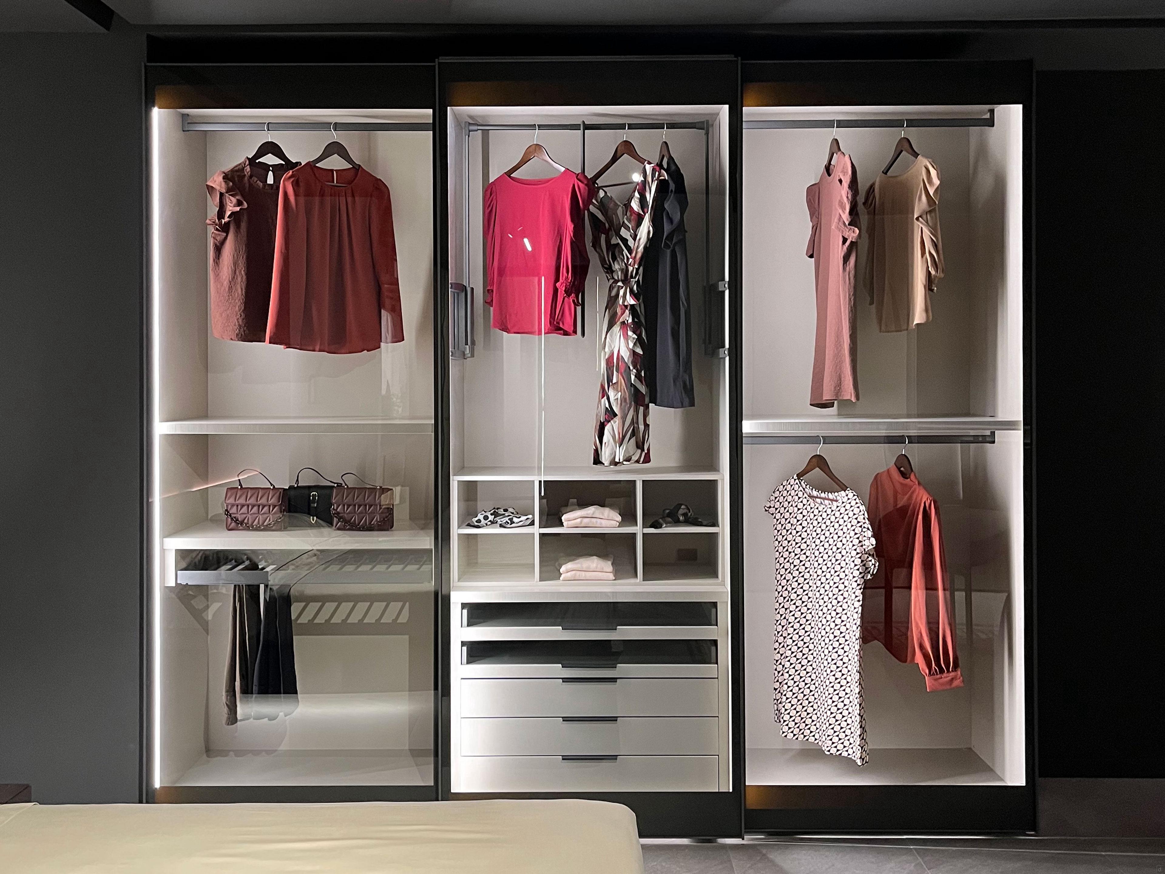 Boutique Player 02 Outlet ist ein Kleiderschrank mit drei transparenten Glasschiebetüren und Metallrahmen.