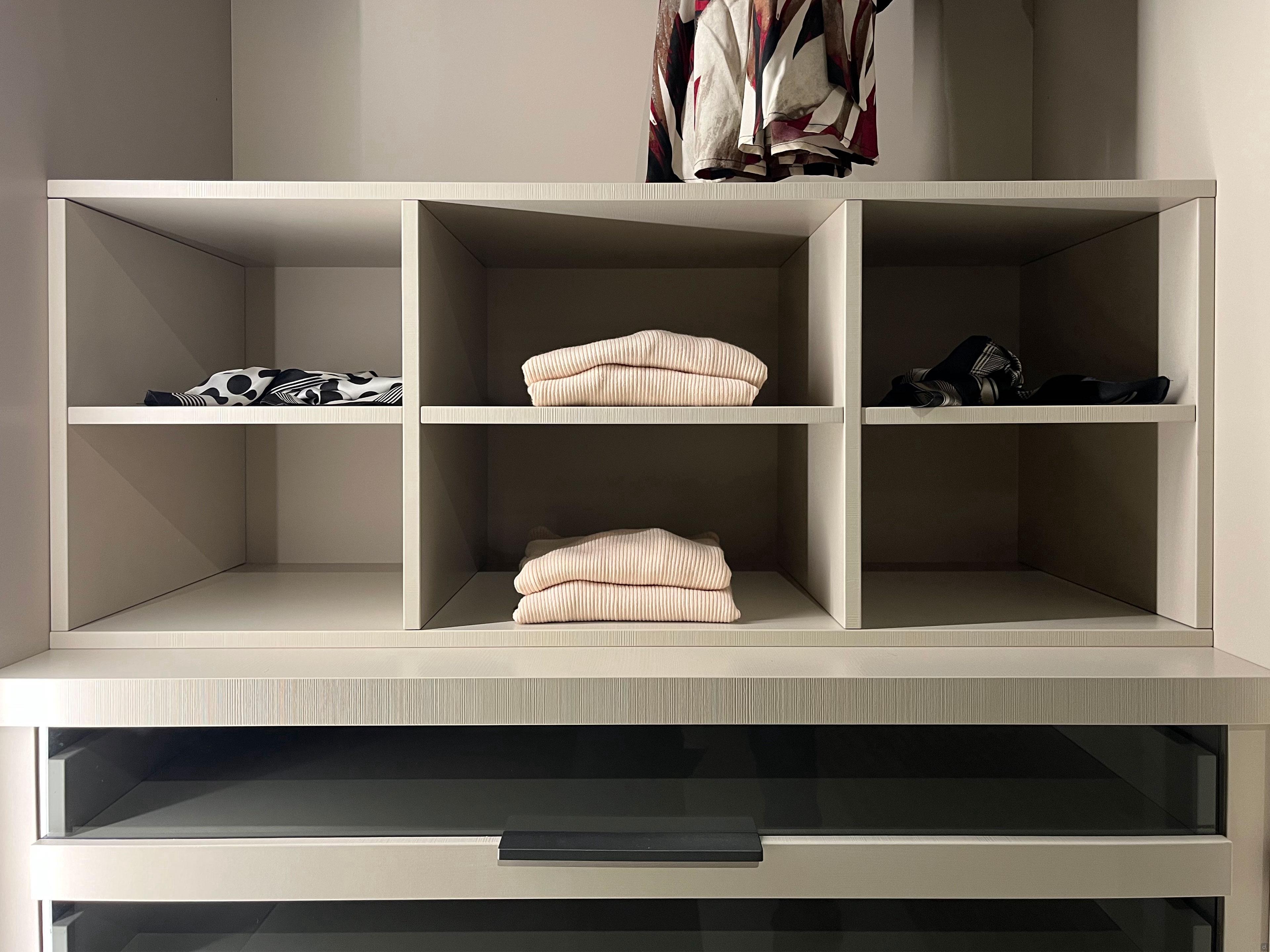Der Innenraum des Schranks ist nach Kriterien der Praktikabilität und Funktionalität gestaltet und mit Zubehörteilen ausgestattet, die den Wert erhöhen und maximalen Komfort garantieren. Zu den markantesten Elementen zählen der herausnehmbare Hosenhalter und die Kommode mit einem darüber liegenden Hemdenraster. Im oberen Teil des Mittelmoduls befindet sich ein herausnehmbarer Kleiderbügel, an dem Kleidungsstücke ganz einfach und mühelos aufgehängt werden können, während die beiden Außenfächer mit Kleiderstangen ausgestattet sind. Abgerundet wird das Ganze durch drei in die Fräsung eingelassene LED-Leisten, die ein harmonisches und dezentes Licht verbreiten, den Innenraum des Schranks aufwerten und eine perfekte Sichtbarkeit bieten.