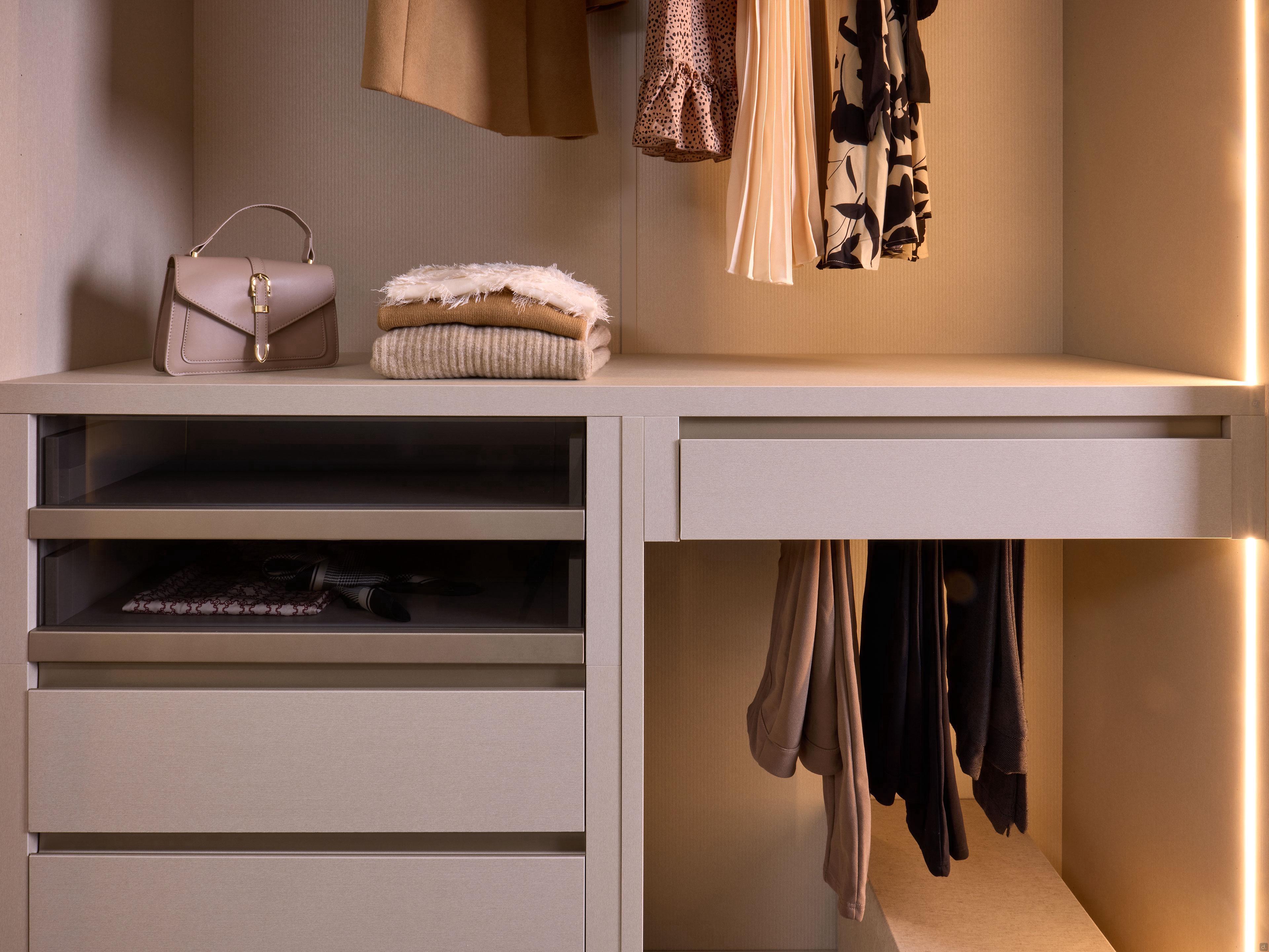 Im Inneren zeichnet sich der Schrank durch eine harmonische und effiziente Raumaufteilung aus; die beiden Fächer, die von vertikalen LED-Leisten beleuchtet werden, sind mit Kleiderhaken, Einlegeböden, von denen zwei herausnehmbar sind, Schubladen und ausziehbaren Hosenständern ausgestattet.