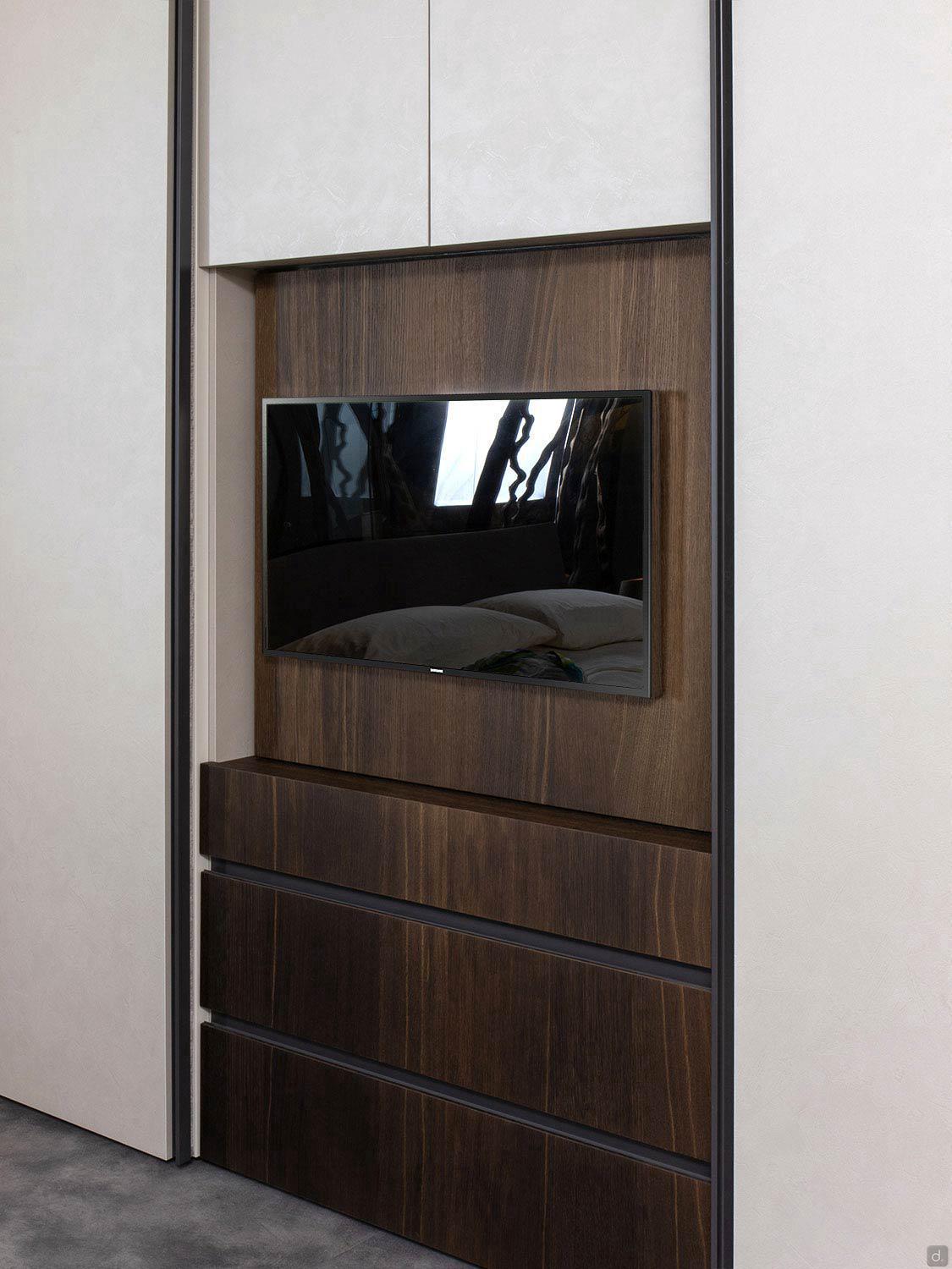 Das TV-Schrankmodul ist in den Breiten 97,5 und 117,5 cm erhältlich und bietet die Möglichkeit, originelle Material- und Farbkontraste zwischen Türen, TV-Schwenkpaneel und Schubladen zu schaffen.