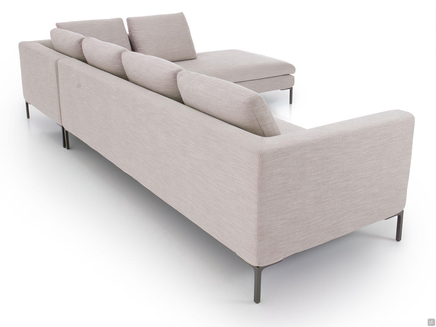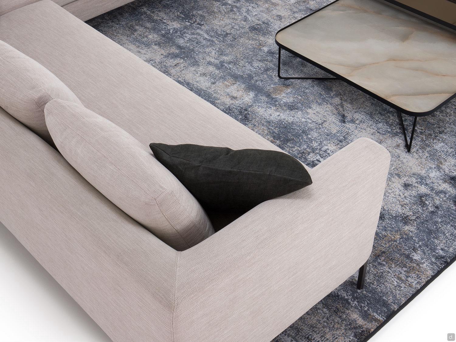 Die weiche Sitzfläche besteht aus einem einzigen, reichlich gepolsterten Sitzkissen, das von Armlehnen umgeben ist, die so hoch sind wie die Rückenlehnenstruktur. Weich gefüllte Kissen in Naturfedern verleihen dem Sofa, das in geradlinigen Versionen mit 2 oder 3 Sitzen oder mit einer Halbinsel erhältlich ist, einen frischen und modernen Charakter.
