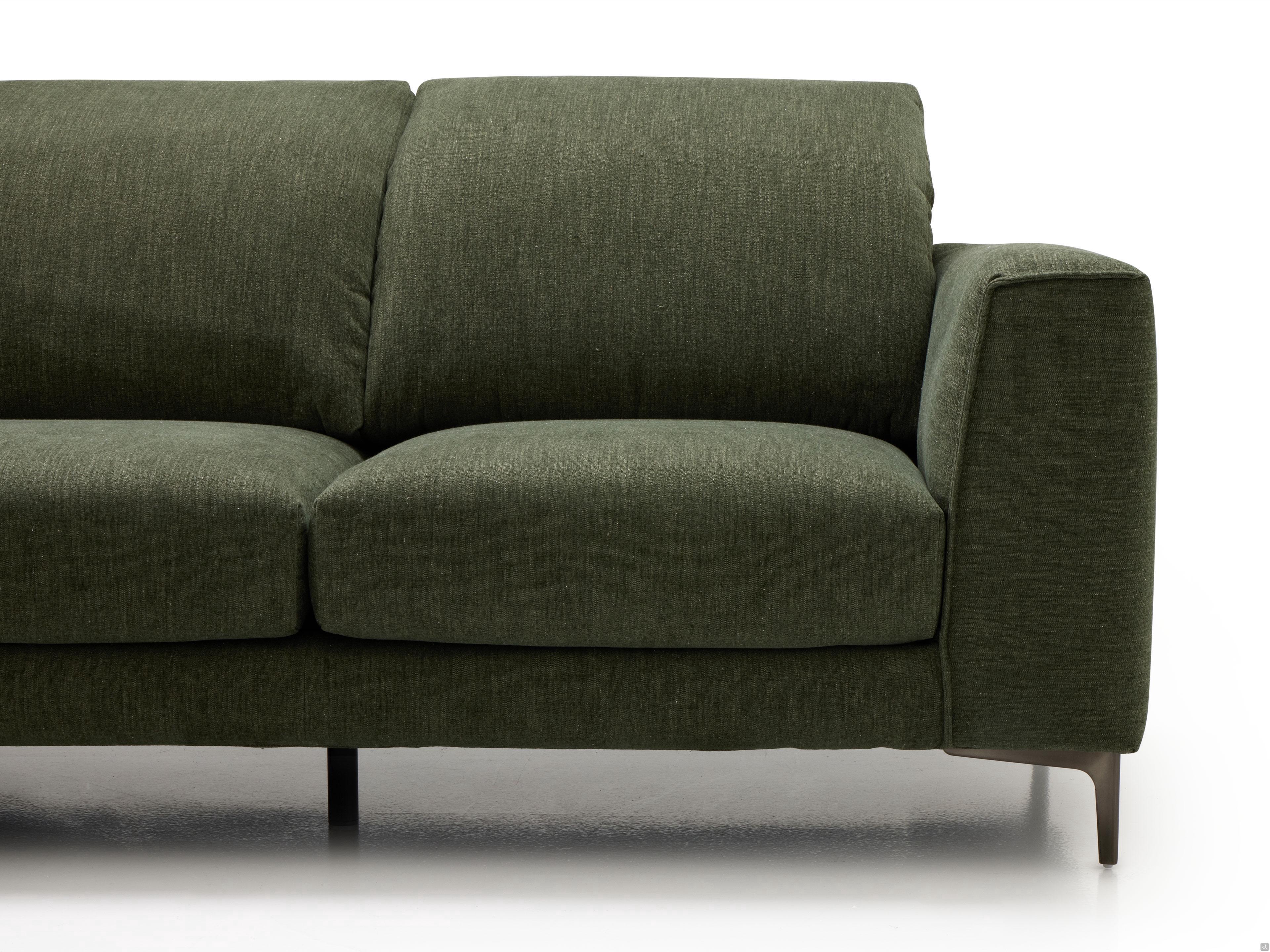 Die Bezüge sind komplett abnehmbar und können aus dem umfangreichen Musterbuch für Stoffe, Samt, Kunstleder und Leder ausgewählt werden; wenn Sie sich für das Sofa in Echtleder entscheiden, können nur die Sitz- und Rückenkissen abgenommen werden. Die hohen, modernen Füße sind aus titanfarbenem Metall, Edelstahl oder champagnerfarben satiniert..