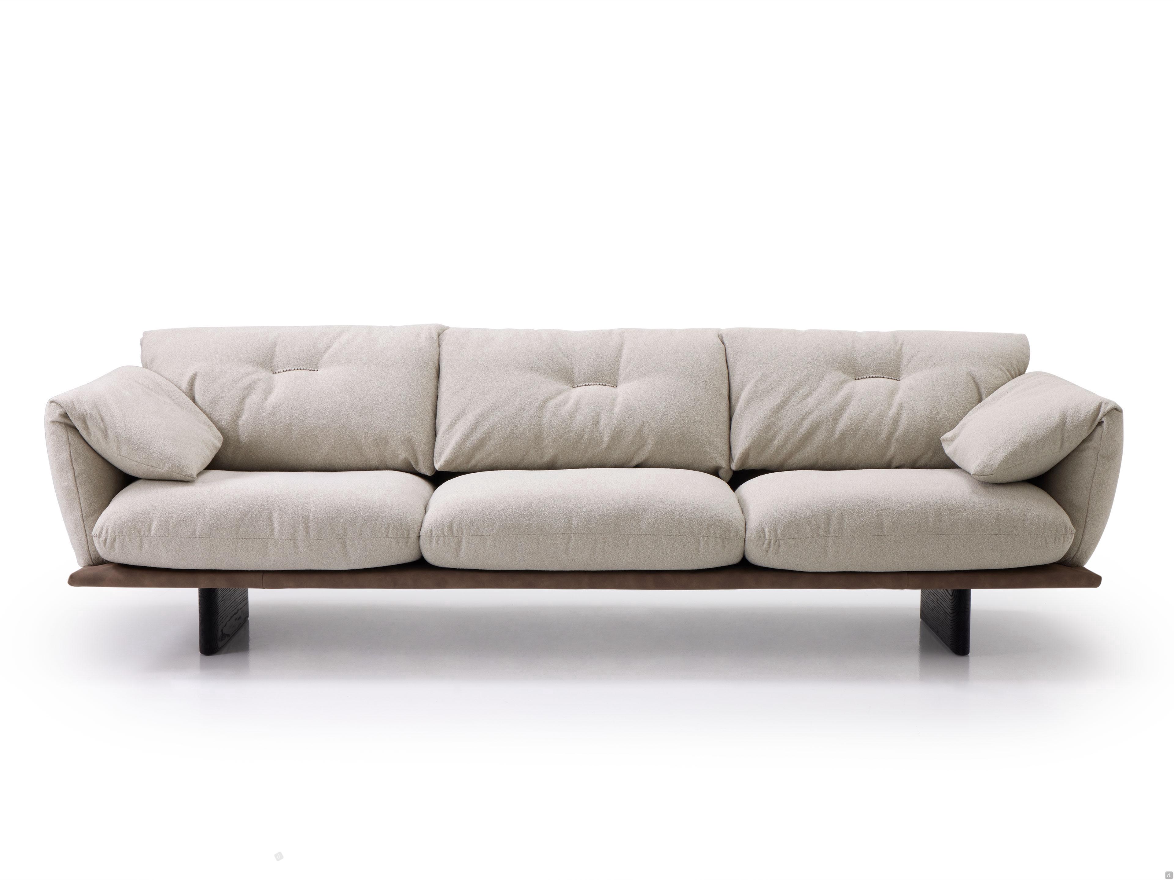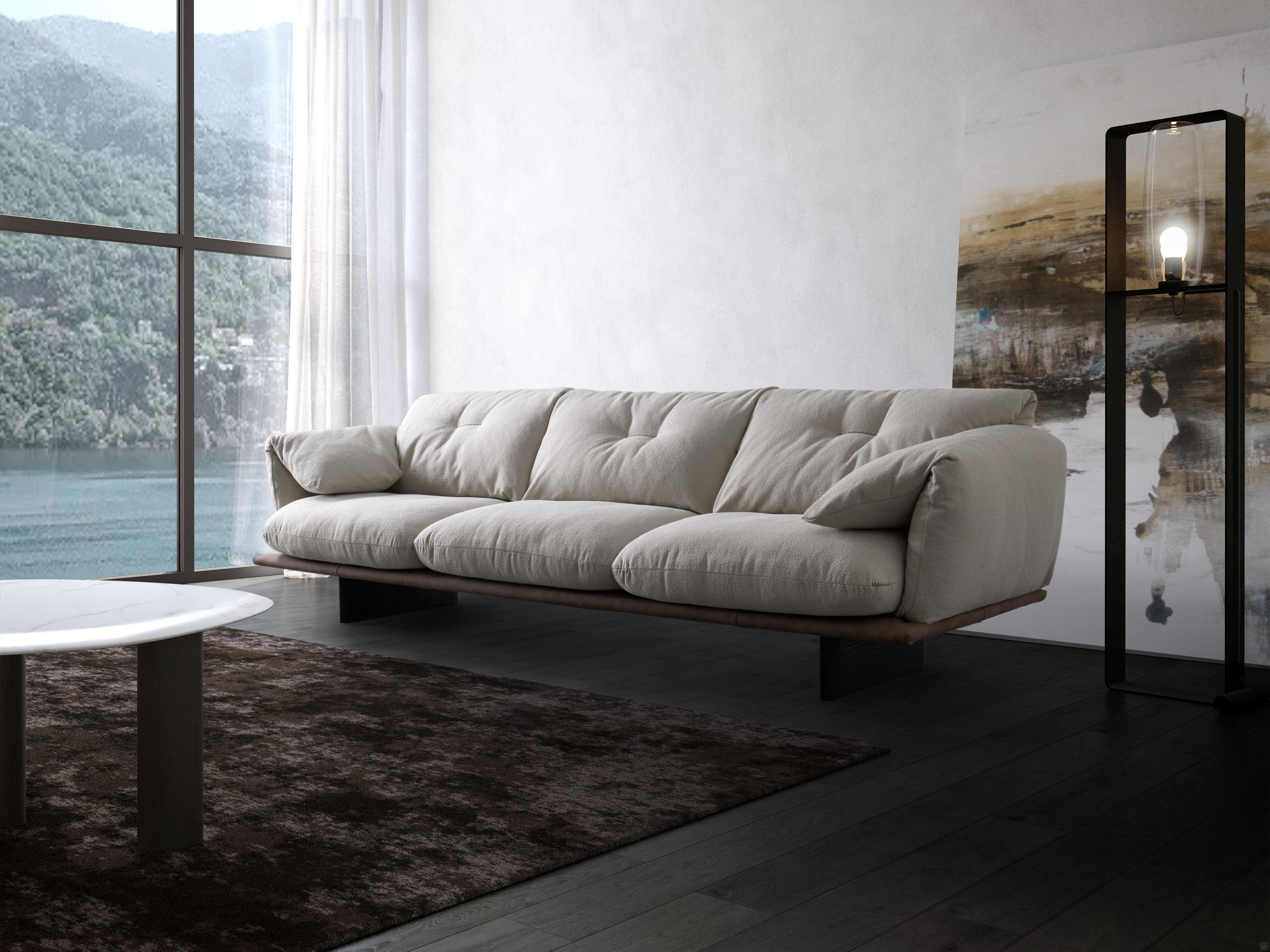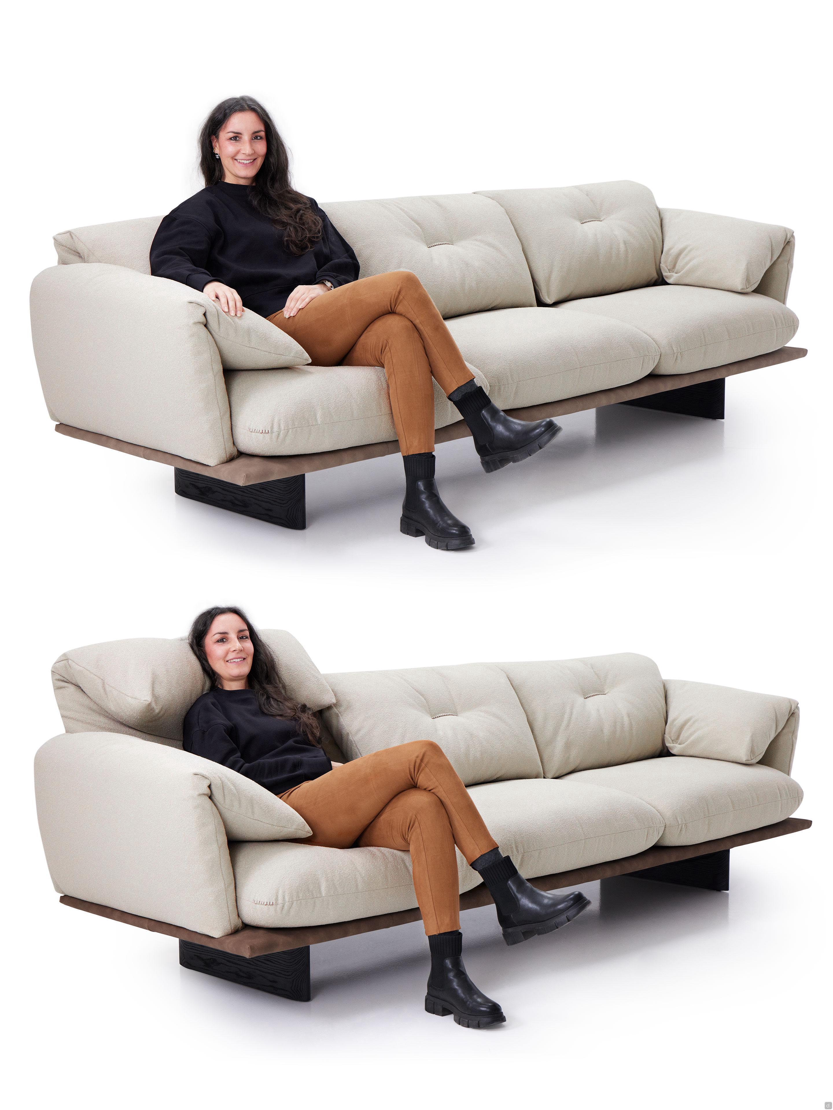 Norman Outlet ist ein geradliniges Sofa, das von geformten Holzfüßen getragen wird. Es wird in einer zweifarbigen Version angeboten und verfügt über weiche, umhüllende Kissen, die mit einem wasser- und schmutzabweisenden Mini-Bouclé-Stoff in einem raffinierten hellen Taubengrau bezogen sind. Die Polsterung bildet einen eleganten Kontrast zum darunter liegenden Boden, der mit glattem, dunkelbraunem Kunstleder bezogen ist. Eine zentrale Stickerei, die sich durch einen leichten Polsterdruck auszeichnet, schmückt die Rückenkissen. Dieses zarte und diskrete Detail verleiht dem Ganzen ein angenehmes und dezentes Gefühl von Bewegung. Norman Outlet ist das Ergebnis einer perfekten Verschmelzung von Komfort und Stil, entwickelt nach den Regeln der großen handwerklichen Tradition des Made in Tuscany.