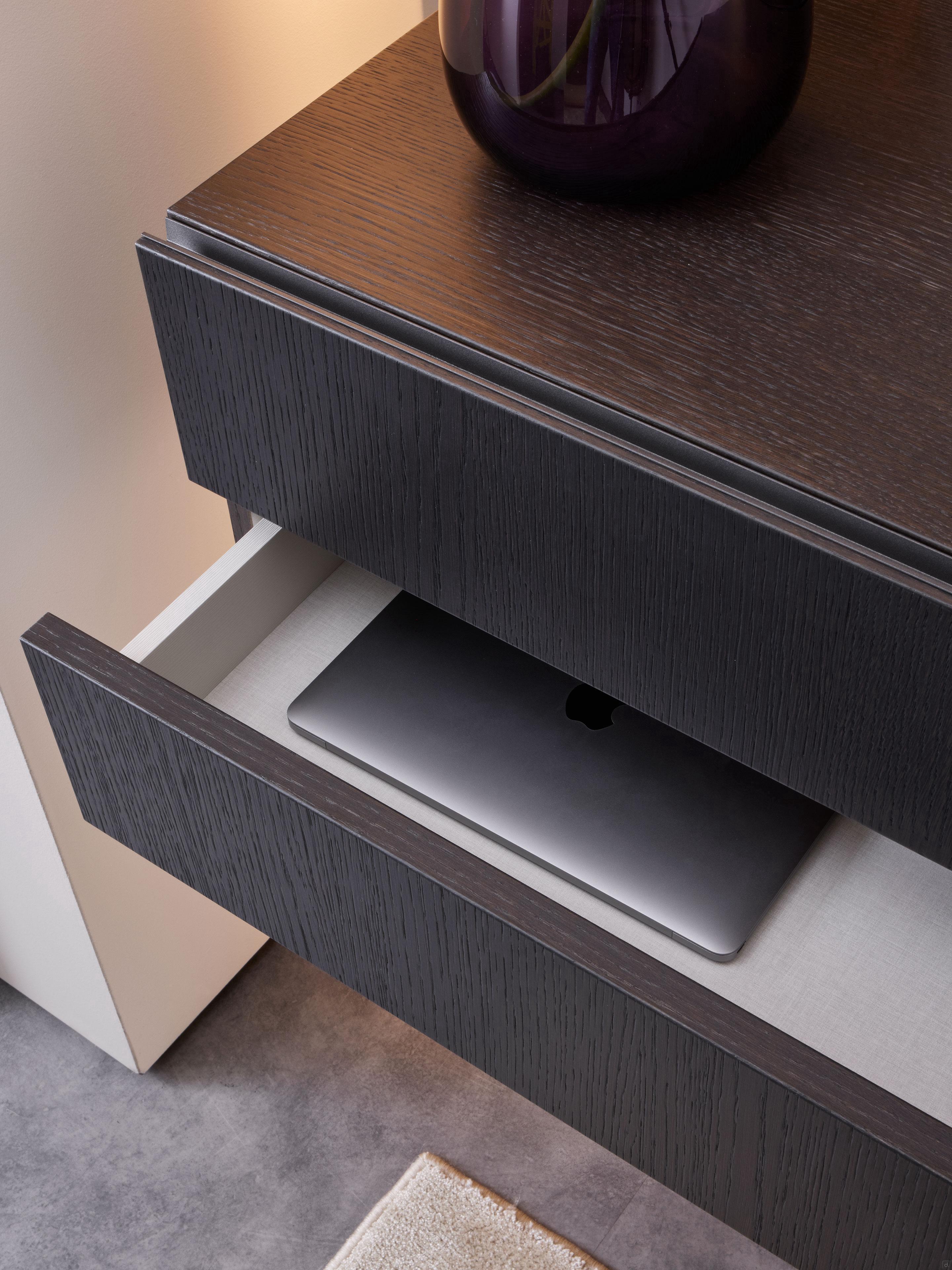 Mittige Aussparung zum Einbau eines Möbelstücks mit Schublade oder Klapptür oder eines Regals