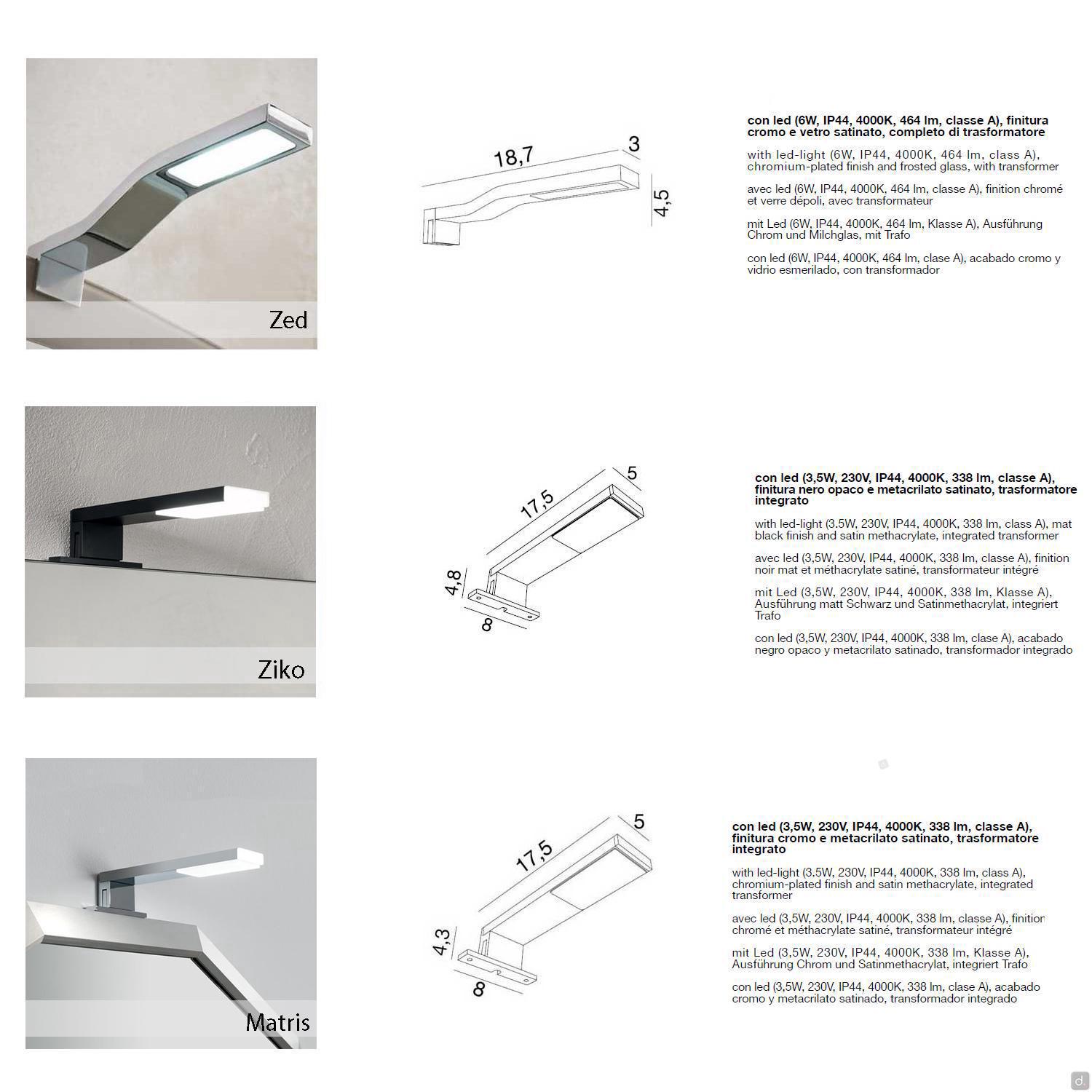 - Zed: verchromt; mit 6W LED komplett mit Trafo; 4000 K, 464 lm, IP44, Klasse A; cm 3 t.18,7 h.4,5