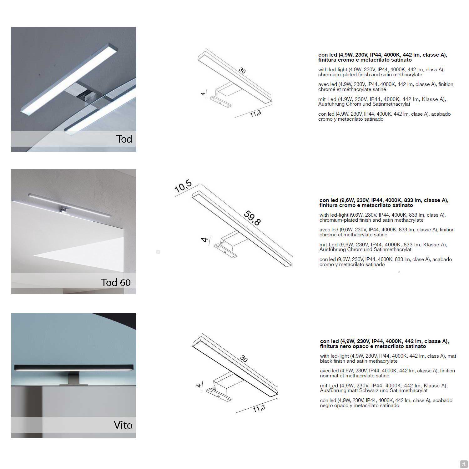 - Tod 60: verchromt; mit 9,6W LED komplett mit Trafo; 4000 K, 833 lm, 230V, IP44, Klasse A; cm 59,8 t.10,5 h.4