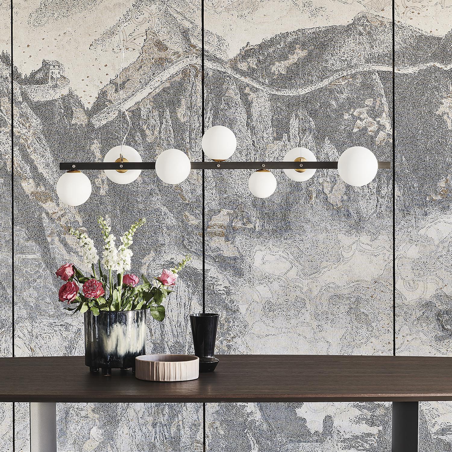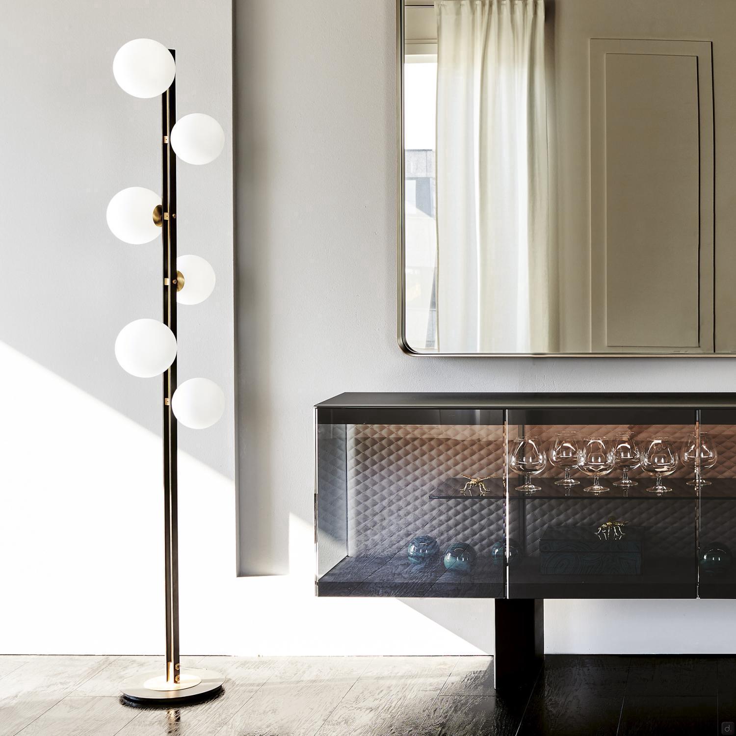 Planeta von Cattelan ist eine Designer Stehlampe mit Sphärenkugeln aus weißem, satiniertem, geblasenem Glas, die ein elegantes Spiel der Gleichgewichte mit der minimalistischen Struktur aus brüniertem Eisen erzeugen. Planeta ist als Hänge-, Steh-, Tisch- und Wandleuchtenmodelle erhältlich, um eine koordinierte Beleuchtung im Wohnzimmer oder in der Lounge zu schaffen.