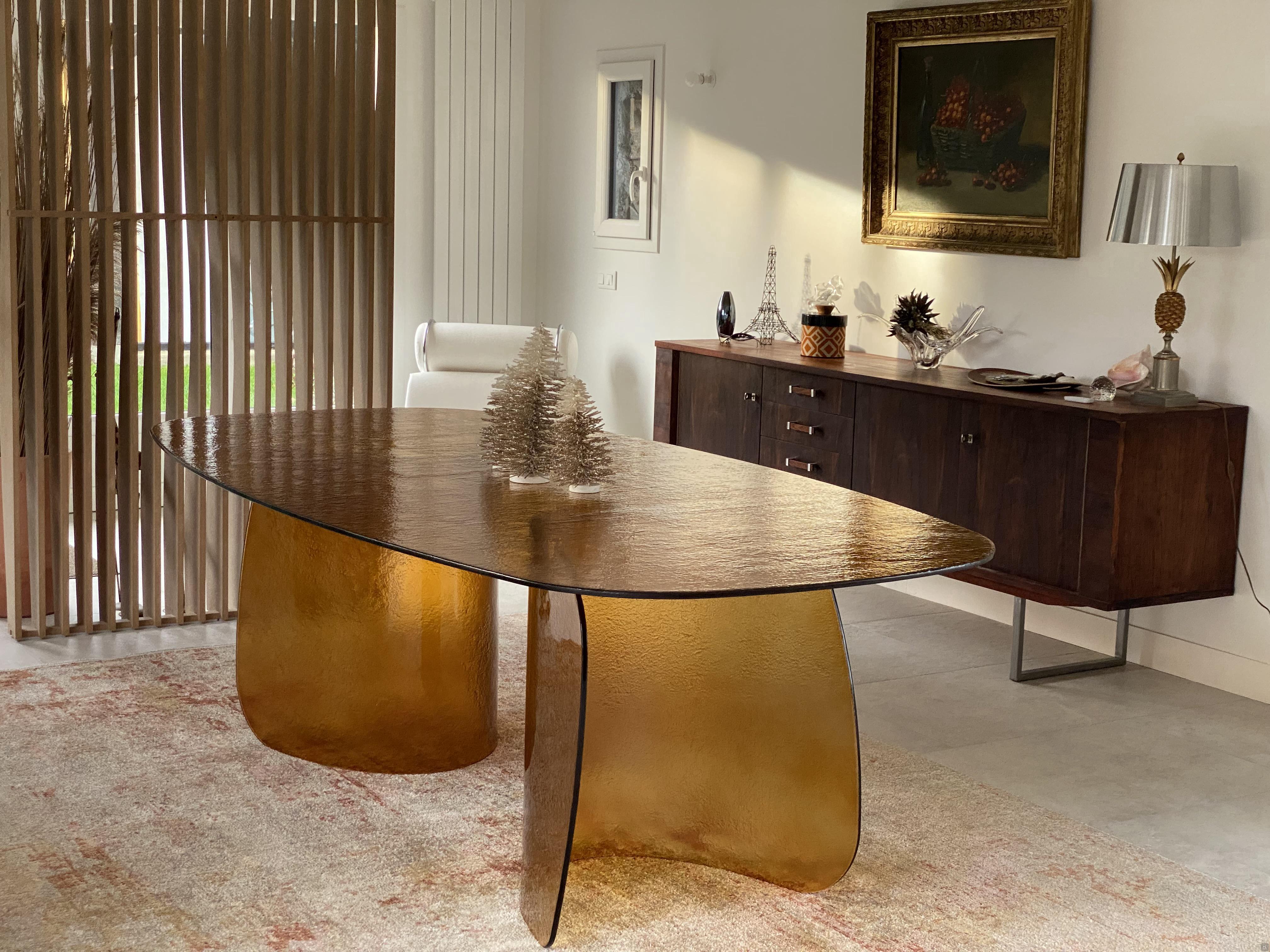 Elegant und ansprechend, mit dem besonderen Hammerschlag-Effekt, der die Bewegung des Innenraums des Möbelstücks verstärkt, ist Lens ein Tisch ganz aus Glas, der sich perfekt mit den Stühlen derselben Kollektion kombinieren lässt, um einen abgestimmten Essbereich im Wohnzimmer einzurichten.
