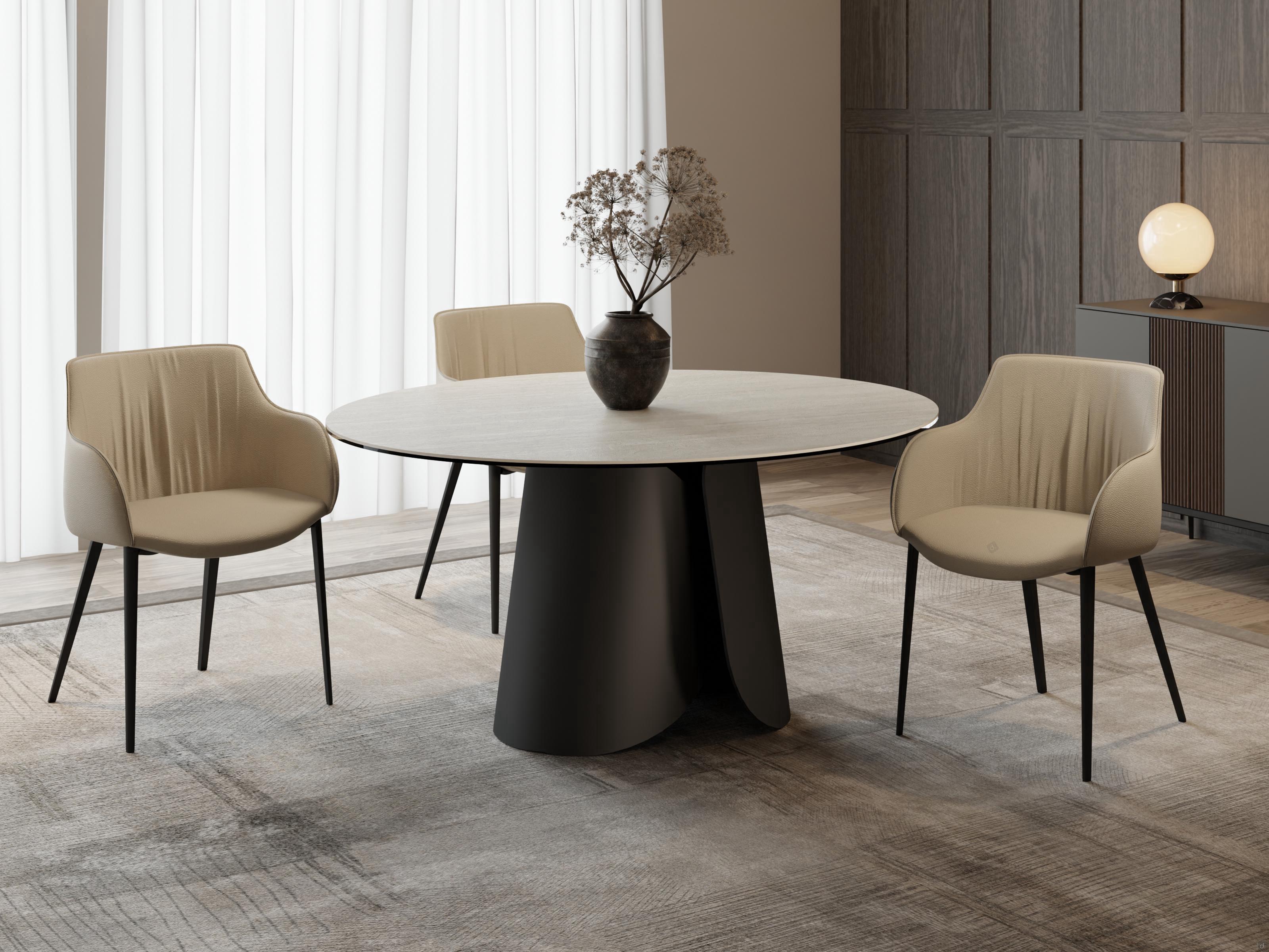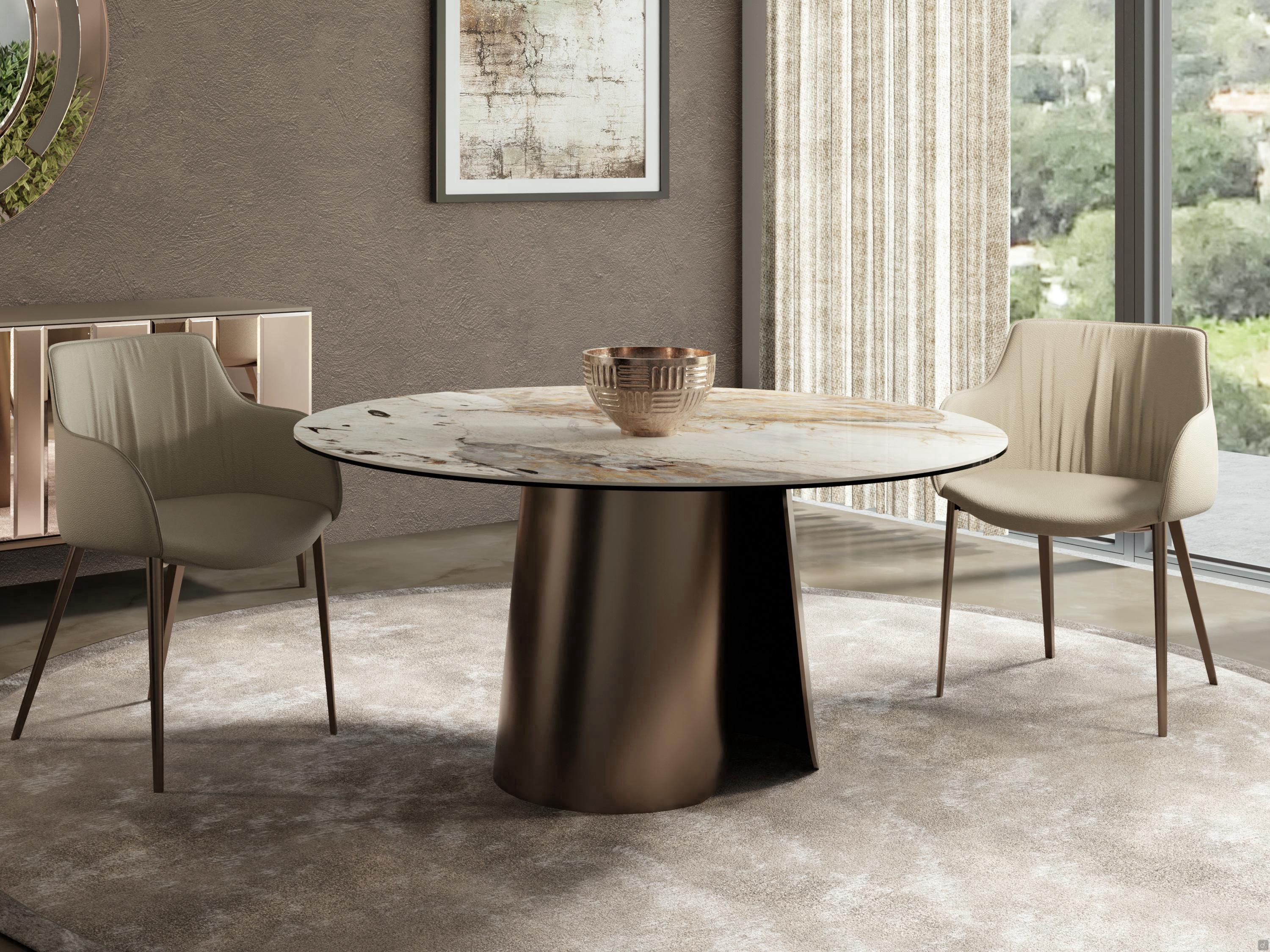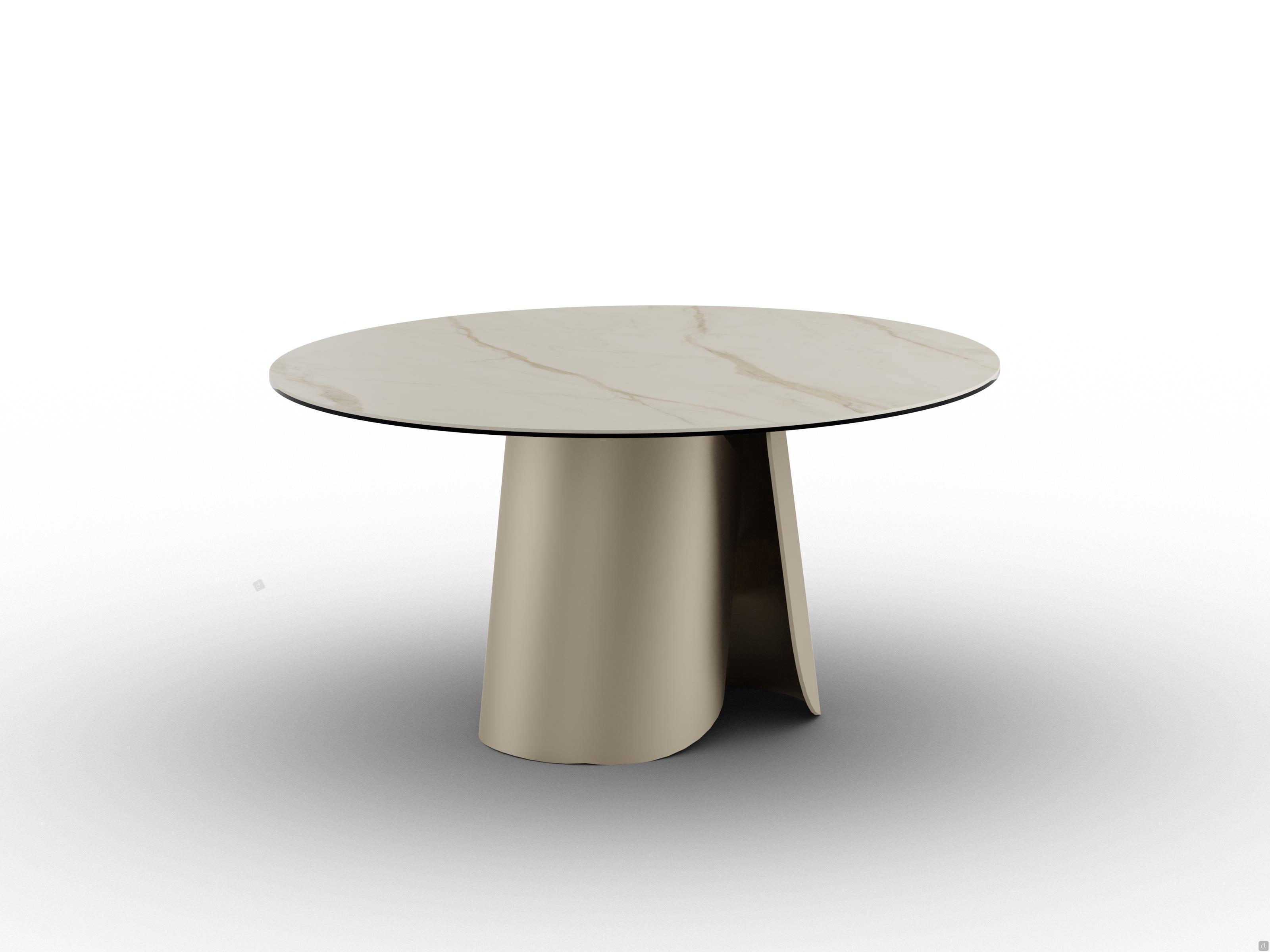 Die Breite beginnt bei 140 cm für das runde modell un geth über 160 bis 240 cm, so dass sich die Tische sowohl für Küchen und Esszimmer als auch für große, moderne, offene Räume eignen. Zu den Materialien, mit denen die Platte individuell gestaltet werden kann, gehören Melamin und HPL Schichtholz, glänzend oder matte Keramik, Rauchglas oder bronziertes Glas mit dem charakteristischen „Plug“-Dekor.