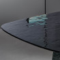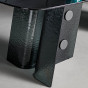 Botón von Bonaldo ist ein Tisch aus schwarzem Rauchglas, der vollständig aus gehärteten, verschmolzenen Kristallplatten besteht. Was auf den ersten Blick ins Auge sticht, ist die feine Verarbeitung des gehämmerten Glases, die sich auf allen Oberflächen wiederfindet, auch auf den gebogenen Glasplatten, die den besonderen Untersatz bilden. Das gehämmerte Glas, das direkt im Schmelzofen bearbeitet wird, führt zu einem faszinierenden Effekt der dynamischen "Bewegung", der auf der Oberfläche deutlich sichtbar ist und durch sehr geringe Unterschiede in der Stärke, durch Vertiefungen und Reliefs entsteht, die bei Berührung und Anblick einen einzigartigen Materialeffekt erzeugen. Die Eigenschaften des Glases finden sich auch auf dem Standfuß wieder, auf dem vier knopfförmige Metalleinsätze angebracht sind, um das Ganze mit einem Hauch von chromatischem und materiellem Design zu verschönern - ein einzigartiges Merkmal, das dem Ganzen seinen Namen gibt.