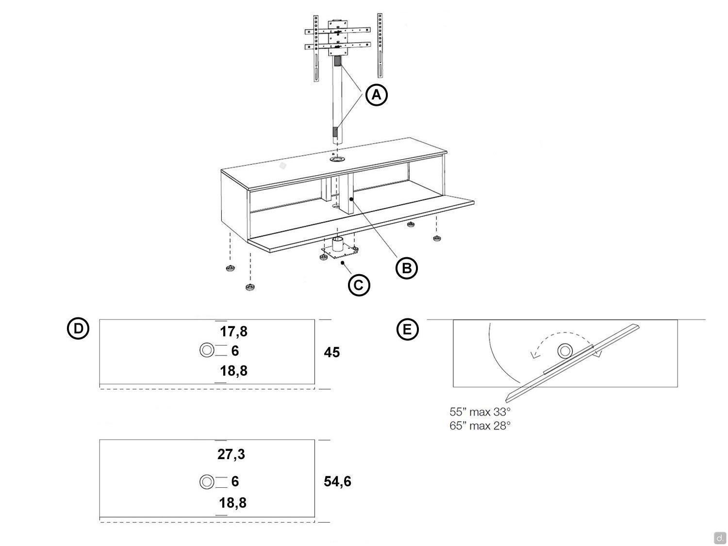 Beleuchtung: LED-Lichtrahmen wahlweise auf 3 oder 4 Seiten des Perimeters mit Vorschaltgerät positioniert. LED 3000K mit Entwicklung von 14W bis 50W max. je nach Größe. Bei Begrenzungen von mehr als 6 m Länge werden zwei LED-Beleuchtungssysteme gekoppelt. Eingeschaltet über Netzanschluss oder optionale Fernsteuerung. Um den Unterschrank mit LED-Streifen zu hinterleuchten, wird zwischen Kasten und Wand eine 1,9 cm starke Abstandsplatte in schwarzer MDF-Ausführung angebracht. Die Tiefe des Elements erhöht sich dadurch um 1,9 cm. Die Abstandsplatte wird an der Wand befestigt, während das Unterschrank mit den mitgelieferten Winkeln an der Abstandsplatte eingehängt wird.