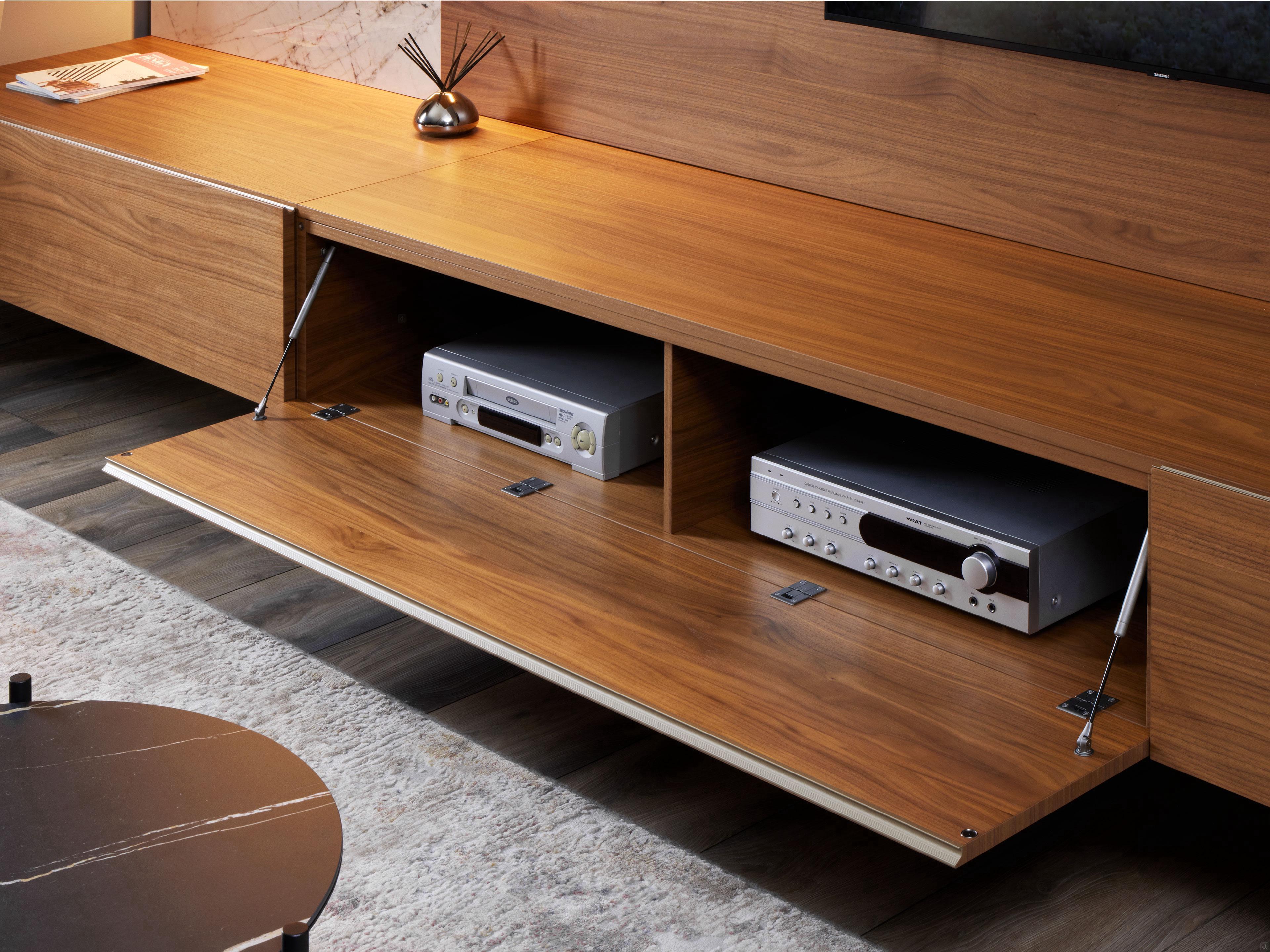 Barre Led sotto-mensola: da 11,6 W ciascuna, complete di alimentatore da 75 W con protezione sovraccarico. Fissaggio magnetico alla mensola, con copertura frontale in tinta alla mensola da 1,2 cm e luce led incassata da 3000K. I pannelli boiserie, così come il retro-pannello in MDF, prevedono di serie una scanalatura per il passaggio dei cavi di alimentazione, che escono sempre da destra (guardando frontalmente la mensola).