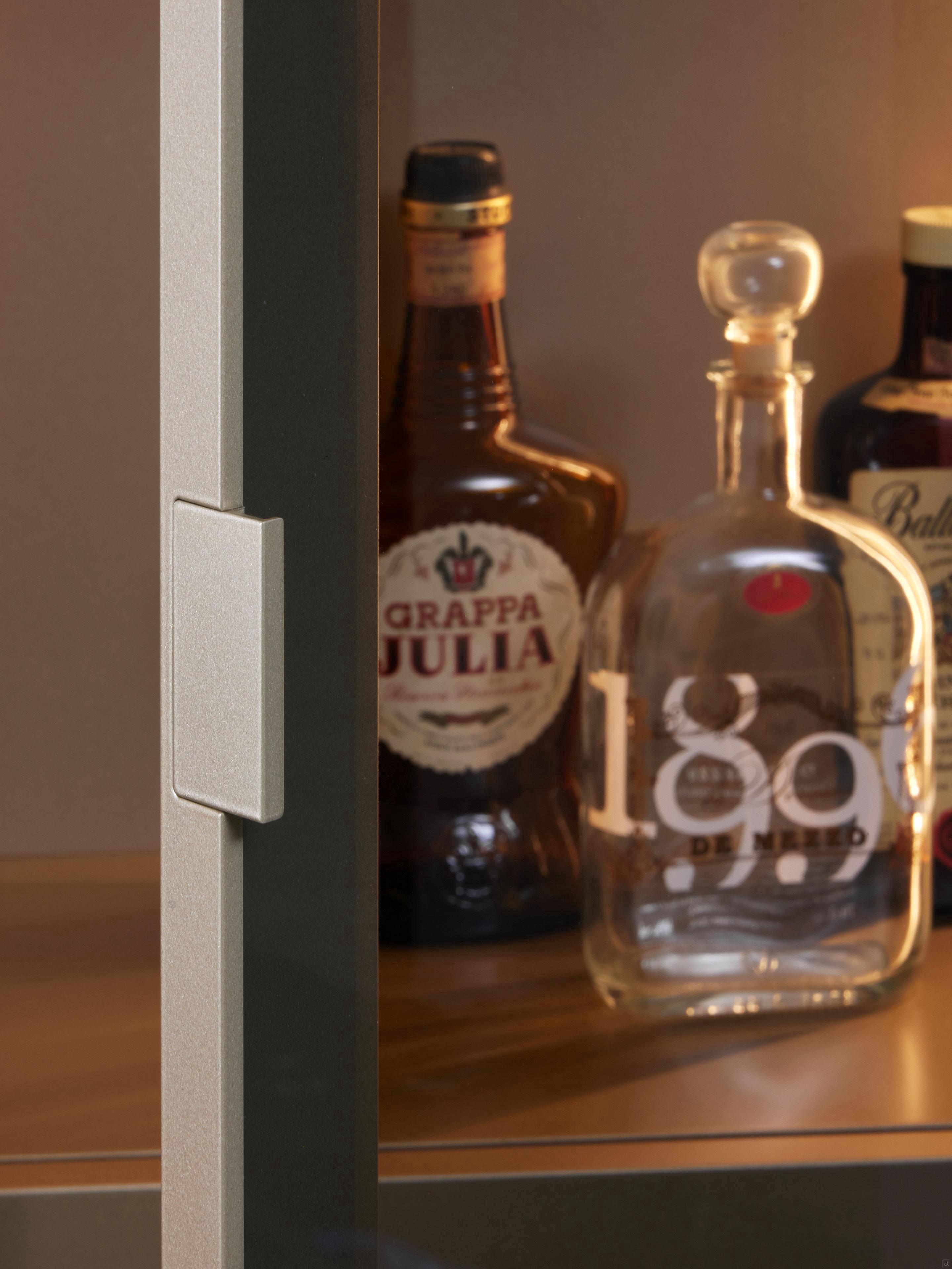 Struttura e Frontali Basi, Vetrina e Colonna Battente: realizzate in pannelli in particelle di legno cm sp.2. Rivestite con nobilitazione sintetica anche laccata opaca, lucida, metallizzata o con piallaccio di legno verniciato. La laccatura lucida si intende estesa solo all'esterno dei fianchi e ai relativi bordi perimetrali. Interno e schiene sono forniti con il corrispondente colore laccato opaco.  Il frontale della vetrina è realizzato con telaio strutturale in alluminio, laccato opaco, metallizzato oppure epossidico. Il vetro è temperato, cm sp.0,4.