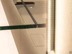 n.1 Spiegel nach Maß mit einer Breite von 97 bis 135 cm, Höhe 80 cm, erhältlich in zwei Modellen: „mit Glasablage“ 9 cm stark, 1 cm und LED-Beleuchtung mit oberem Strahler Mod. Fly und Hintergrundbeleuchtung auf den anderen 3 Seiten. Oder „mit Rahmen“, 9 cm stark, aus konserviertem MDF, lackiert nach RAL, passend zu den Sockeln und mit LED-Hintergrundbeleuchtung an den 4 Seiten.