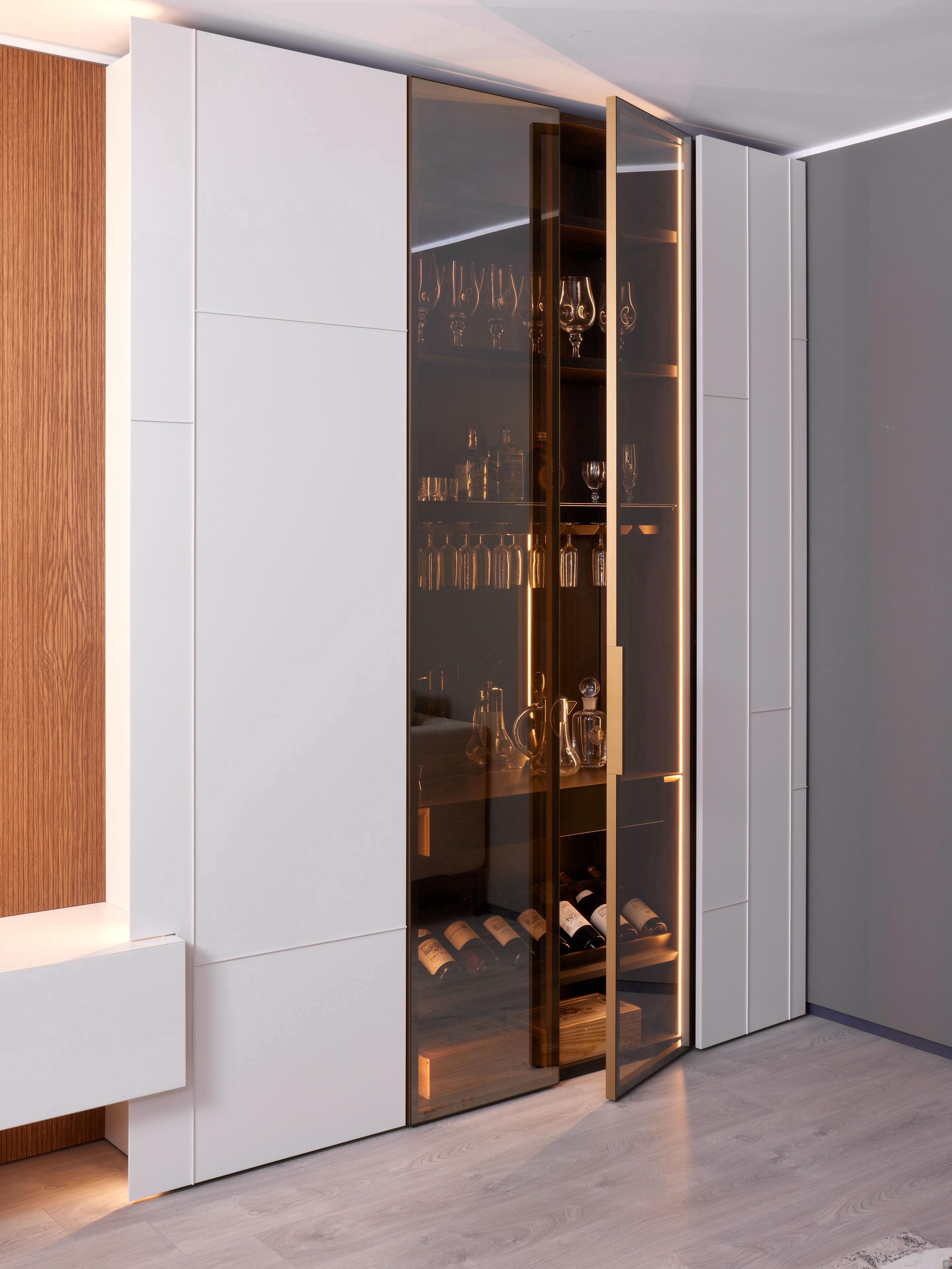 Scharniere: Metall in Titanausführung, mit serienmäßiger langsames Schließen. Der Standard-Öffnungswinkel beträgt 110°, der bei Holz- und Lacktüren auf 155° erhöht werden kann (außer bei Plissee-Türen, die nur mit 94°-Öffnungsscharnieren geliefert werden). Der Standard-Öffnungswinkel für Glas- und Cremetüren beträgt 94°, der auf 170° vergrößert werden kann. Holz- und lackierte Drehtüren sind bis zu einer Höhe von 280 cm mit langsamen Metallscharnieren Nr. 4, bei größeren Höhen mit Scharnieren Nr. 5 ausgestattet. Glas- und Keramiksteintüren hingegen haben nur 2 Scharniere, die sich am unteren und oberen Ende des Schranks befinden.