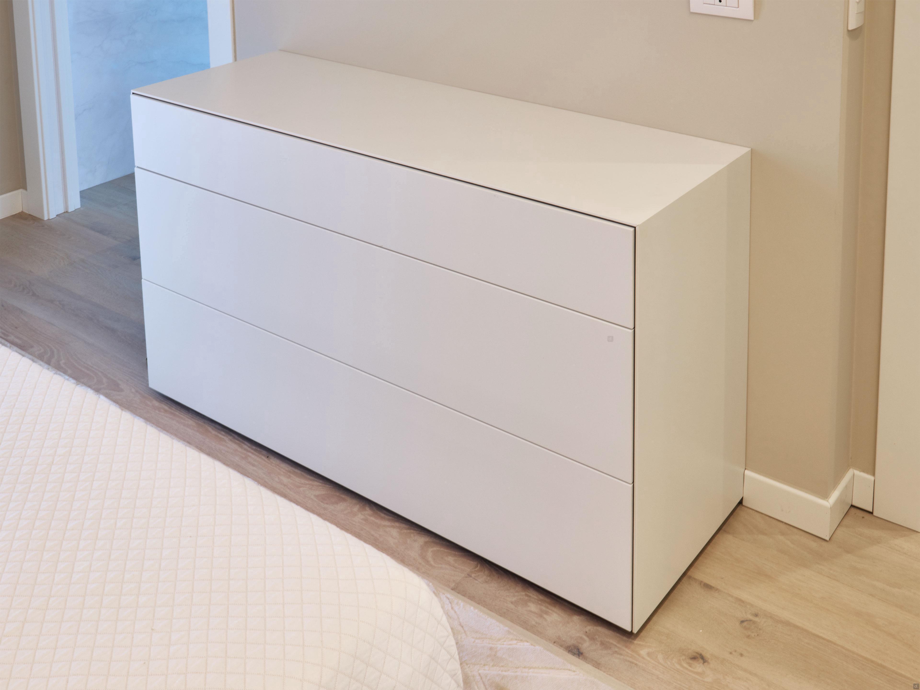 Avana sleek no-handles dresser with 3 push-pull drawers comes also as high chest with 4 or 5 drawers. Each model is available in lacquer, wood, open pore or melamine finishes in numerous colours, can be also fitted with black plastic low feet or with high metal ones that are available painted or lacquered in all the colours of the Sample page. The drawers are fitted with soft-closing mechanism that guarantees an extreme comfort. Avana is ideal in combination with other products from the same collection: bedside tables, big drawers and desk to create compositions in your bedroom.