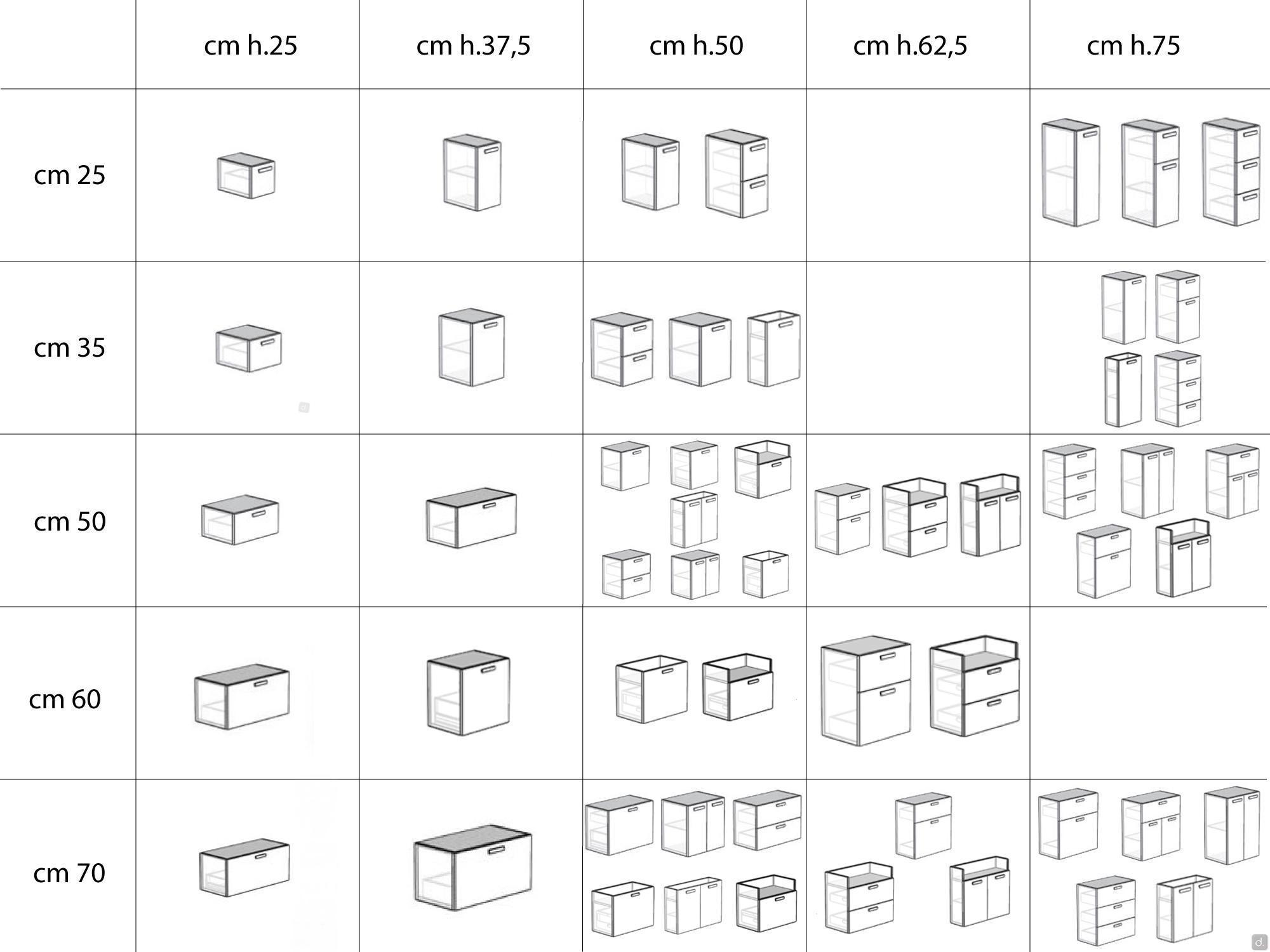 Height: cm 25 / 37,5 / 50 / 62,5 / 75 + thickness of top and possible floor support
