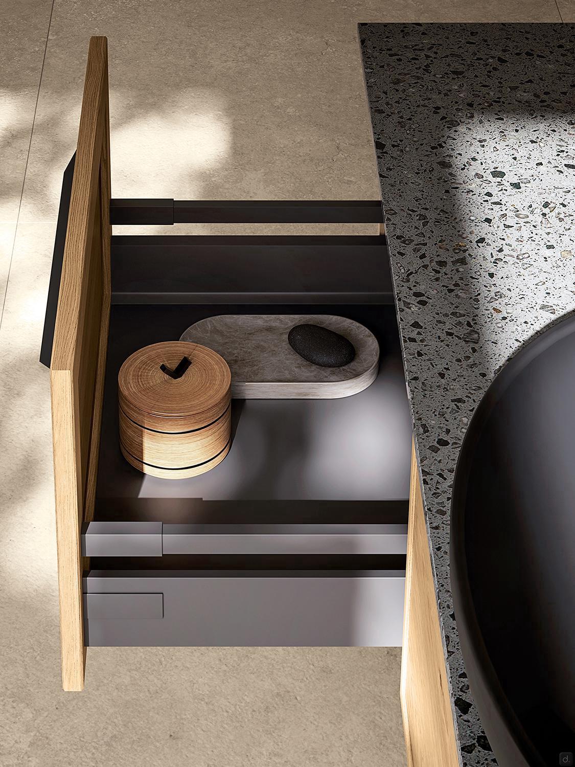 Legrabox Drawer: characterised by straight sides both internally and externally, only 1.28 cm thick. Equipped with metal body with full-extension runners and slow closing.