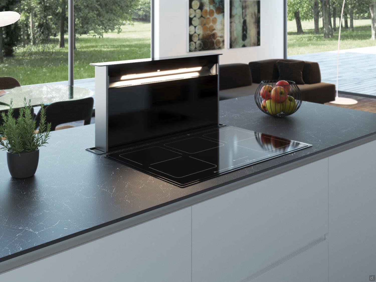 KLab Line 05 is a black and white kitchen with island with cook top. The furniture is made to measure, with total white cabinets and a black laminan top, combined with black lacquered open shelves. Oven, microwave and wine cellar are integrated inside two tall columns, completed by two other larder units to be used as pantry. The wall is completed by horizontal floating cupboards, and by floor units on which the sink and the large worktop are located. At the centre of the space dedicated to the kitchen is the large equipped island with an induction hob that blends in perfectly with the black top. The Klab Line 05 project is designed for people who love a minimalist style enriched with valuable accessories, such as the wine cellar and a set of high-performance appliances. The kitchen features large worktops, functional and strategically placed according to an ergonomic scheme.The black and white look with handle-less doors makes KLab Line 05 the ideal choice in modern open plan apartments and villas. Here the need to combine living room and kitchen makes it necessary to design a solution in which essential aesthetics are combined with the possibility of customising every detail.
