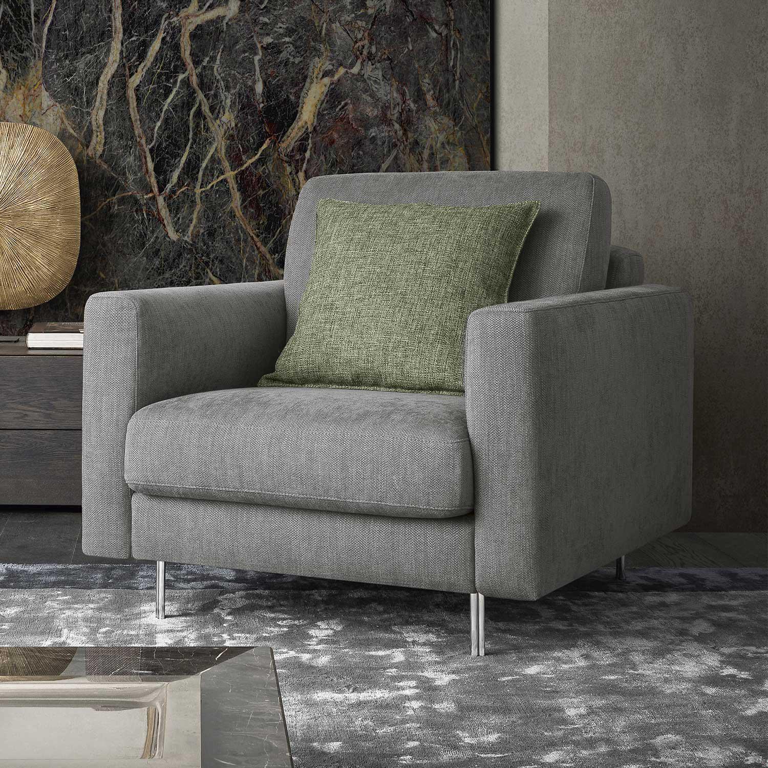Technical Specifications and Equipment Structure: fir solid wood slabs in different thicknesses. Structure and sides in multilayer fir mm 18, plugging parts in wood agglomerate 4 and 18 mm thick. The whole structure is naturally processed in E1 class with low formaldehyde emissions, all covered in 100% thermo-coupled polyamine interliner in polyesther expanded foam and/or resin wadding 200 gr 100% polyester.Filling: seat in crush-proof flexible expanded polyurethane foam with density D27 M covered in 100% polyester staple 300 gr thermo bonded wadding. Seatback cushions in crush-proof flexible polyurethane foam in density D18, covered in 300 gr thermo bonded wadding 100% polyester. Crush-proof expanded polyurethane foam buffers in D21, DPK 40, crush-proof armrest in D30 covered in 200 gr resin wadding 100% polyester.Coil Springs: in 80 mm mechanically stretched tapes made of spiral wrapped nylon wire.Feet: epoxy painted and chrome-plated metal feet.