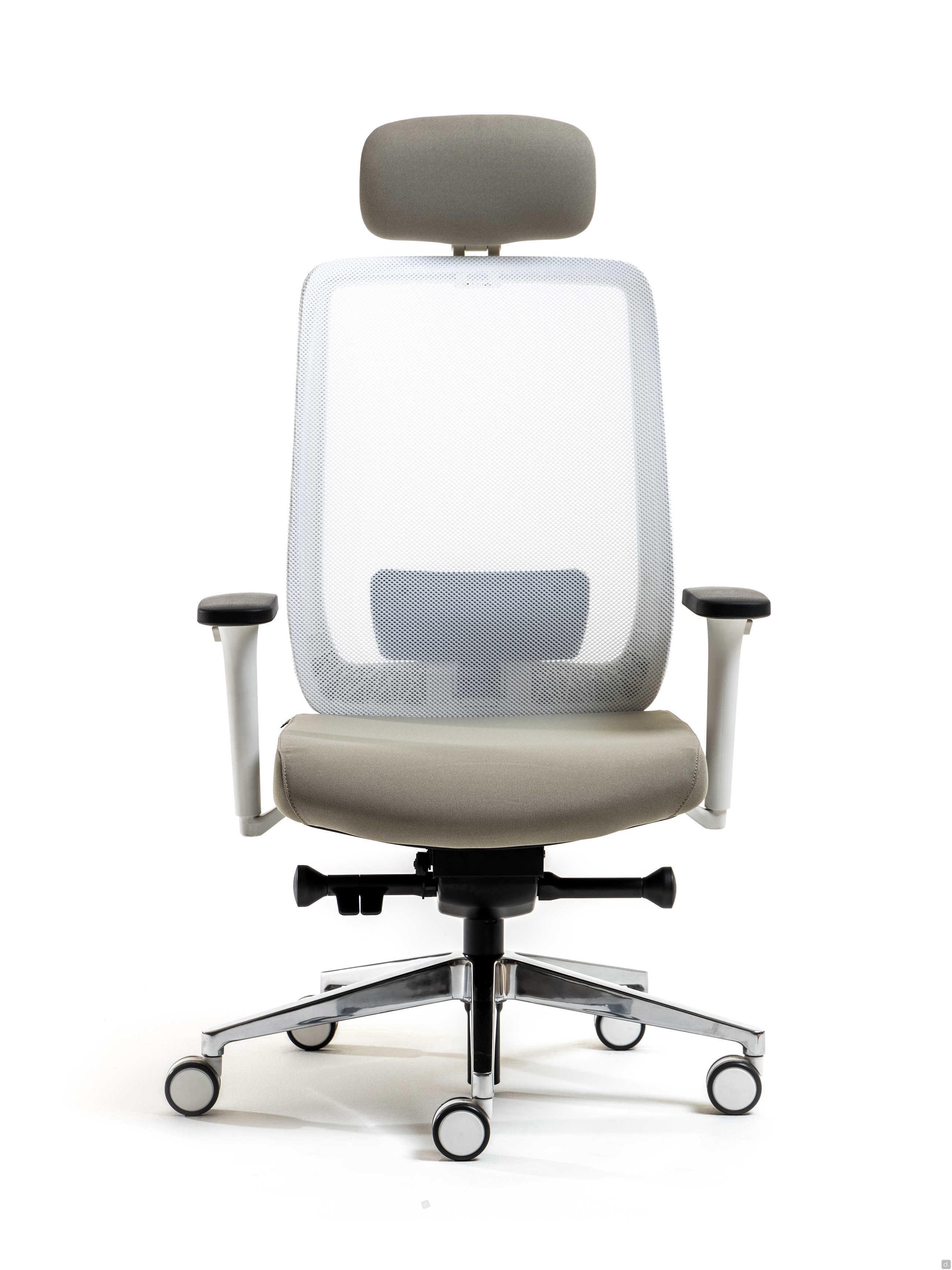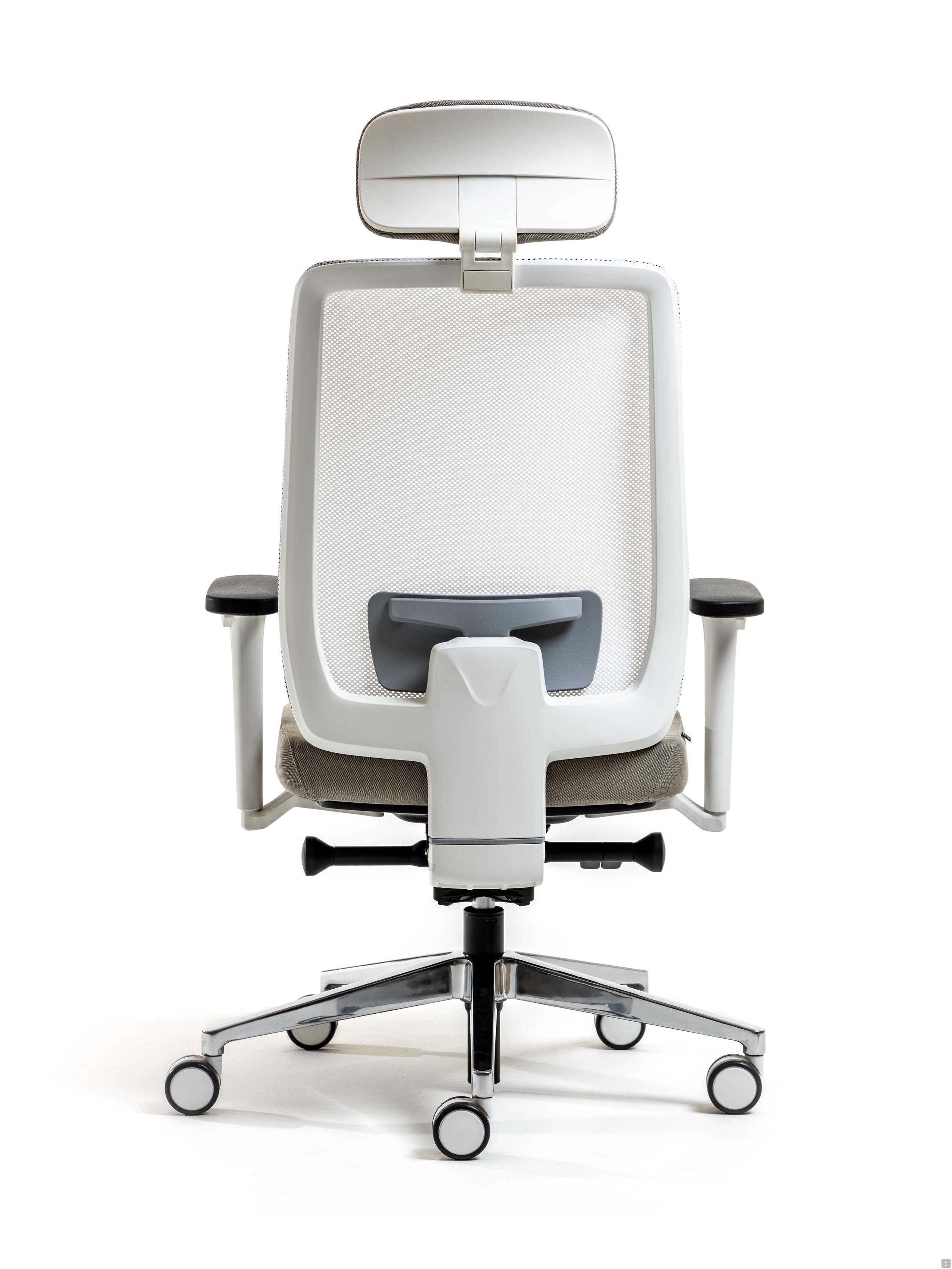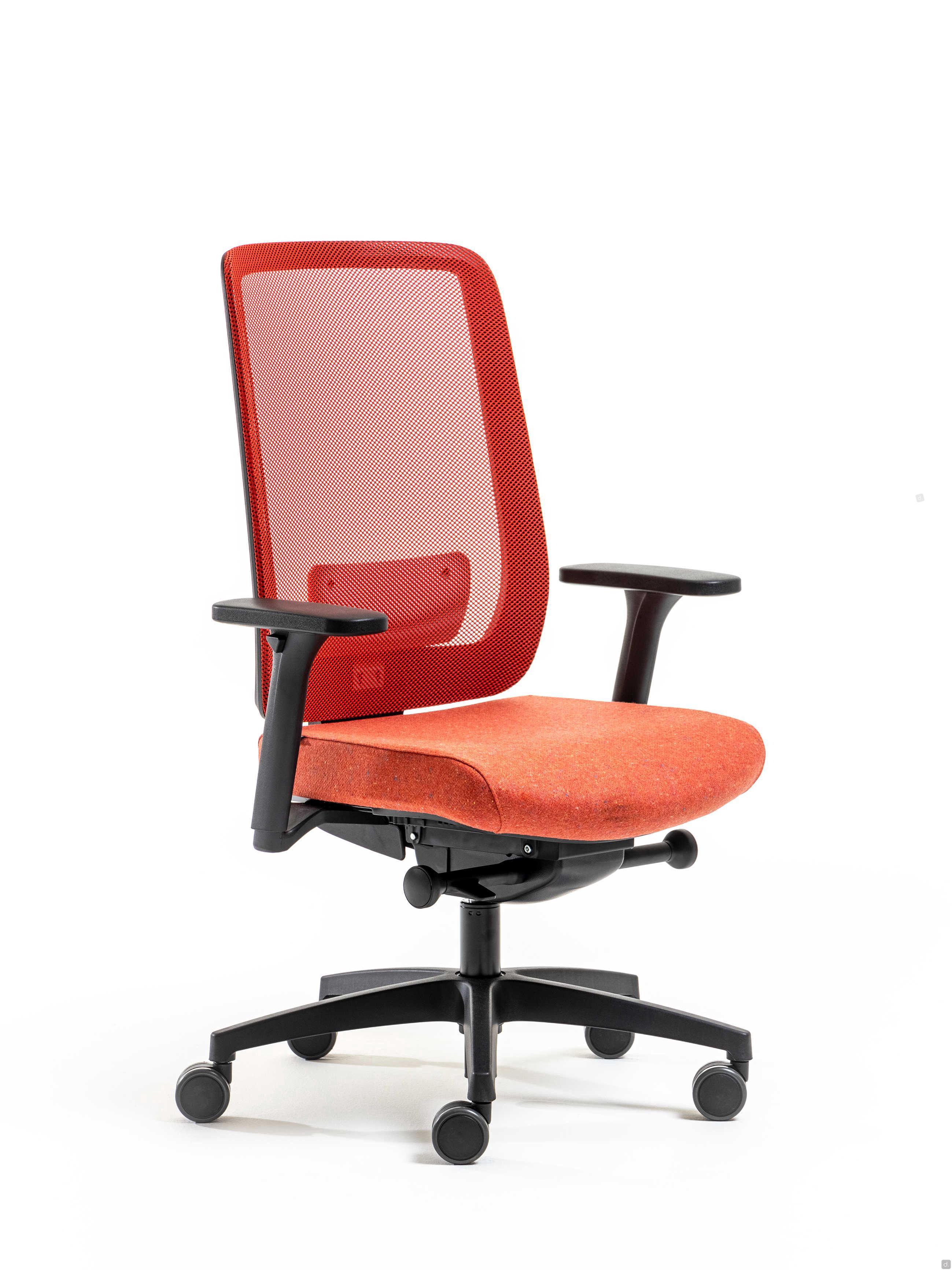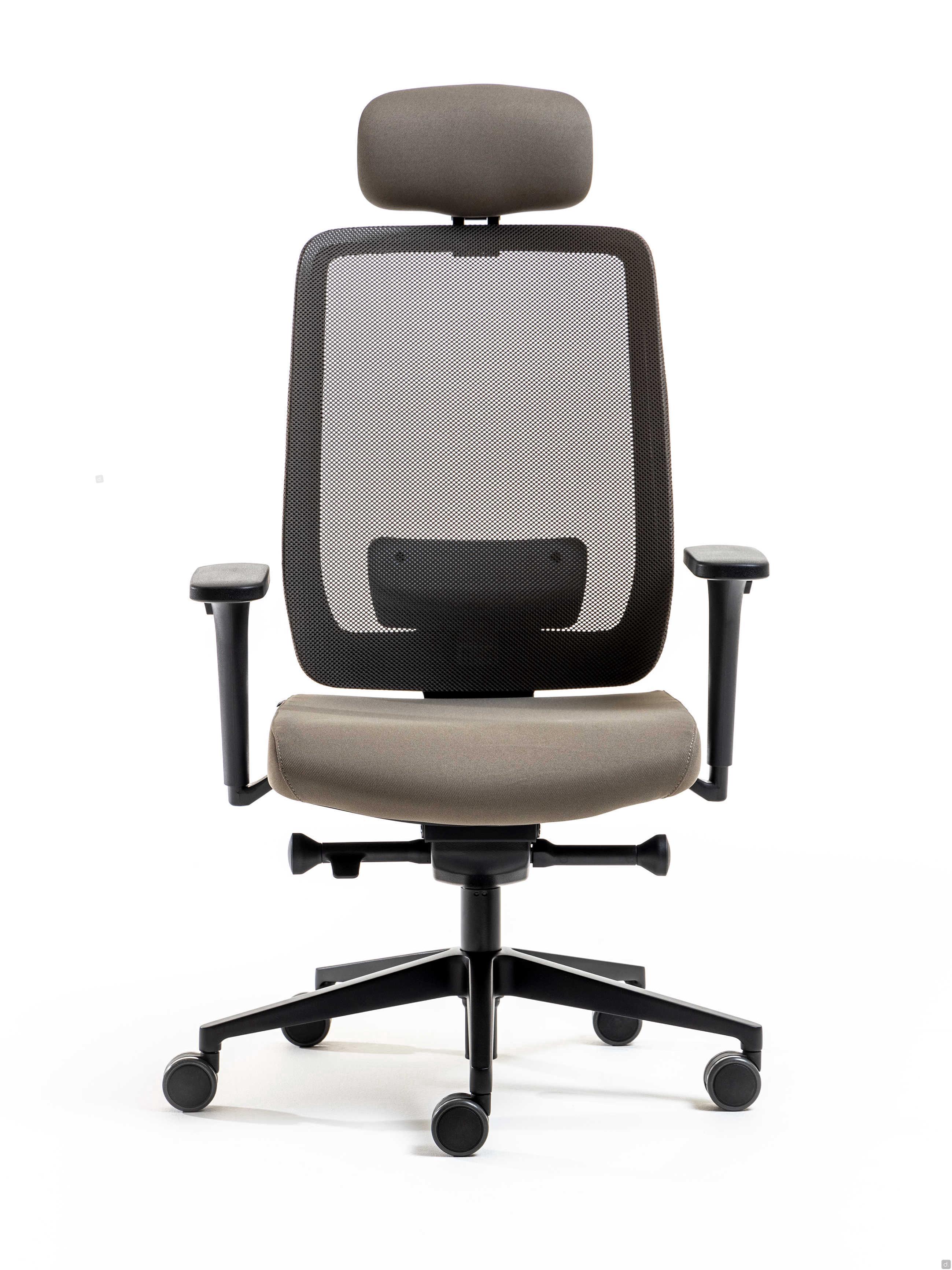 Elon is a computer chair with mesh backrest, available with or without armrests, the backrest is breathable and available in white, grey or black with adjustable lumbar support in soft polyurethane. Elon has a swivel base and is adjustable in height, furthermore the seat depth can be moved and thanks to the synchronous mechanism it is possible to move seat and back together. The seat is upholstered and covered and is available in many colours, either in fabric or faux leather.