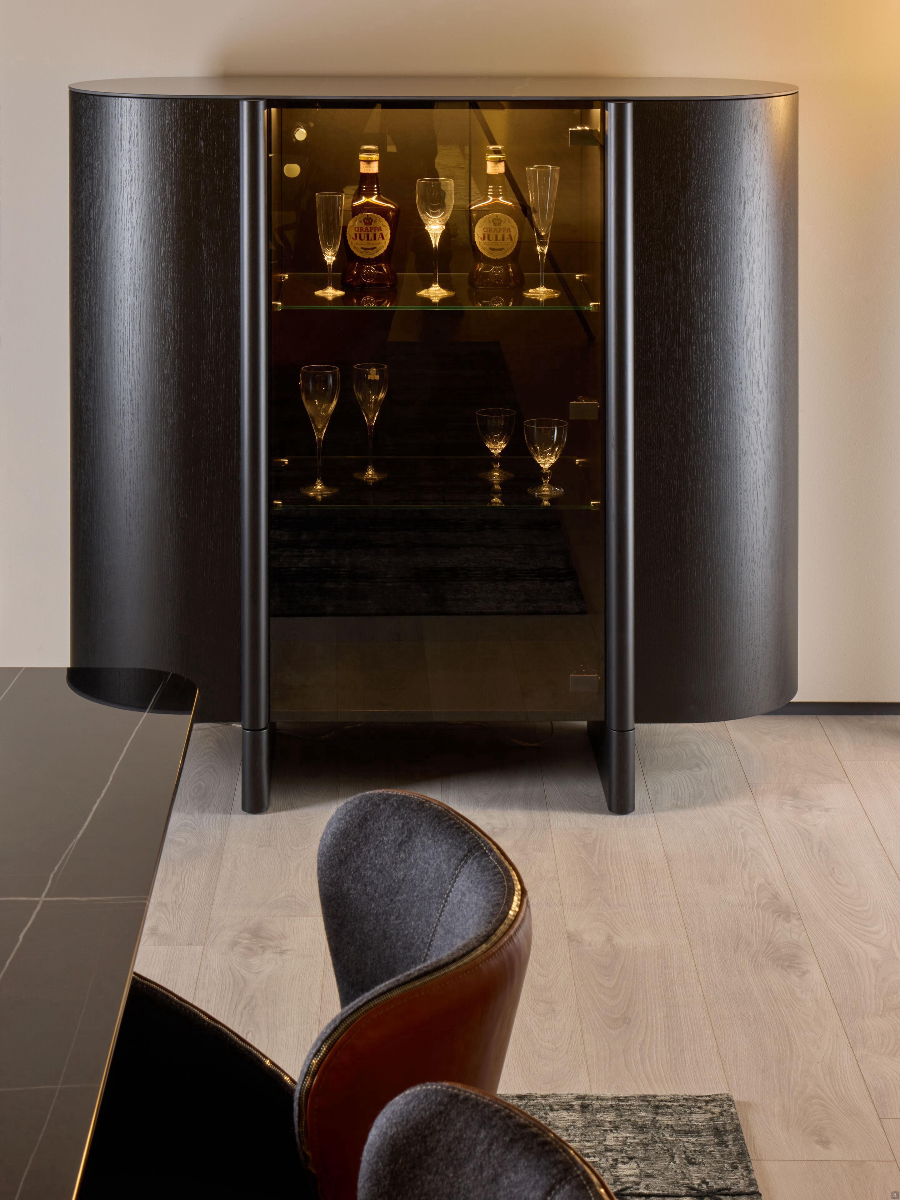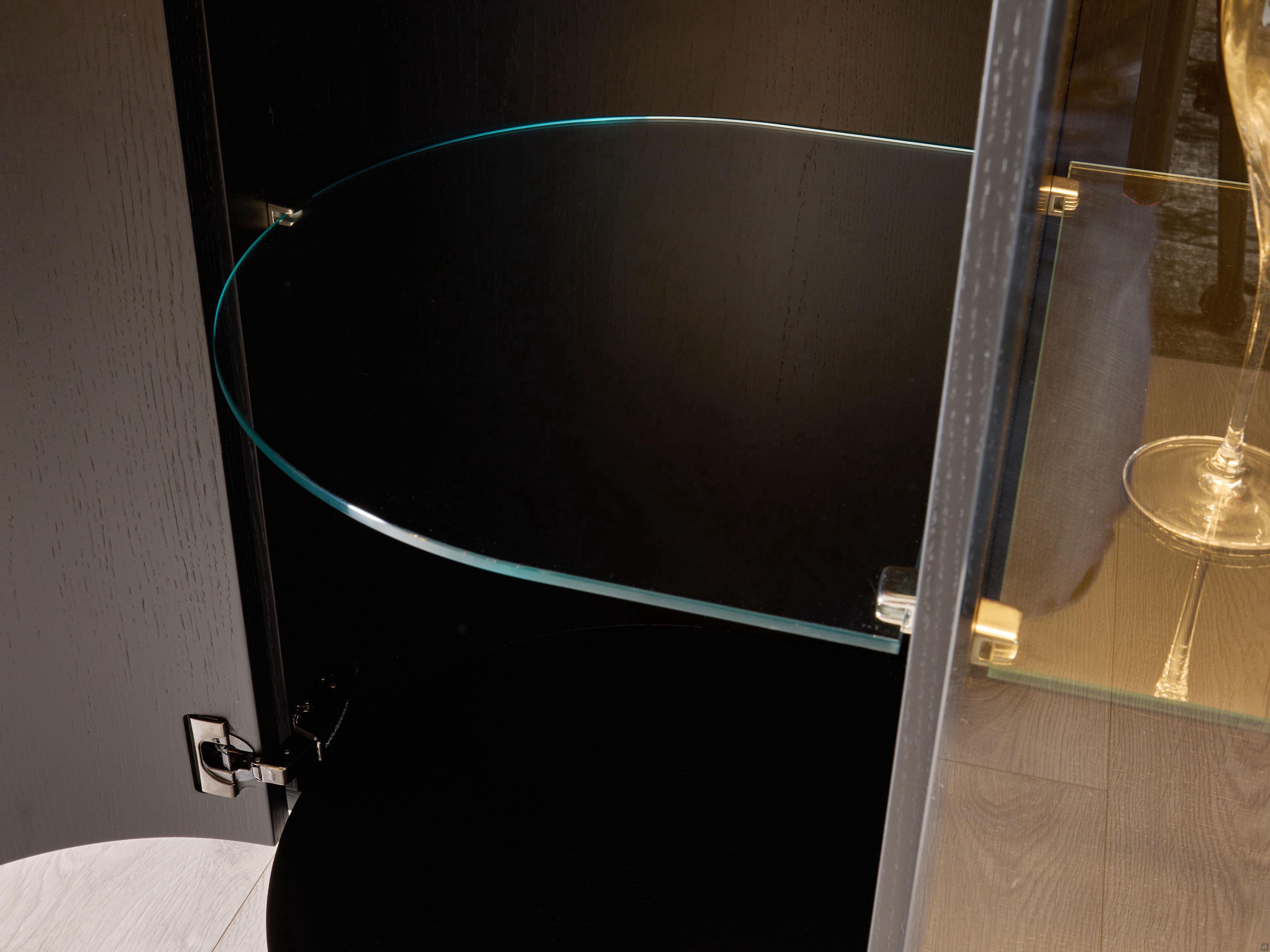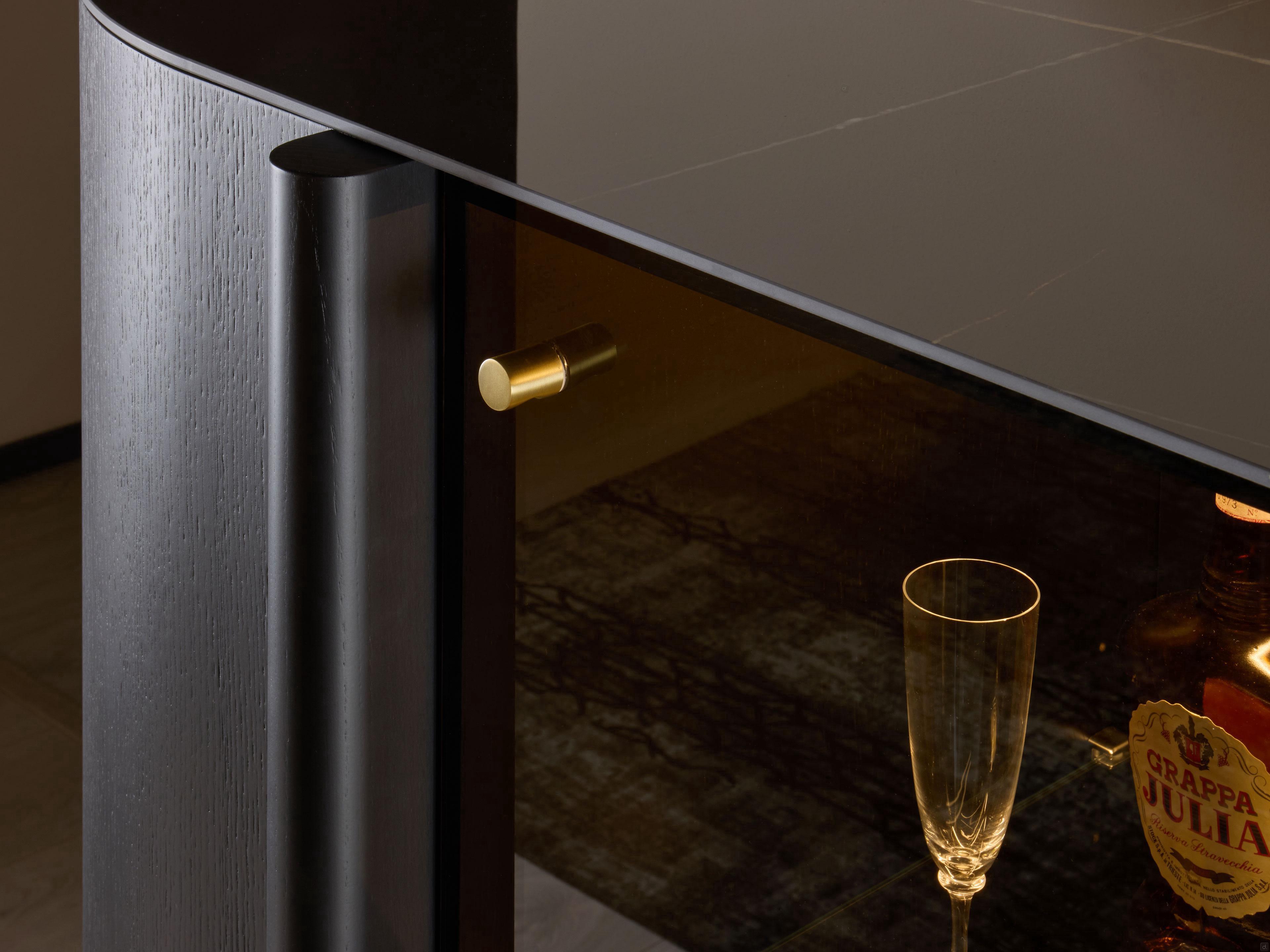 Materials and Finishes - structure: Blockboard Ash with Absolute Black colour- central door: Smoked glass- top: Sahara Noir ceramic- internal shelves: transparent glass
