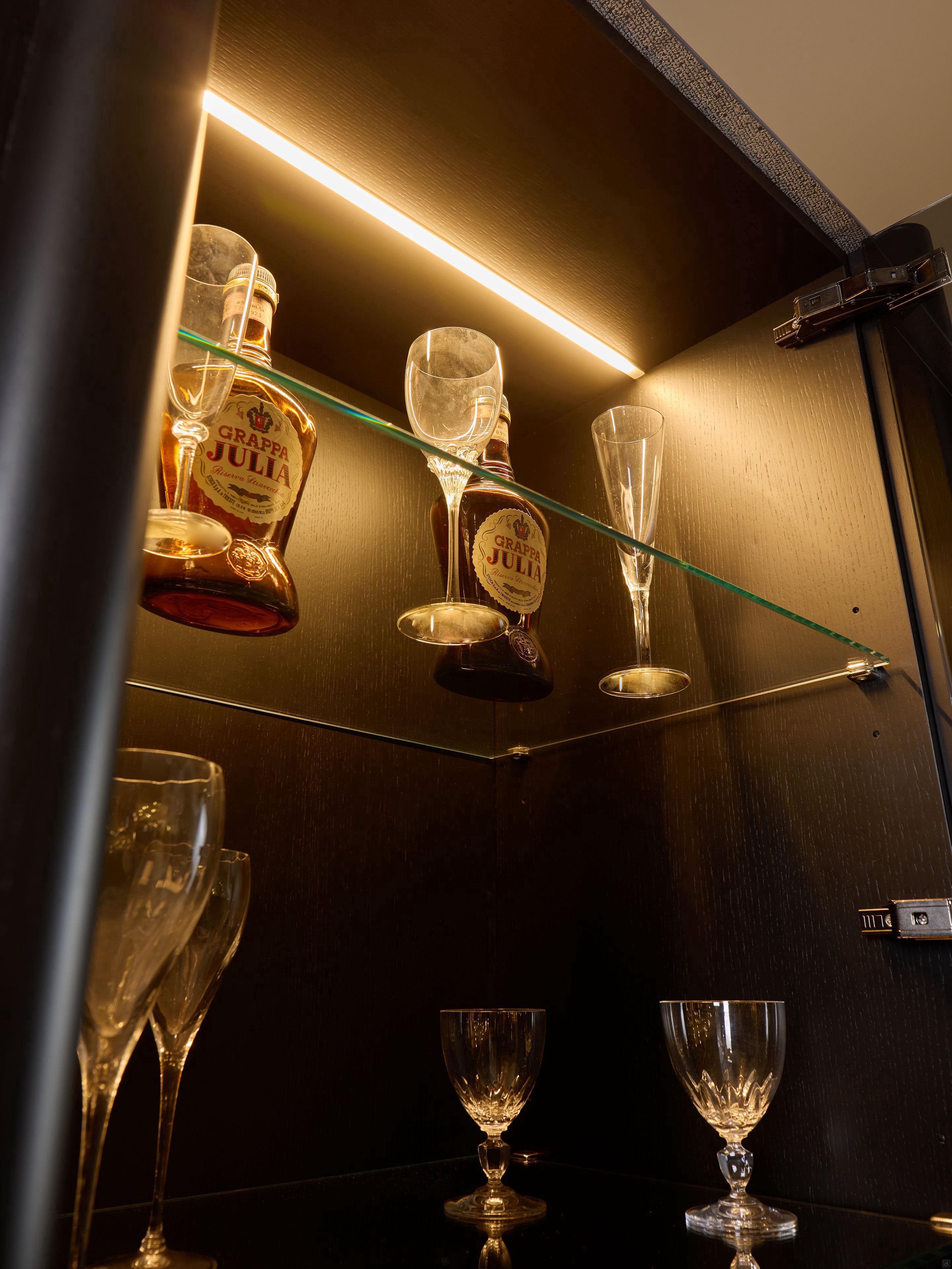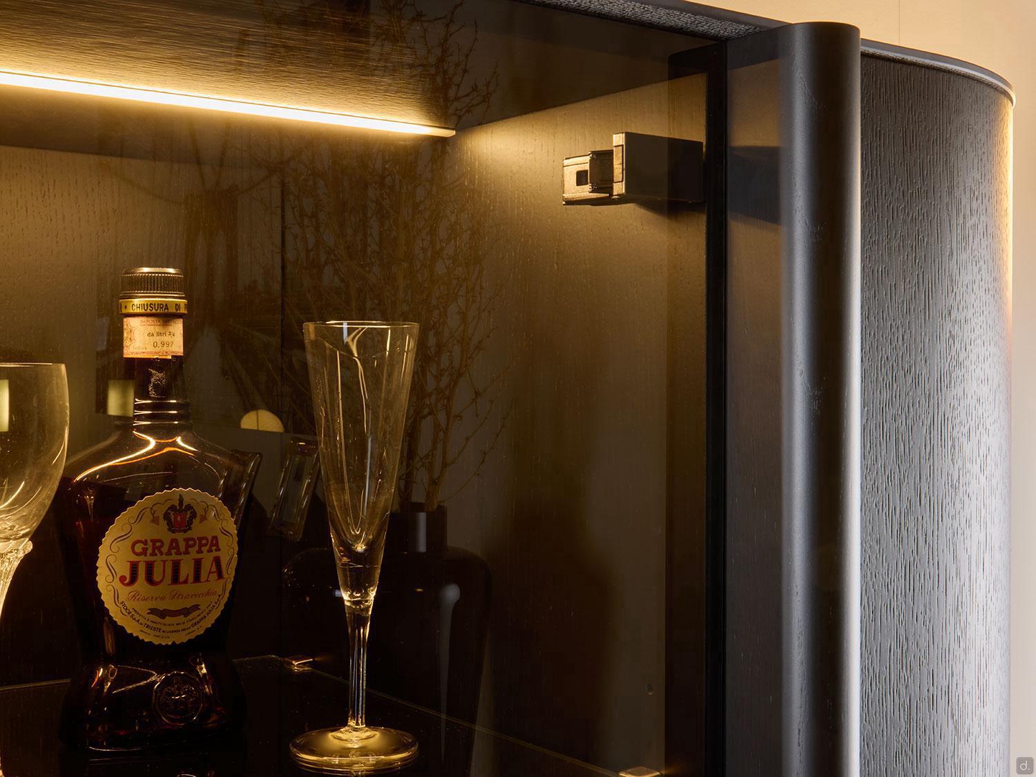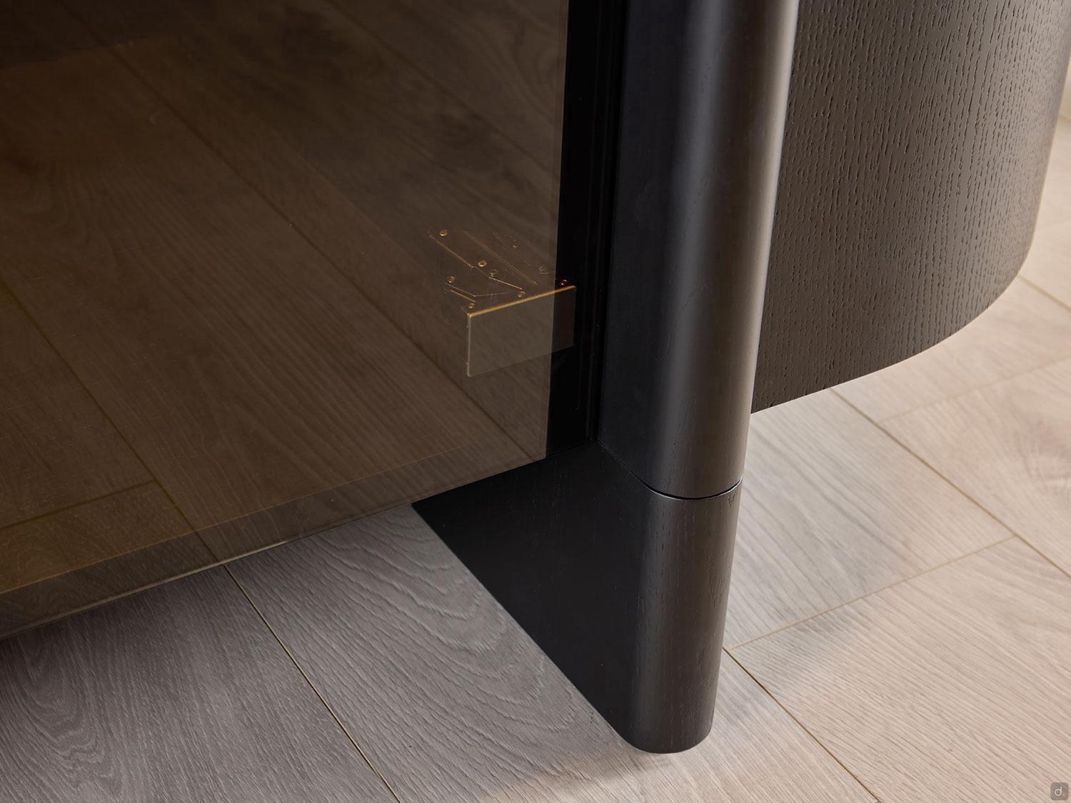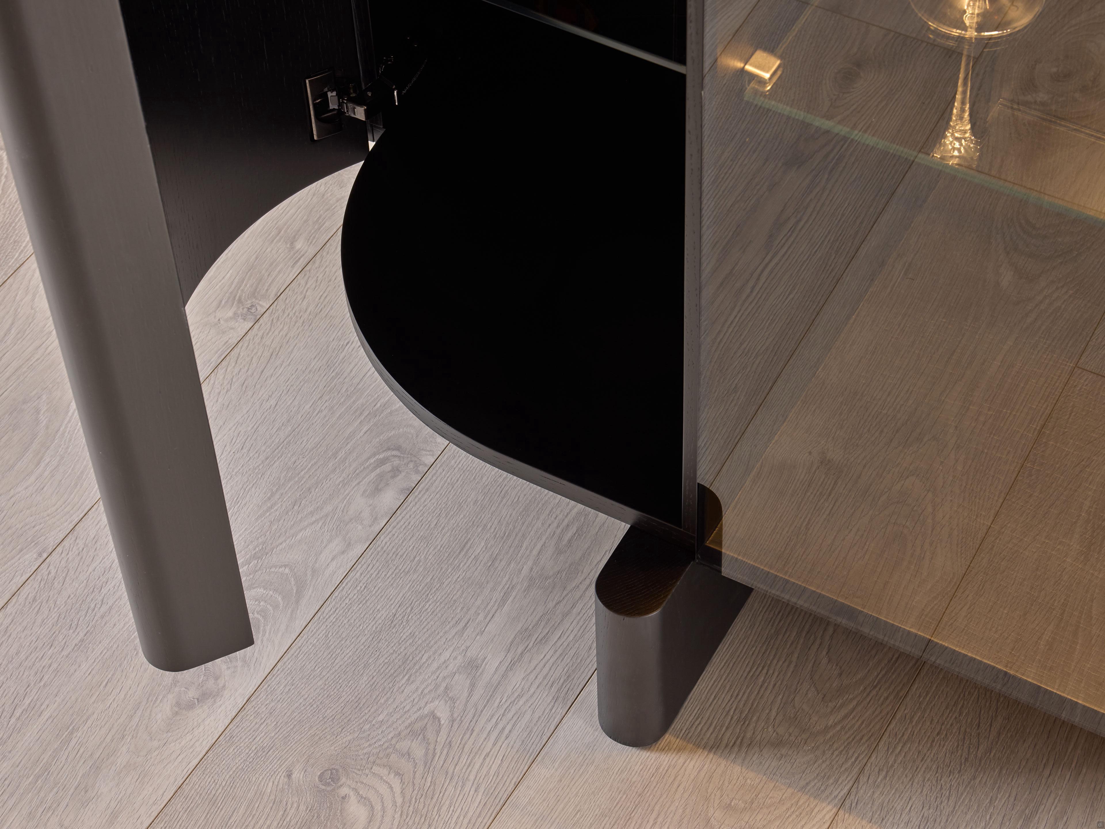 Materials and Finishes - structure: Blockboard Ash with Absolute Black colour- central door: Smoked glass- top: Sahara Noir ceramic- internal shelves: transparent glass