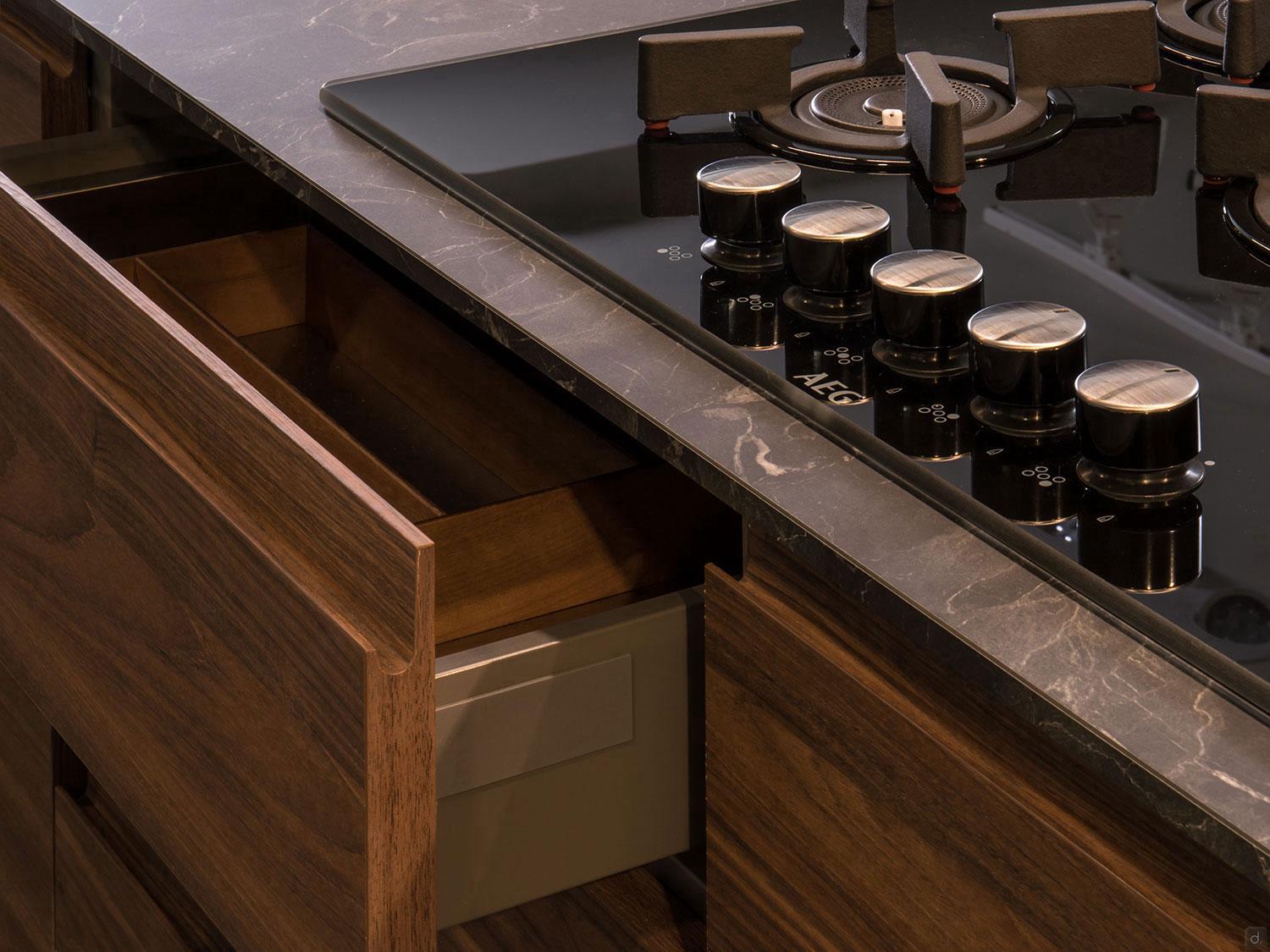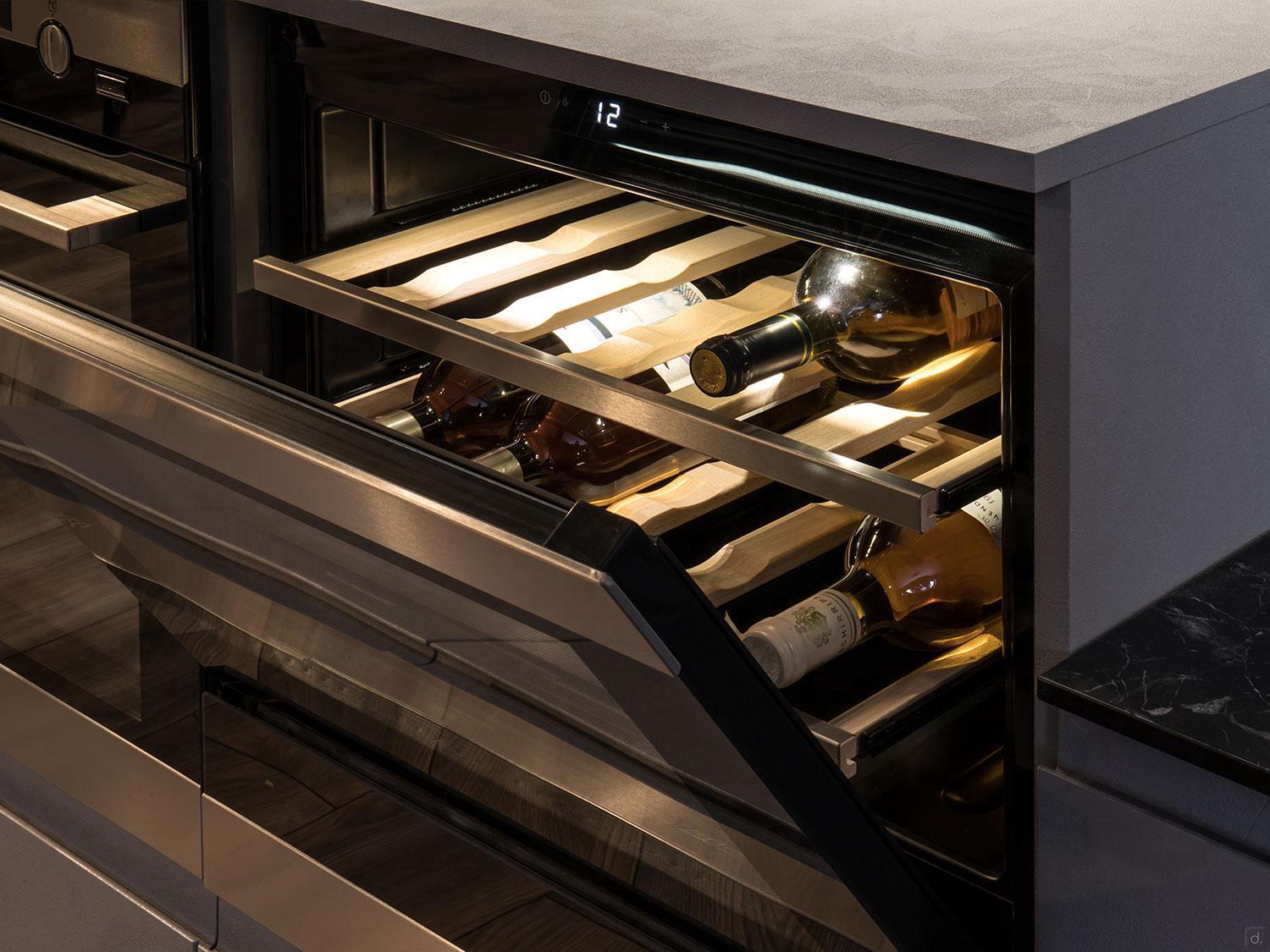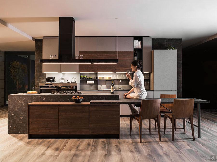 Numa Nine is an eat-in kitchen with island, central hob and integrated dining table, completed by a linear wall kitchen with fridge column, sink, wall units, oven and wine cellar inserted in the half columns. Ideal for spacious environments, large kitchens and open spaces, this solution combines aesthetics and practicality. On the one hand, we find skilfully matched materials, a ceiling-mounted cooker hood and under-cabinet lighting; all details that make it possible to insert these furnishings in a modern environment, carefully studied from the point of view of design. But in a kitchen the aesthetic must be combined with functionality and Numa Nine does this in many ways: with a large worktop, high wall units, a back panel equipped for utensils, an integrated dining table and even a sideboard that adds extra storage space.