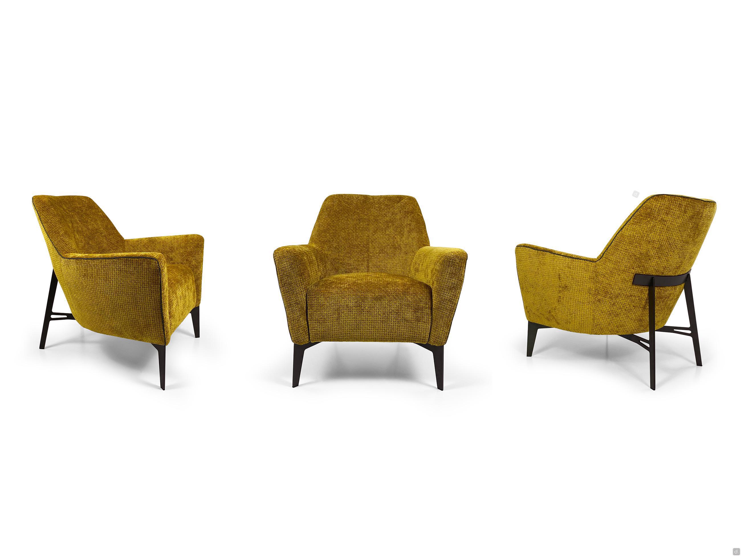 Model and Measurements- cm 77 d.78 h.80Depth: - seat: cm 53Height: - seat: cm 44- armrest: cm 59- legs: cm 20Materials and Finishes Upholstery: - fabric, velvet, leather (non-removable)Base:- powder-coated metal, matt lacquer, glossy lacquer- solid oak wood or Canaletto walnut