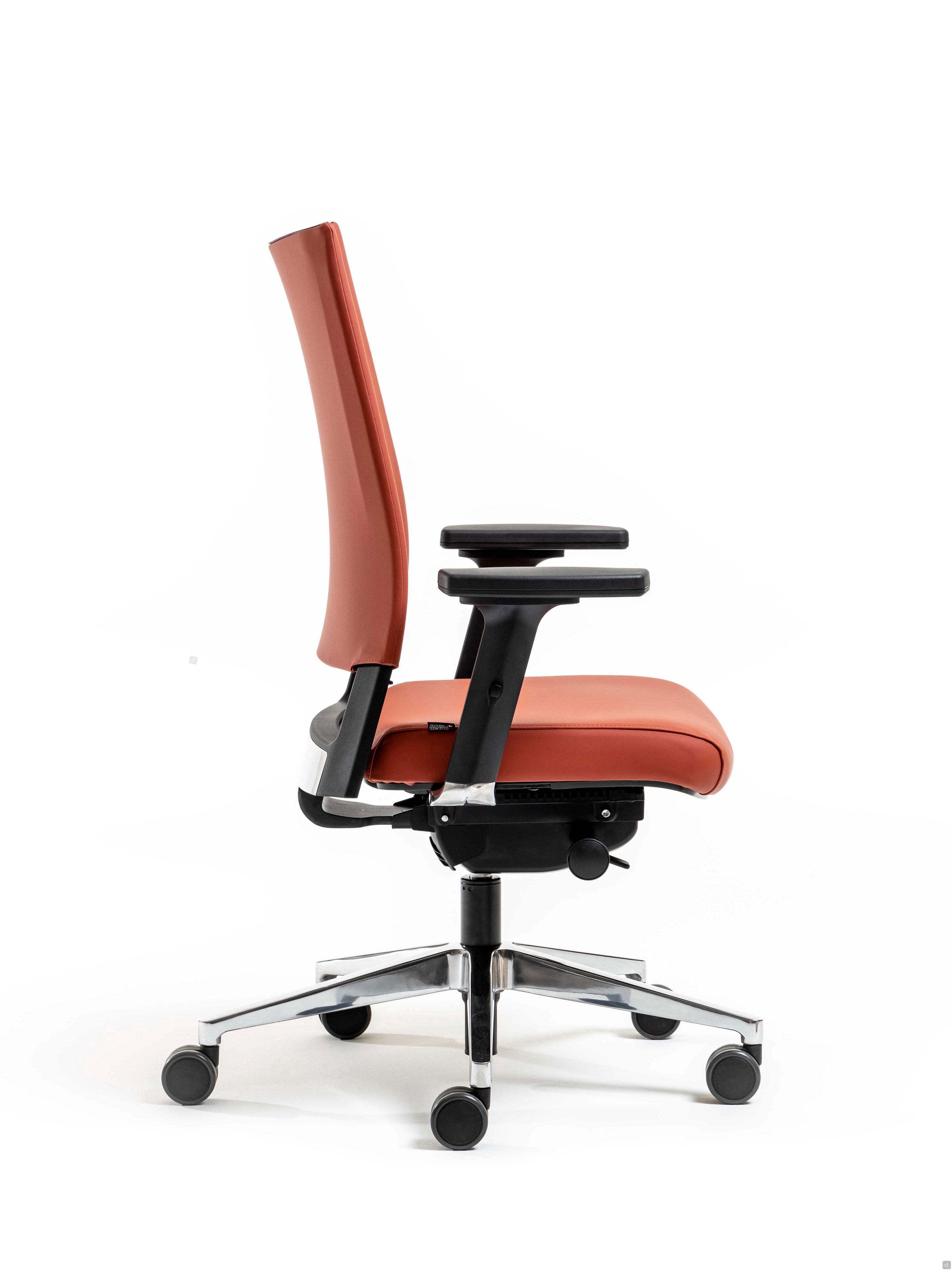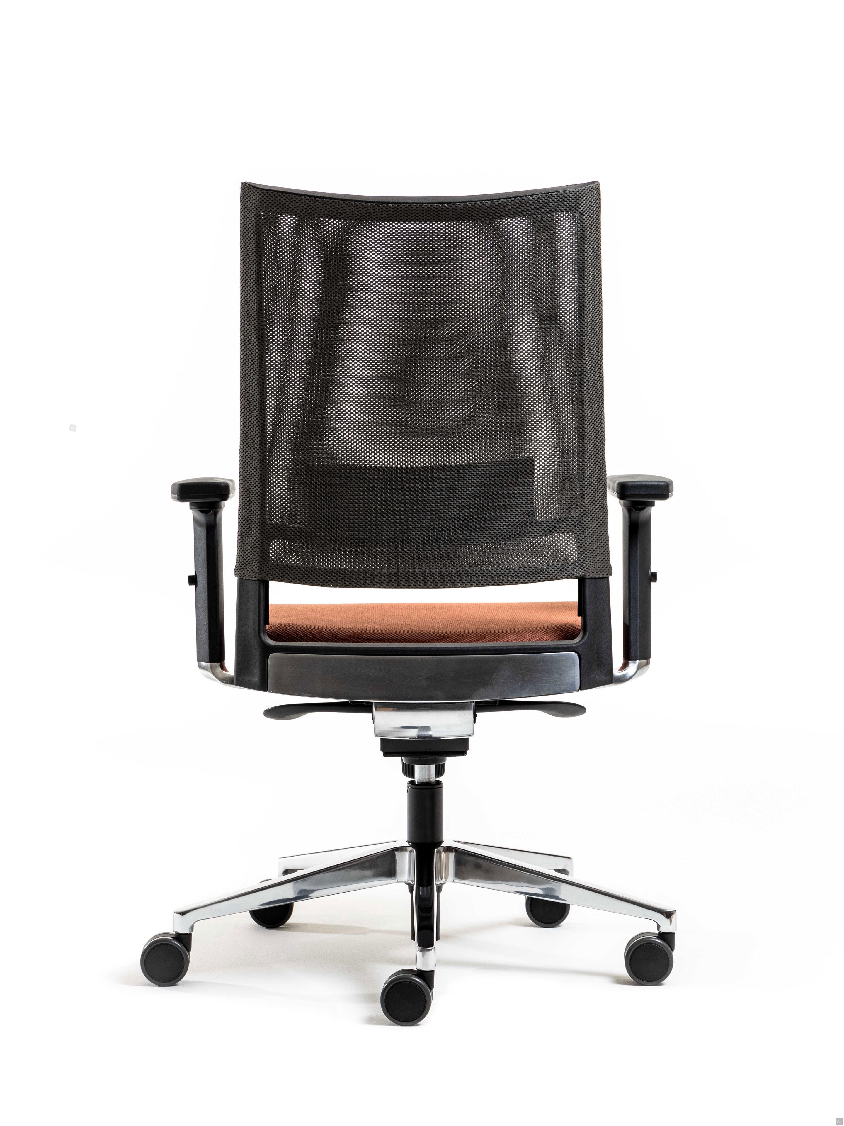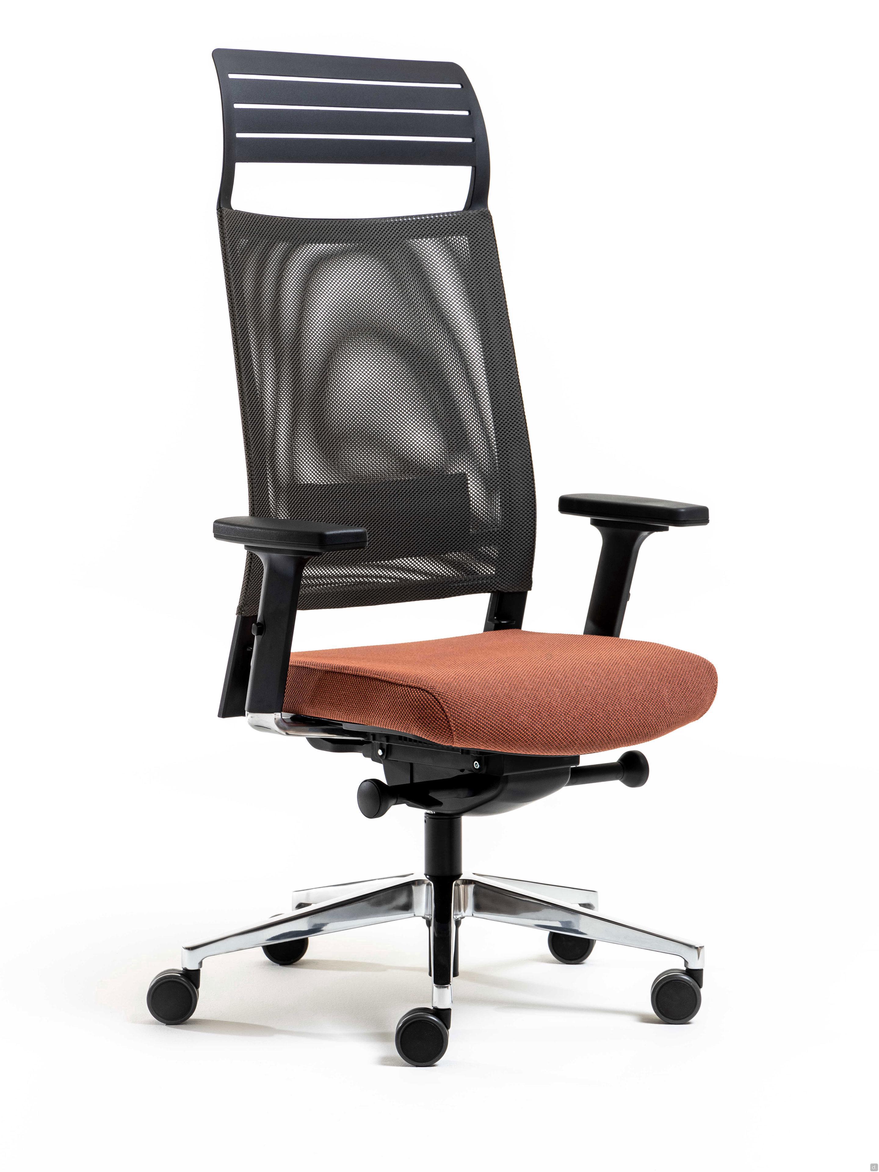 Model and dimensionsModels: operative, executiveDimensions: view dimensions in the ConfiguratorDepth: - seat: cm p.43,5Height:- seat: adjustable from cm h.42 to 54- Armrests: adjustable from cm h.60 to 82Materials and FinishesSeat Covering- fabric, leatherette, leatherBackrest- mesh- fabric, leatherette, leatherArmrests:- polypropyleneBase:- polyamide- aluminium
