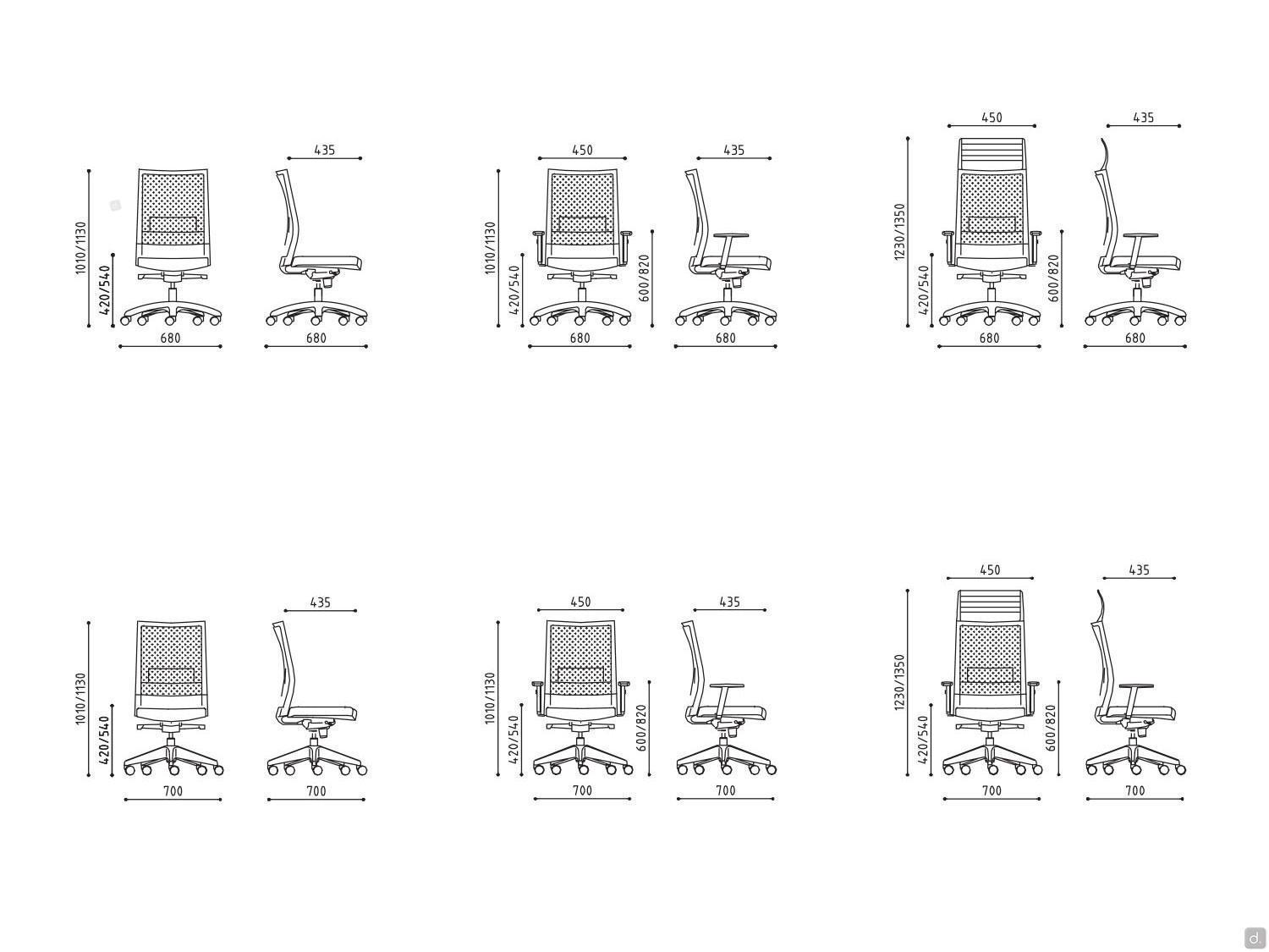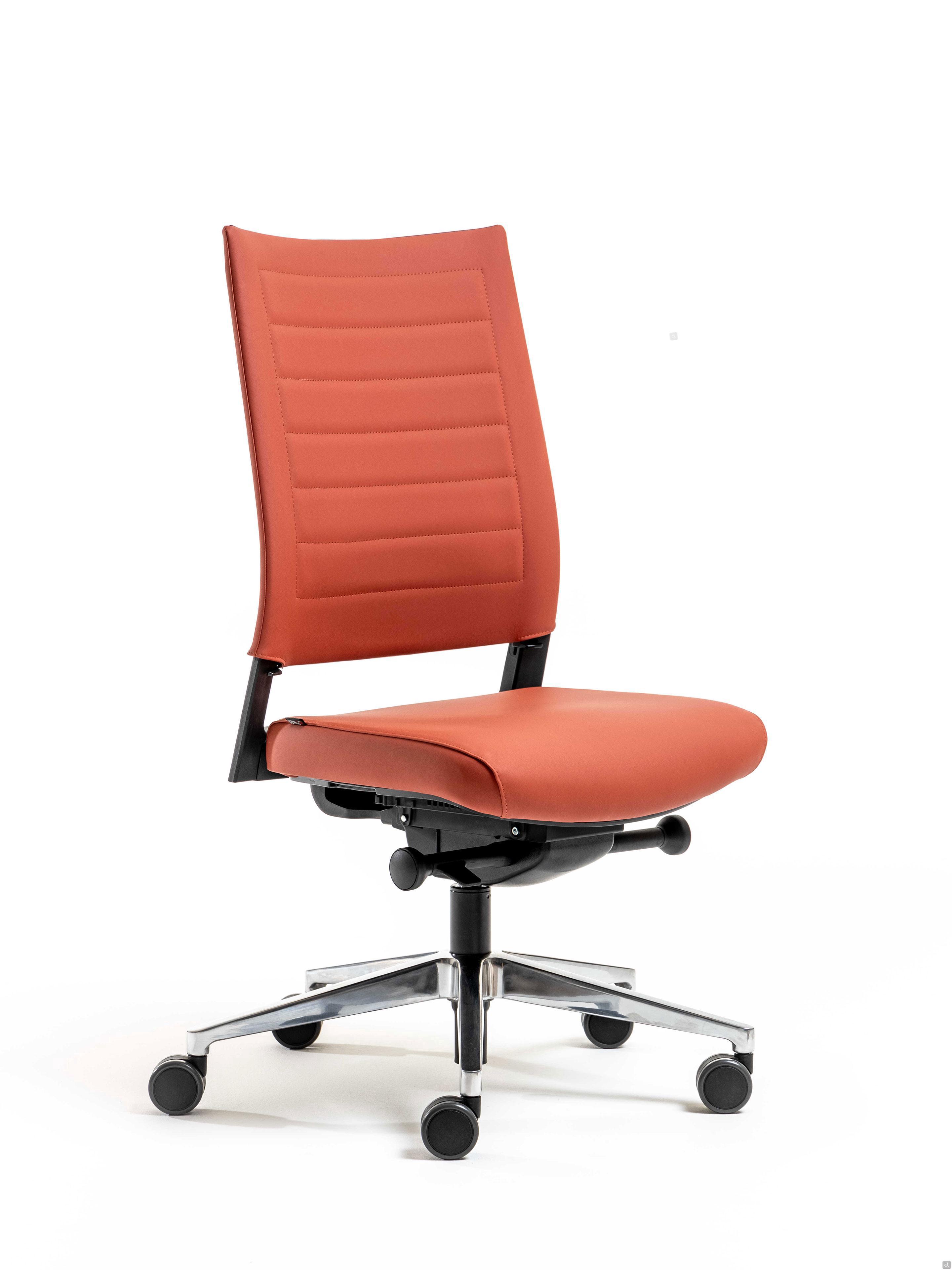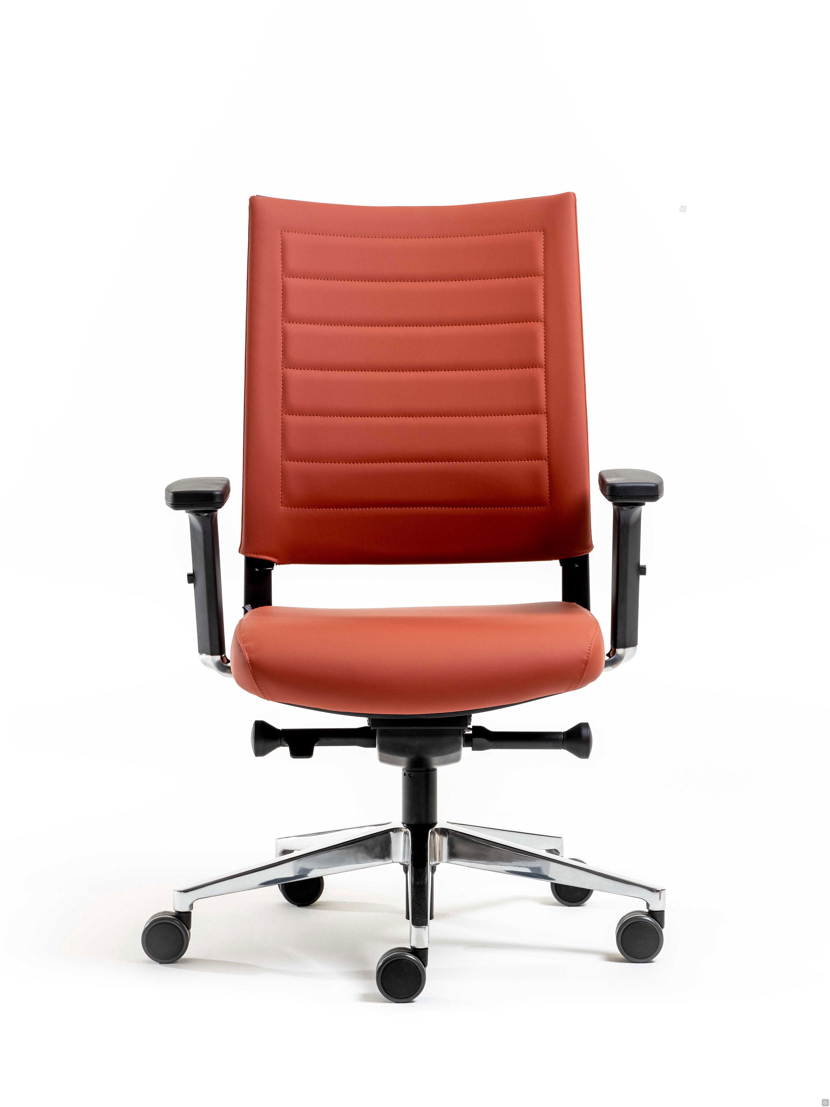 Model and dimensionsModels: operative, executiveDimensions: view dimensions in the ConfiguratorDepth: - seat: cm p.43,5Height:- seat: adjustable from cm h.42 to 54- Armrests: adjustable from cm h.60 to 82Materials and FinishesSeat Covering- fabric, leatherette, leatherBackrest- mesh- fabric, leatherette, leatherArmrests:- polypropyleneBase:- polyamide- aluminium