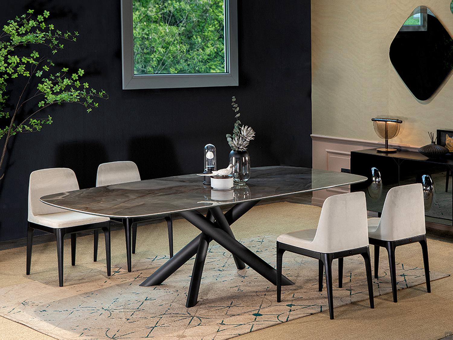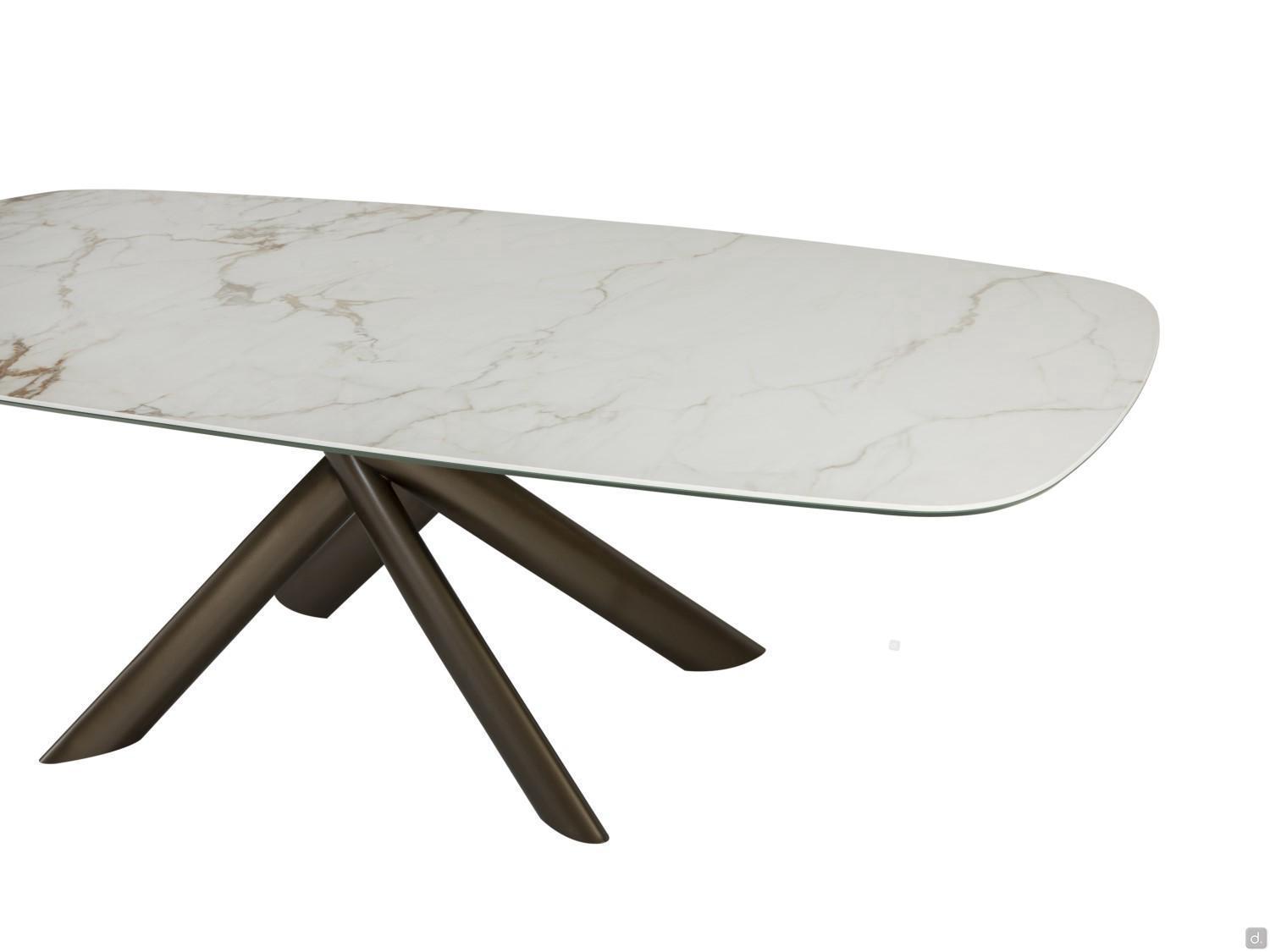 Gres porcelain stoneware top: made up of the combination of a 10 mm thick lower glass slab with a 6 mm thick upper ceramic slab. Porcelain stoneware is a compact, frost-resistant material that is also resistant to chemicals. Externally, the most valuable characteristics of the material are the variations in colour, veining and the subtle speckles: these are diversifications specifically designed to recreate the randomness and beauty of natural materials.