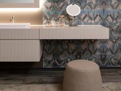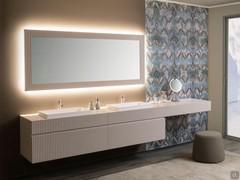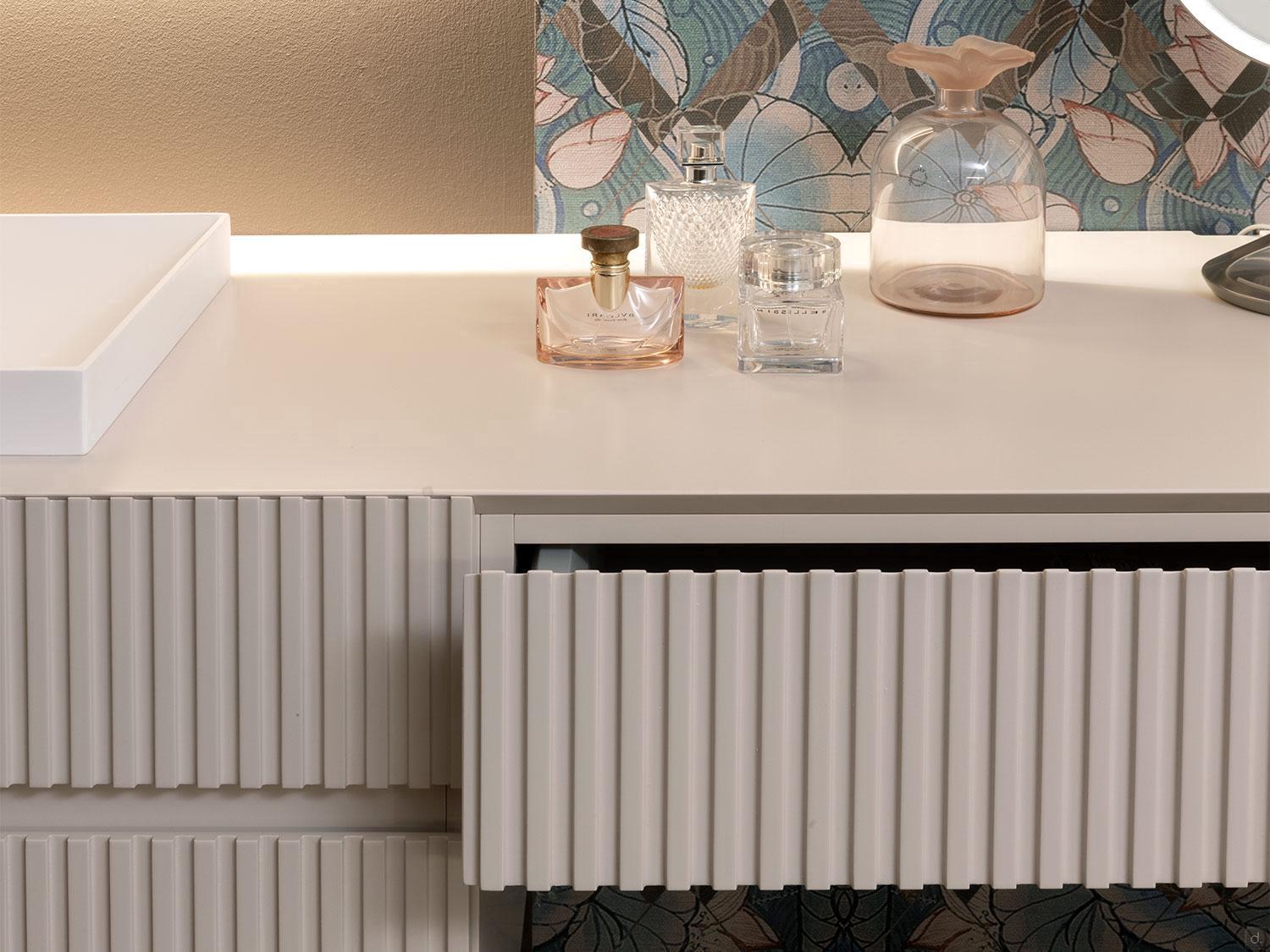 With the exception of the lower edge of the basket fronts, all the others are worked with a 45° cut; in addition to promoting ergonomics when opening, this process allows the perfect match between the fixed front of the base units and the finishing top, which is also made of MDF wood lacquered in the same colour with a 45° cut in the front. The arrangement, the width of which can be managed down to the nearest centimeter ranging from a miniumum of 120 to a maximum of 200 cm, is mounted above an elegant mirror available in two models: with a slatted frame lacquered to match the bases and backlit on all four sides, or totally in glass with a shelf for storage, upper LED spotlight and backlighting on the other sides. Finally, the bathroom furniture can be completed with the addition of an optional dressing table base: made to match the bases of the composition, it is perfectly aligned with the fixed fronts of the same height and can be equipped with a cable slot centrally positioned on the top and bottom.