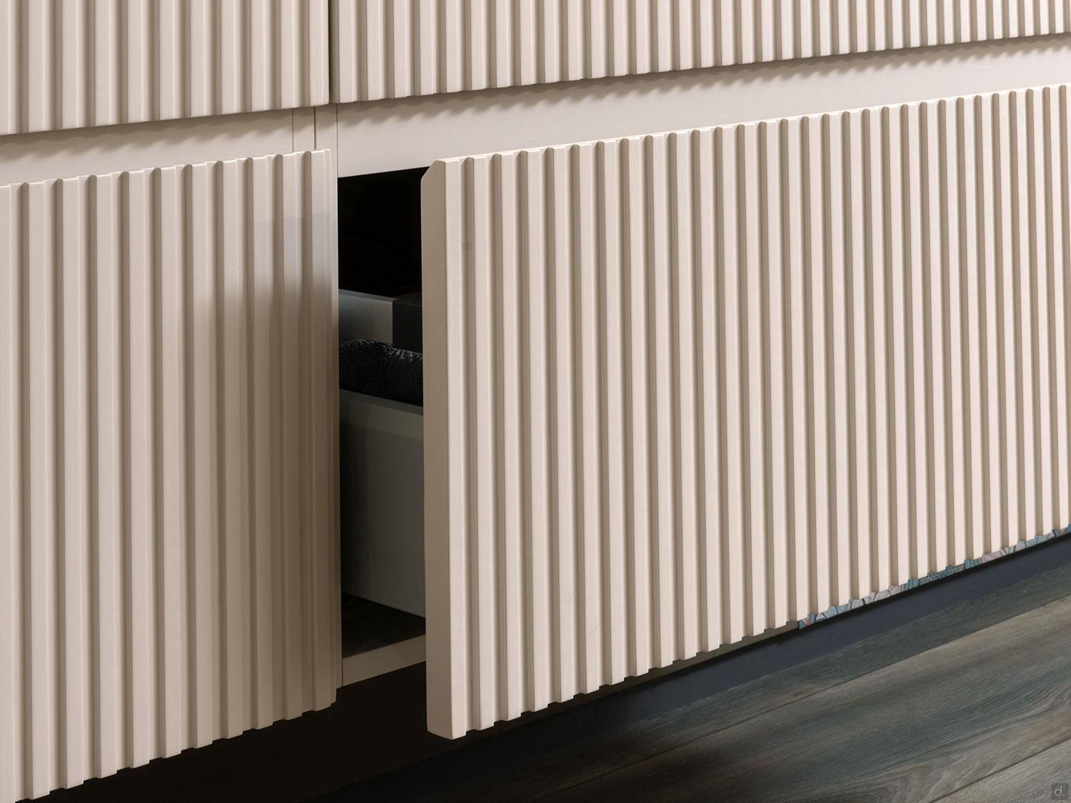 Heritage 02 is a 50 cm deep bathroom cabinet composed of wall-mounted basket bases: the quality and formal refinement of the furniture shines through in the workmanship and attention to detail. The fronts are made of matte lacquered mdf wood in all colours of the RAL or SIKKENS scales and characterized by the special grooving obtained by machine milling. The lower portion of the base units is occupied by the basket, while above it is a fixed front; both go into a horizontal band lacquered in the same colour, allowing the opening of the pull-out elements equipped with soft closing.