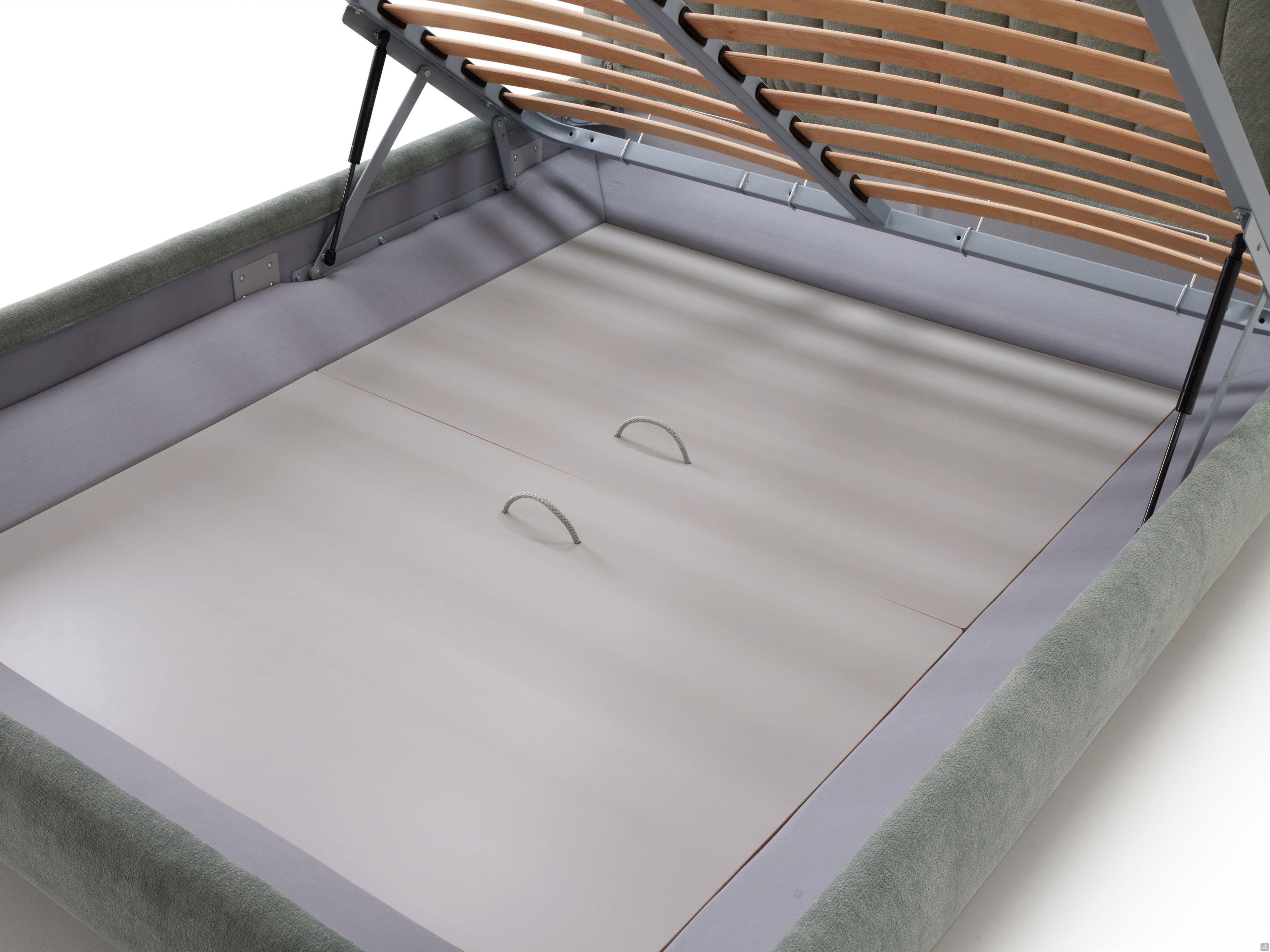 Hidden storage container: Flared edges recessed from the bed frame; internal height of the compartment equal to 14 cm in the central part. Simple lifting system that allows the mattress base to be raised diagonally for an opening angle between 35° and 40°.