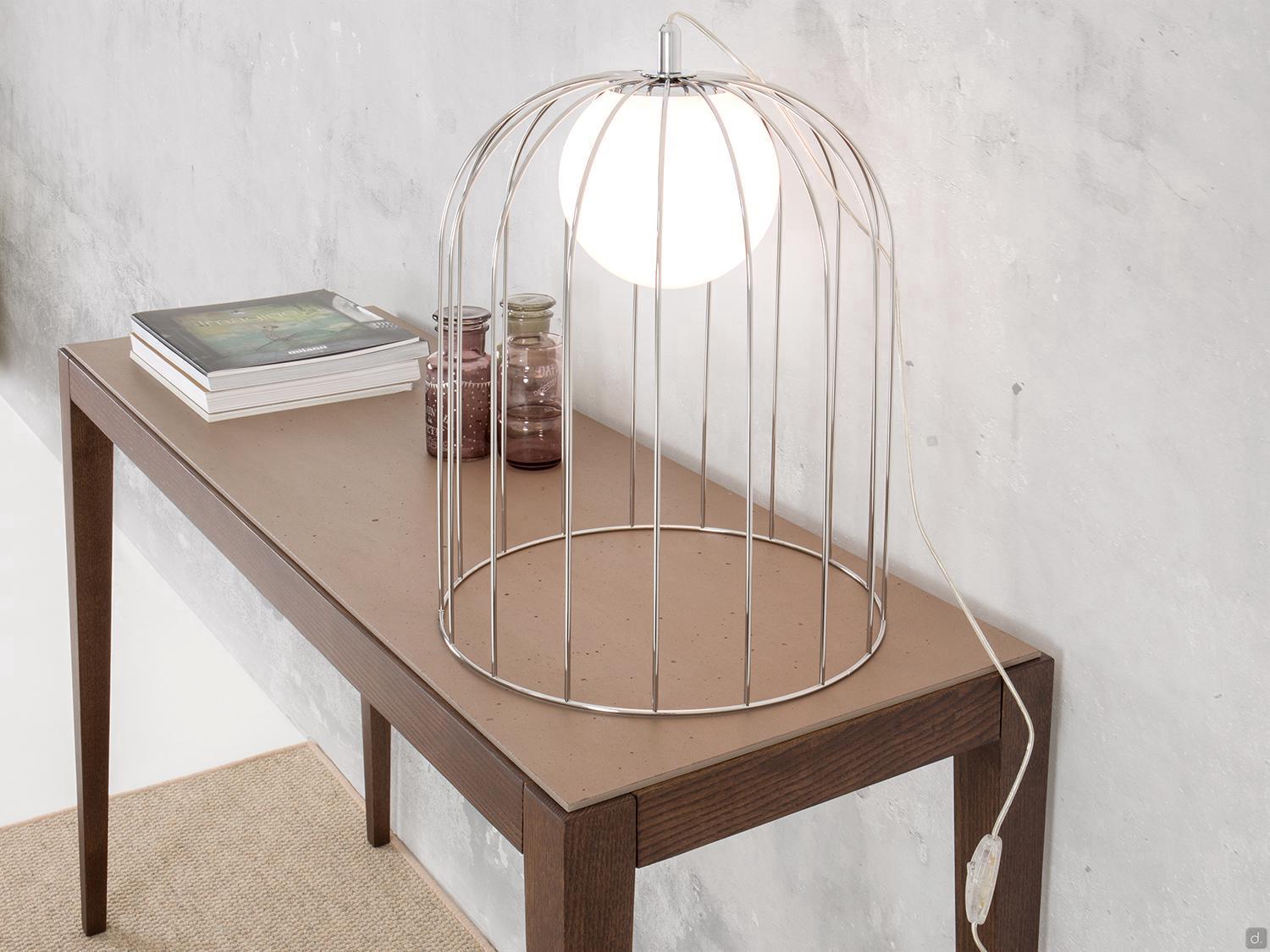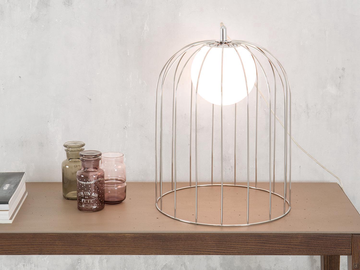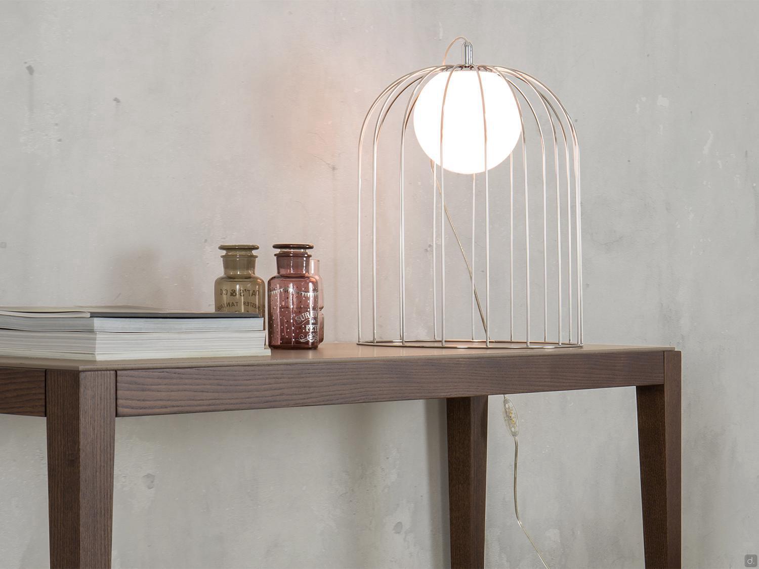 Jengo designer copper lamp is made up of a metal cage and globe blown glass lampshade. The thin metal structure is simple and sleek, and although the cage seems to enclose light, it actually lets the latter out, creating a nice contrast. Jengo is a unique lamp and enhance any room in which it is placed. The cage can be made of chromed metal suiting modern interiors or in the copper version suiting more sophisticate interiors.At the top of the cage, there is a white round blown glass lampshade marked by a refined look.